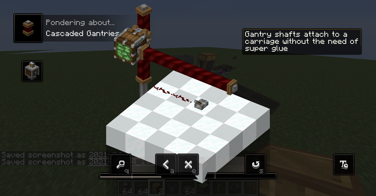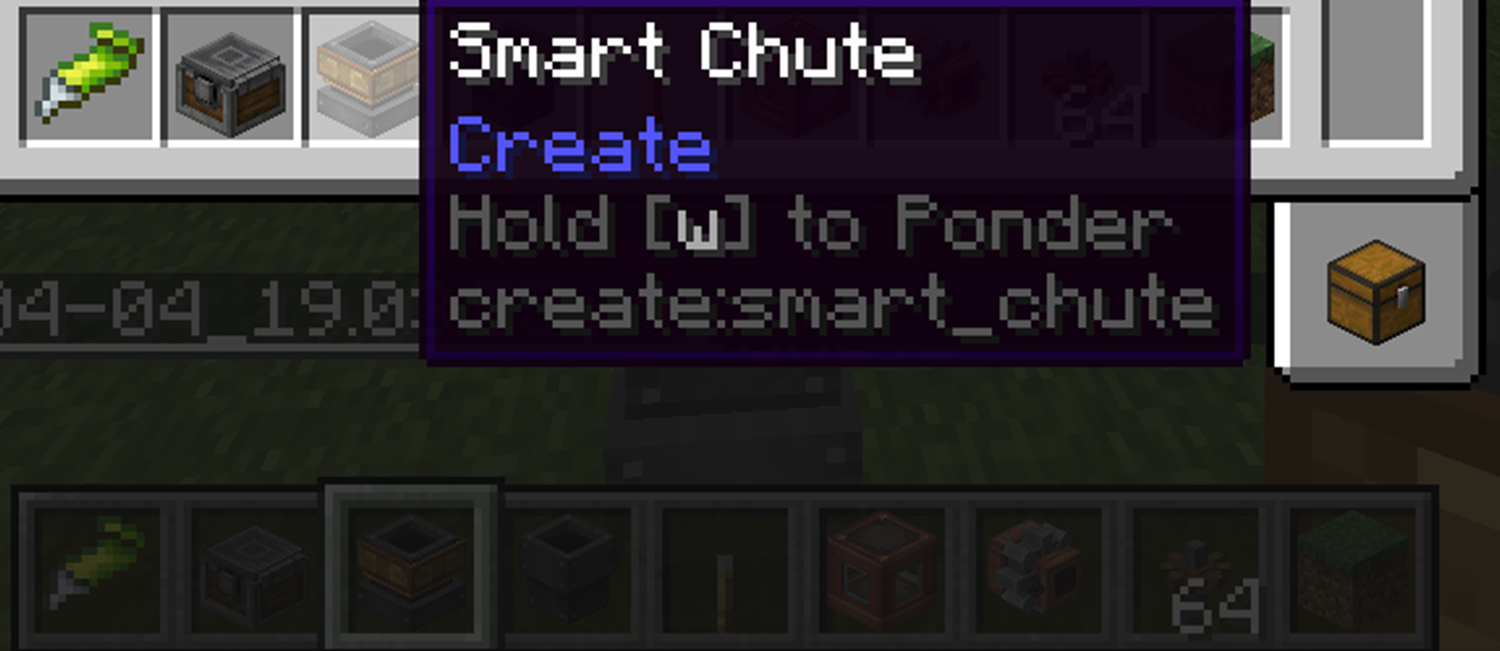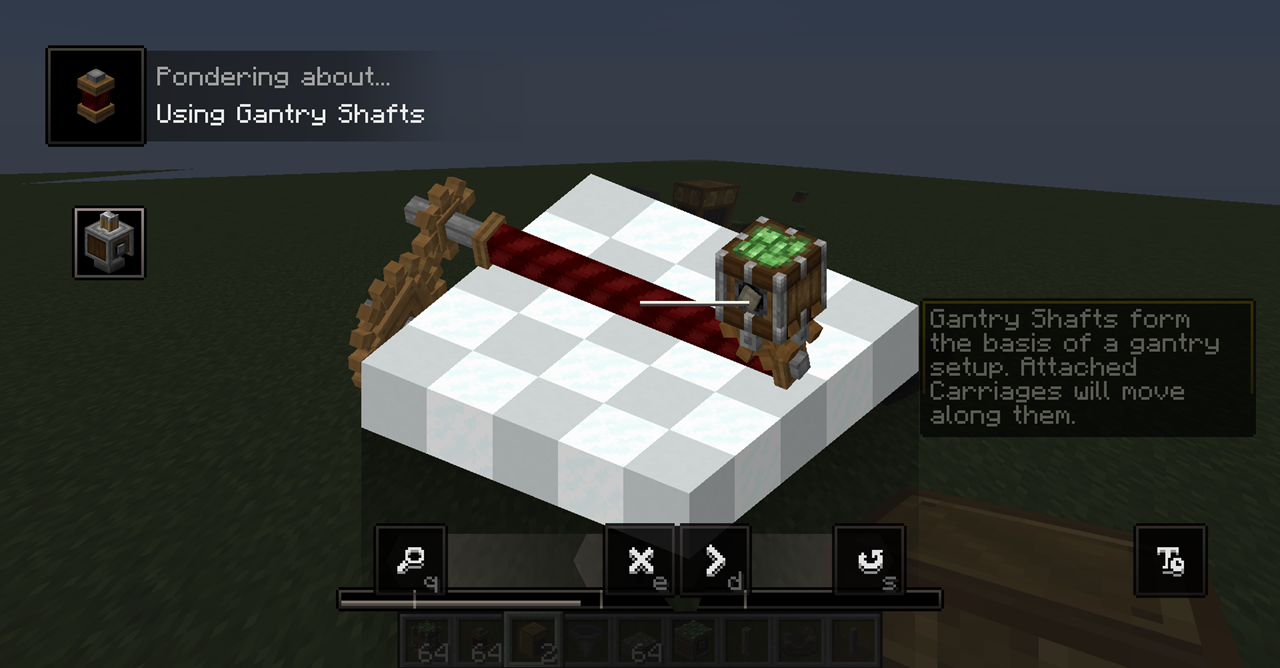 Create 0.3 버전의 큰 차이점 중 하나는 Ponder 기능입니다. 모드의 여러 기능을 직관적으로 설명해줍니다. 전반적인 설명을 보기 위해서는 게임 메뉴에서 왼쪽의 고글 모양을 클릭한 뒤, Ponder Index를 누르면 됩니다.