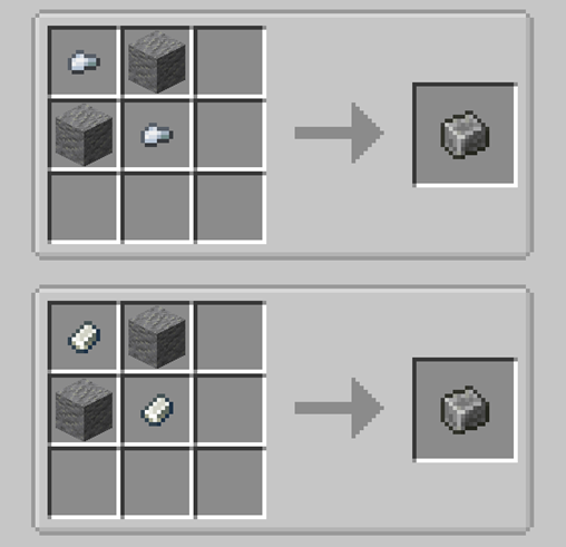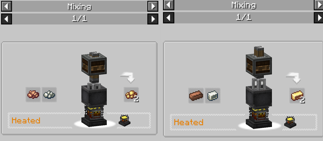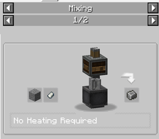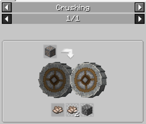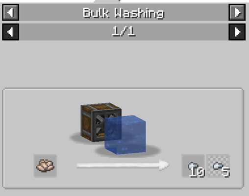 해석의 편이를 위해 하나만 예를 들어보자면, Crafting 중 혼합하거나, 부수는 등의 형태가 정해지지 않은 조합법은 Mixing으로, 주괴를 블럭으로 만드는 등의 조합법들은 Compacting으로, 물 양동이를 섞는 조합법은 Bulk Washing으로 들어가는 식으로 나뉘어지게 됩니다. 그렇다고 1대1로 대응이 되거나 완전한 부분집합 관계인 것은 아닙니다. Bulk Washing의 경우 Crushed Ore을 광물 너겟으로 변환하는 등의 조합법을 포함합니다.