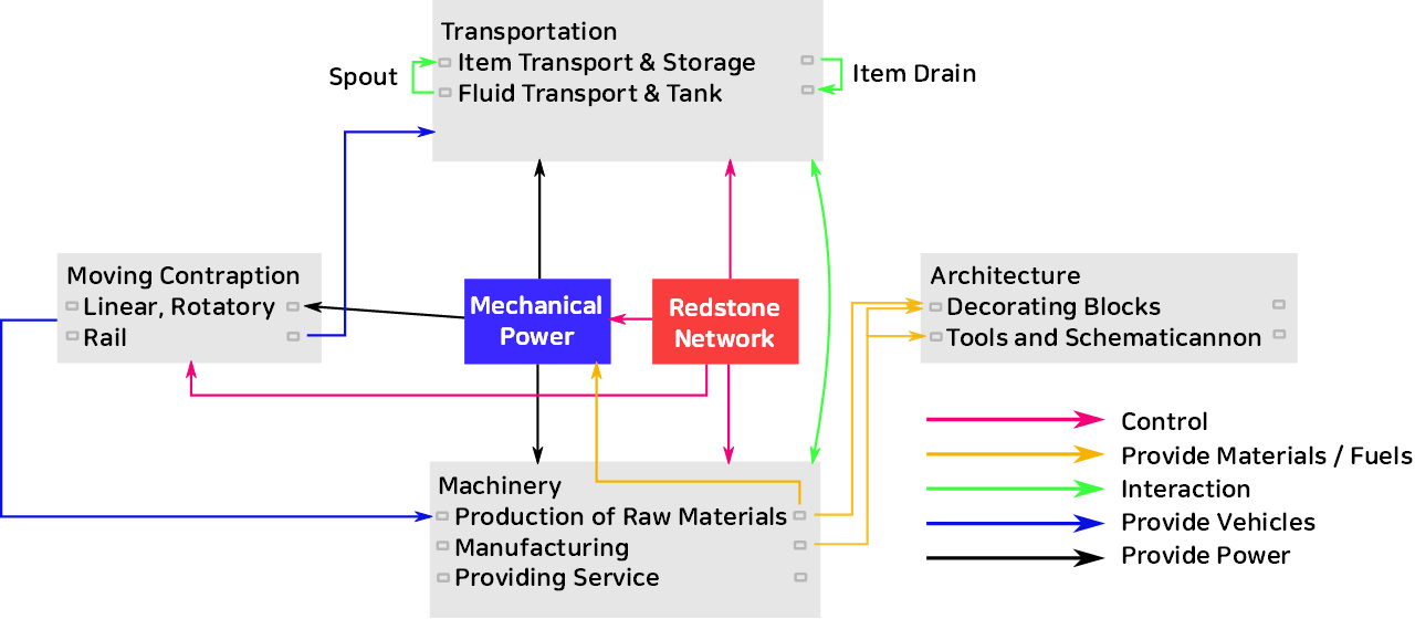아래 도표는 Create 0.3의 다양한 주제들이 어떻게 얽혀있는지 보여줍니다. (자세한 내용은 알 필요가 없습니다. 앞으로 소개할 내용에 대한 스포일러 정도이므로 큰 의미 없습니다.) 보시다시피 동력은 단순히 물류 뿐만 아니라 나무를 베고, 광물을 캐며, 아이템을 가공하는 모든 과정의 중심에 위치합니다. 그렇기에 먼저 동력 시스템에 대해 이해하는 것이 중요합니다.