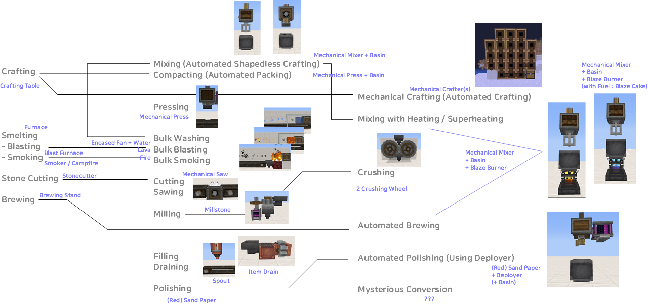 마지막으로, 가장 아래의 Machinery는 다양한 기계 장치들이 들어가는 영역입니다. 이 부분은 자연에서 아이템을 채굴하고, 채취하는 1차 산업적 요소, 이를 가공하는 2차 산업적 요소로 나누어볼 수 있습니다. 물론, 뻐꾸기 시계처럼 동력을 소모해서 시간을 알려주는 등 생산, 가공과 무관한 장치도 존재합니다. 이 글에서는 생산과 가공과 관련된 부분에 대해서 전체적인 흐름 정도만 소개할 예정이며, 이후 글에서 자세한 사항들을 확인하실 수 있을겁니다. (아니면 이전의 Create 0.2 글을 보아도 상관없지만, 상당한 부분이 바뀌었습니다.)