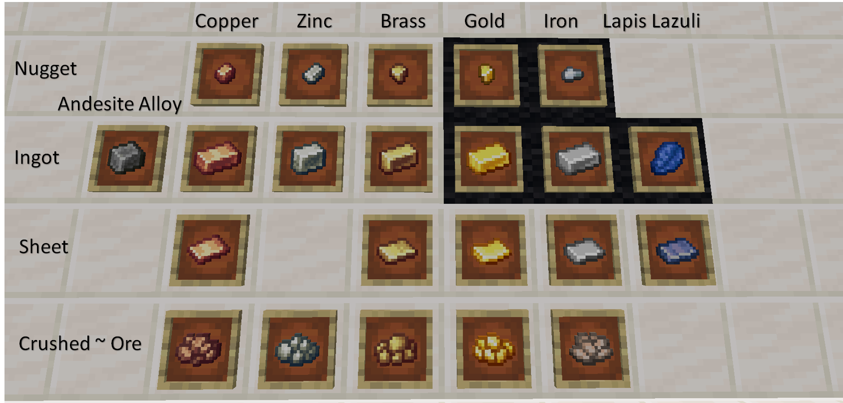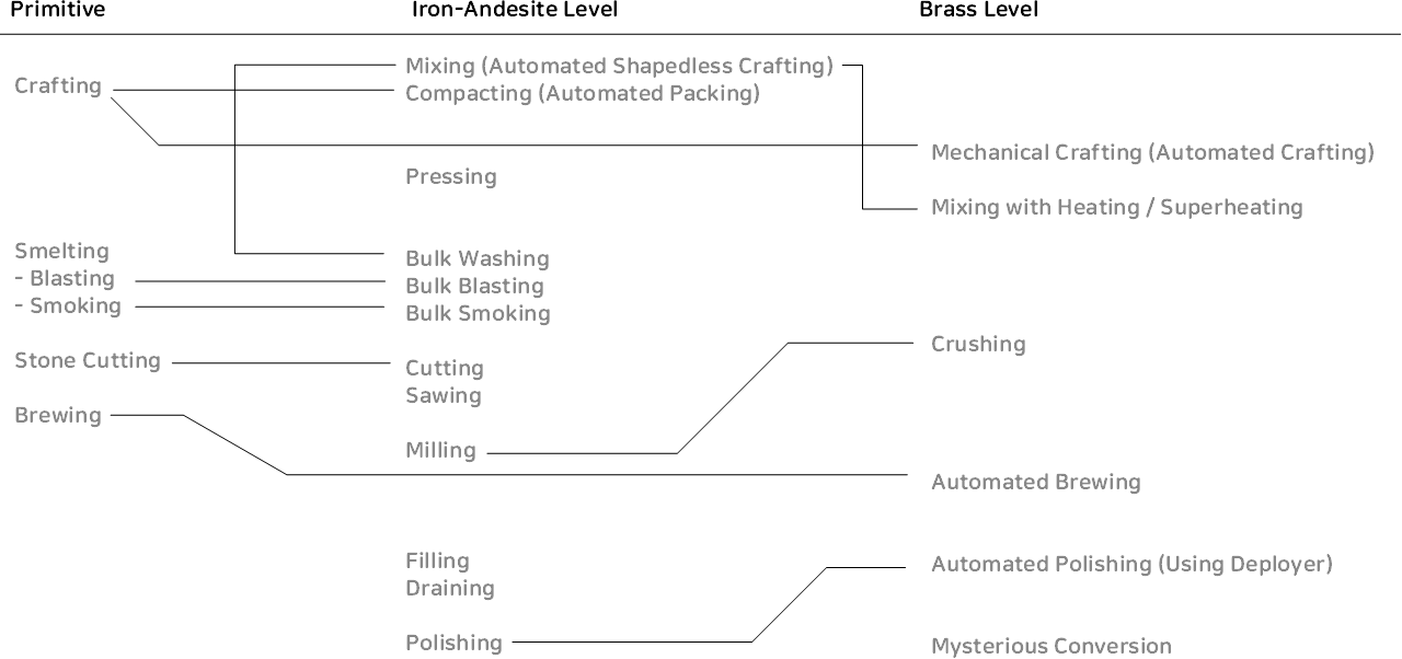 Iron-Andesite Level과 Brass Level은 장치 제작 과정에서 황동의 필요 여부에 따라 분류하였으며, Primitive는 원래 존재하던 조합 방식들입니다.