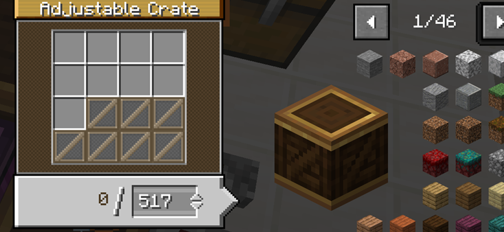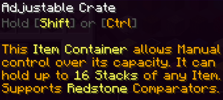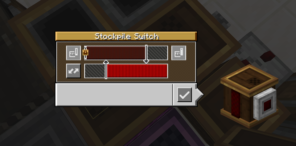 용량을 조절 가능한 Crate와 상자 등의 Container의 용량을 감지하는 Stockpile Switch입니다. Adjustable Crate의 경우 비교기를 통해 용량에 대한 정보를 알 수 있습니다. 둘 모두 우클릭으로 내부 GUI를 확인할 수 있습니다. Stockpile Switch의 경우 흰색 부분이 점검할 상자를 향하게 하면 되는 데, ~이상 ~이하 일 때 레드스톤 신호를 발생시키게 할 수 있습니다. 그 조건을 Invert 시키는 기능도 추가되었습니다. 자세한 사용 방법은 간단하므로 생략하겠습니다.