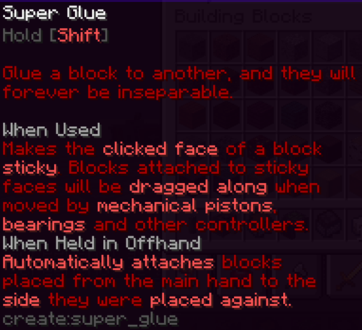 모든 블럭에 적용할 수 있는 Super Glue를 사용할 수도 있습니다. 해당 블럭의 면에 적용하고 설치하면 됩니다. 하지만, 이렇게 한다고 해서 옮길 수 없는 블럭 (ex: 베드락 등)을 옮길 수 있는 것은 아닙니다. 제거하려면 왼쪽 클릭을 하면 됩니다.