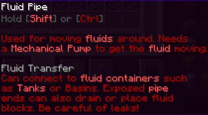 유체 파이프, 유체 펌프, 유체 탱크 (+ 크리에이티브 유체 탱크). 이 세 가지는 유체 시스템을 구성하는 핵심 구성요소입니다. 직관적인 Create의 시스템답게, 파이프는 서로 연결되어 유체가 지나갈 수 있게 하며, 펌프는 유체 파이프 사이에 들어가서 유체를 탱크 등의 저장소로 부터 뽑아오거나, 아니면 월드에 놓여있는 유체를 빨아들이기 위해서 (혹은 월드에 배출하기 위해) 사용됩니다.