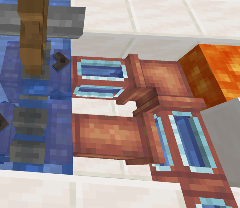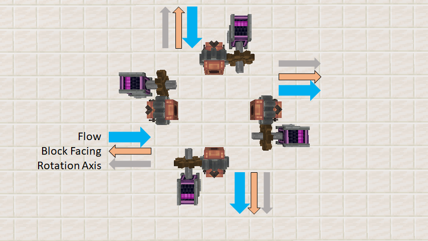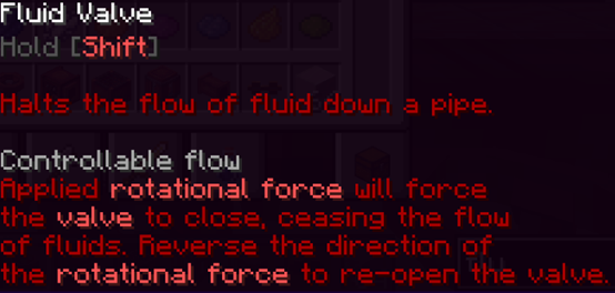 회전축 방향이 +x,+y,+z이면 돌아가서 밸브를 열고, 반대로 돌리면 잠구는 Fluid Valve 블럭도 있습니다. 다른 방식으로 돌릴 수도 있지만, Copper Valve Handle로 돌릴 수도 있습니다. 회전 방향은 그냥 우클릭으로 돌리면 회전축 방향이 바라보는 방향이 되도록 움직이며, Shift+우클릭을 하면 그 반대가 됩니다. 한번 짧게 클릭하면 45도만 돌아가며 이 상태의 경우 이전 상태와 같은 상태로 인식됩니다.
