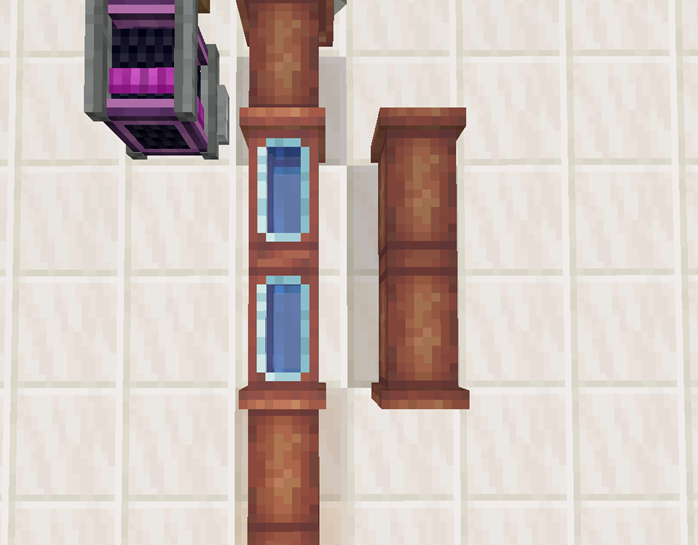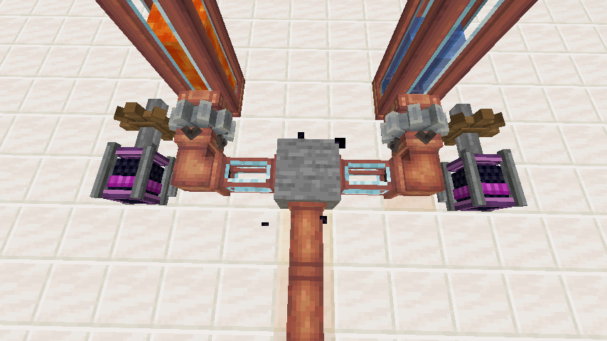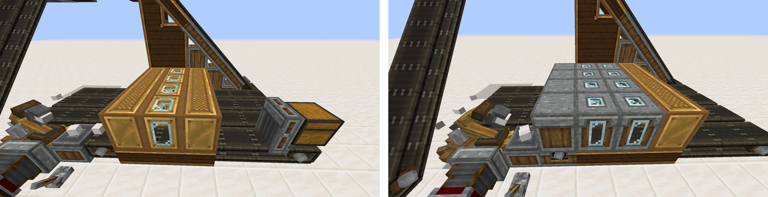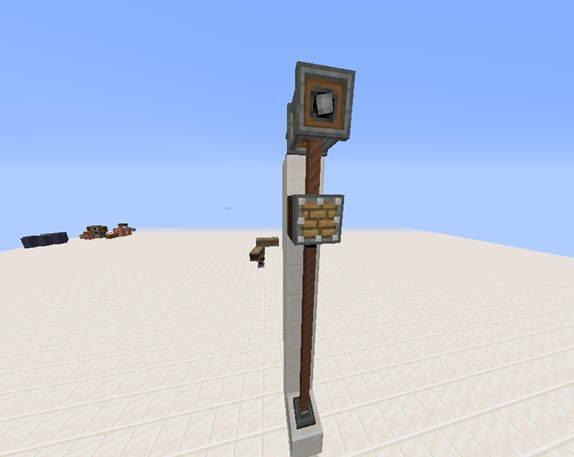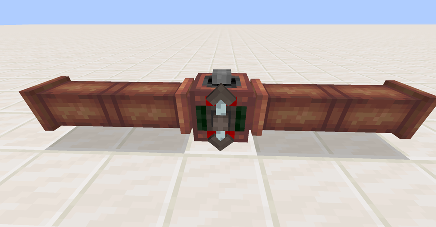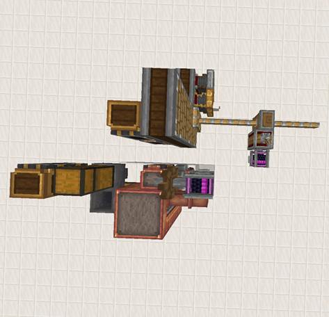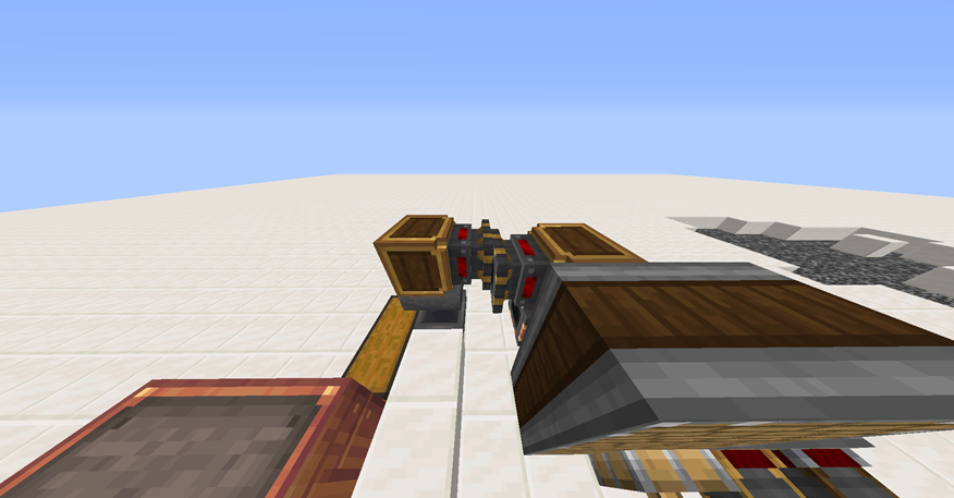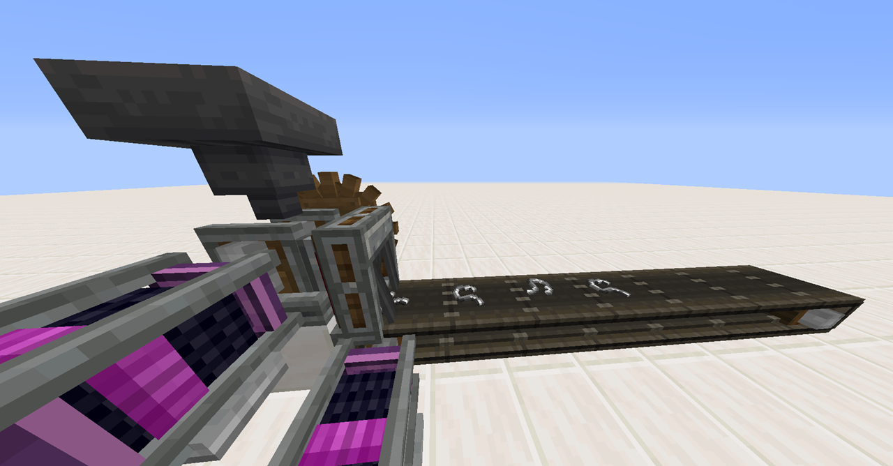 레드스톤 신호가 공급되면 이동을 멈추는데, 이 때 이동중이던 Carriage 측면의 축이 보이는 면에 연결된 Gantry Shaft에 연결된 또 다른 Carriage가 이동하게 됩니다.