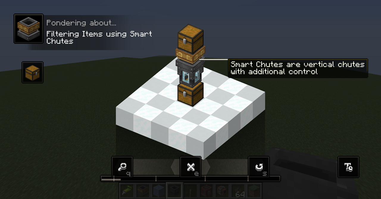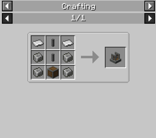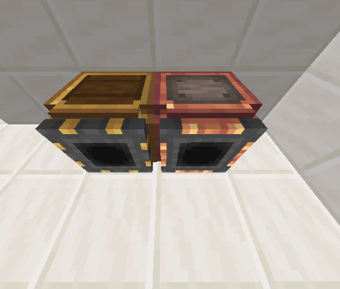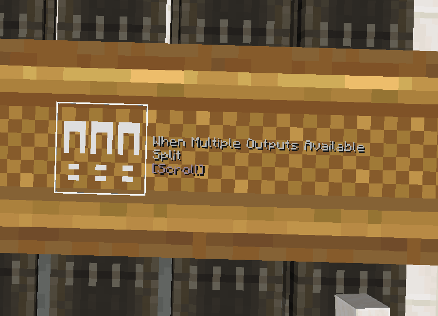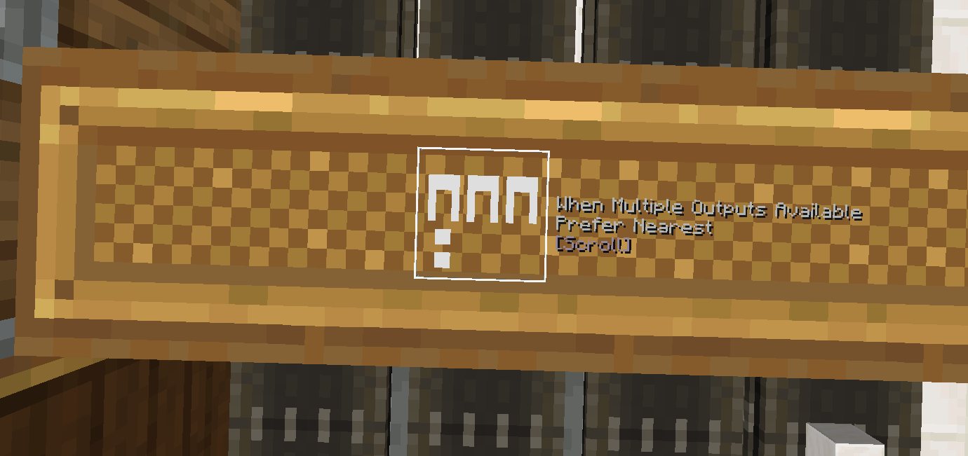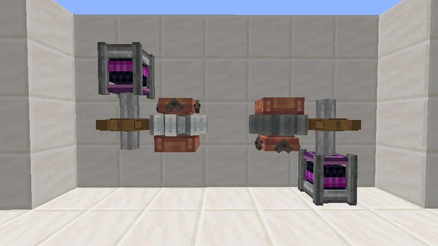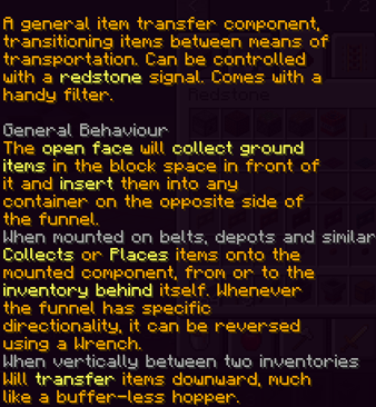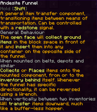 Andesite와 Brass Funnel이 존재하는 데, 후자의 경우 필터 기능이 추가되었습니다. 아이템을 들고 블럭의 필터란에 우클릭하여 설정하며, 해당 칸에 초점을 두고 스크롤을 하여 수량을 조절할 수 있습니다. (x는 수량에 관계없이 가져온다는 의미입니다.) 후술할 필터를 필터칸에 장착하여 좀 더 복잡한 조정을 할 수 있습니다.