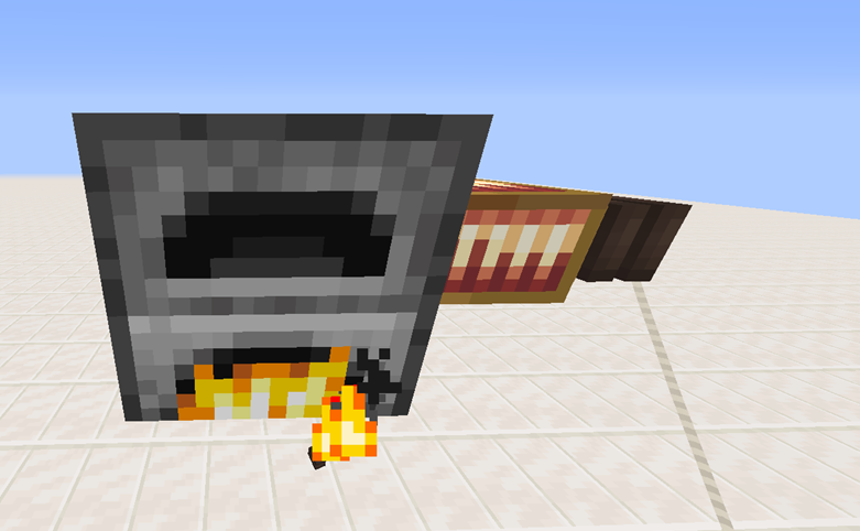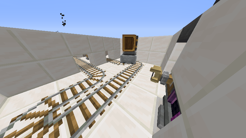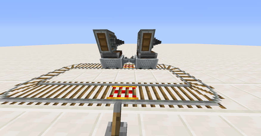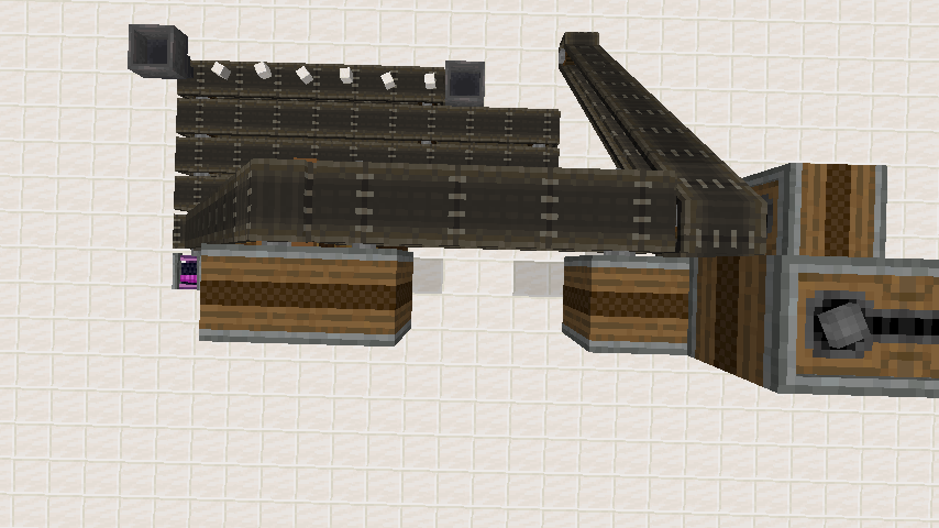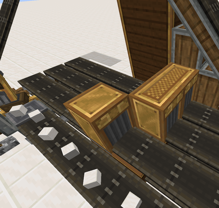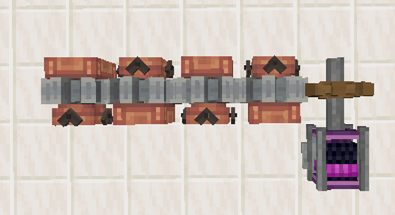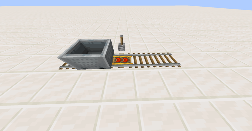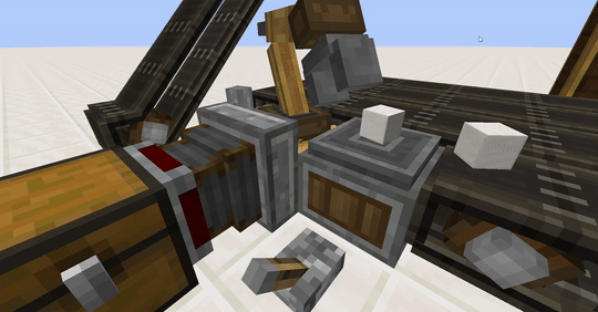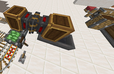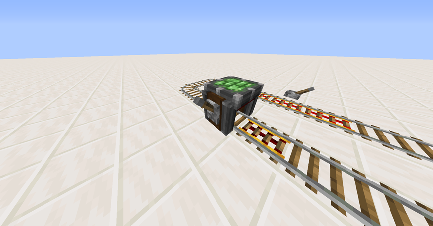움직이는 구조물에 장치를 설치하는 것과는 거리가 멀지만 화로 카트를 이용하는 팁 하나를 더하자면, 구조물을 탑재한 혹은 그런 카트와 연결된 화로 카트를 가지고 자동으로 화물을 수송해야 할 때, 다음과 같이 화로 카트에 Deployer로 석탄 등의 연료를 공급할 수 있습니다. 이 때, 방향을 제어할 수 있는 레일을 같이 사용하면, 자동으로 움직이고 정차하는 기차 시스템을 만들 수 있습니다.