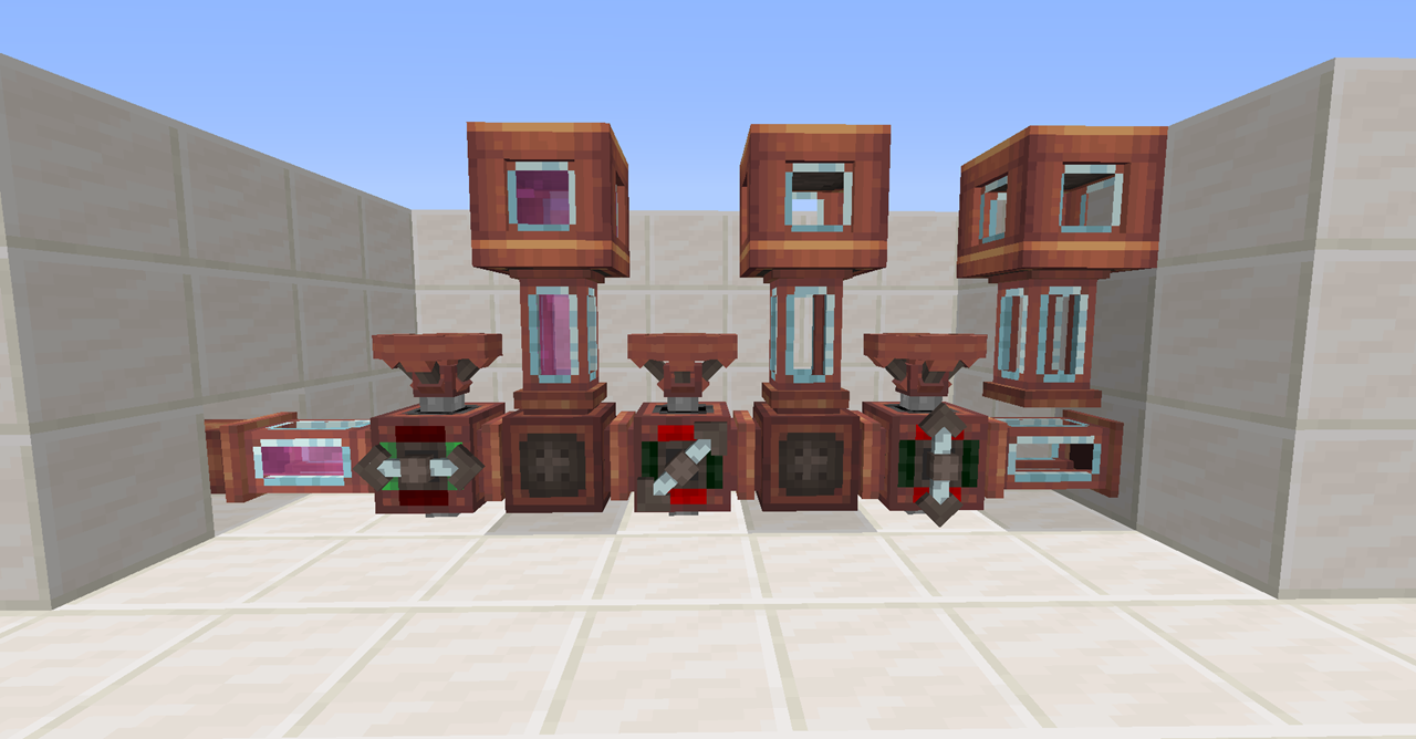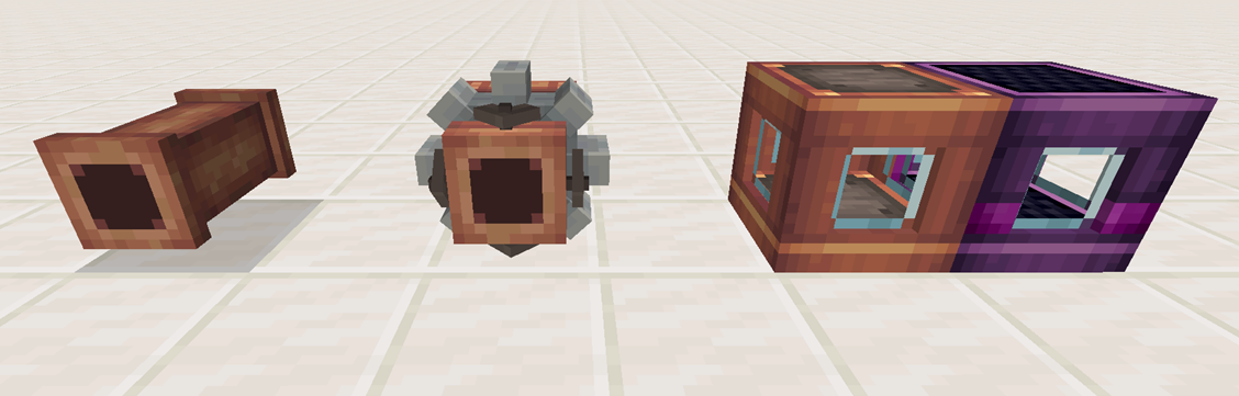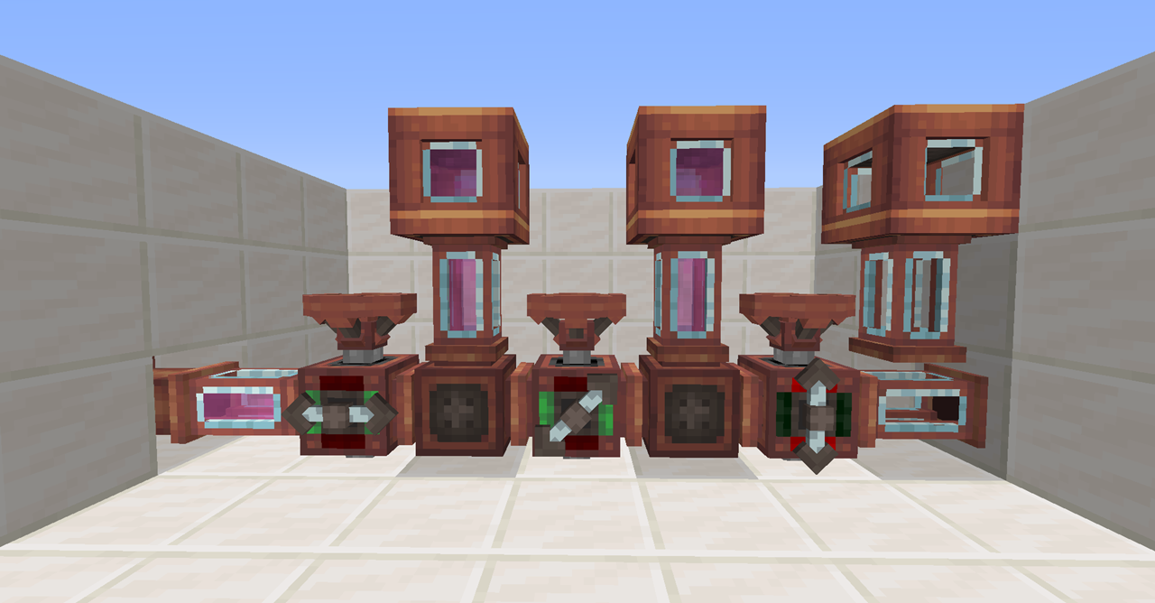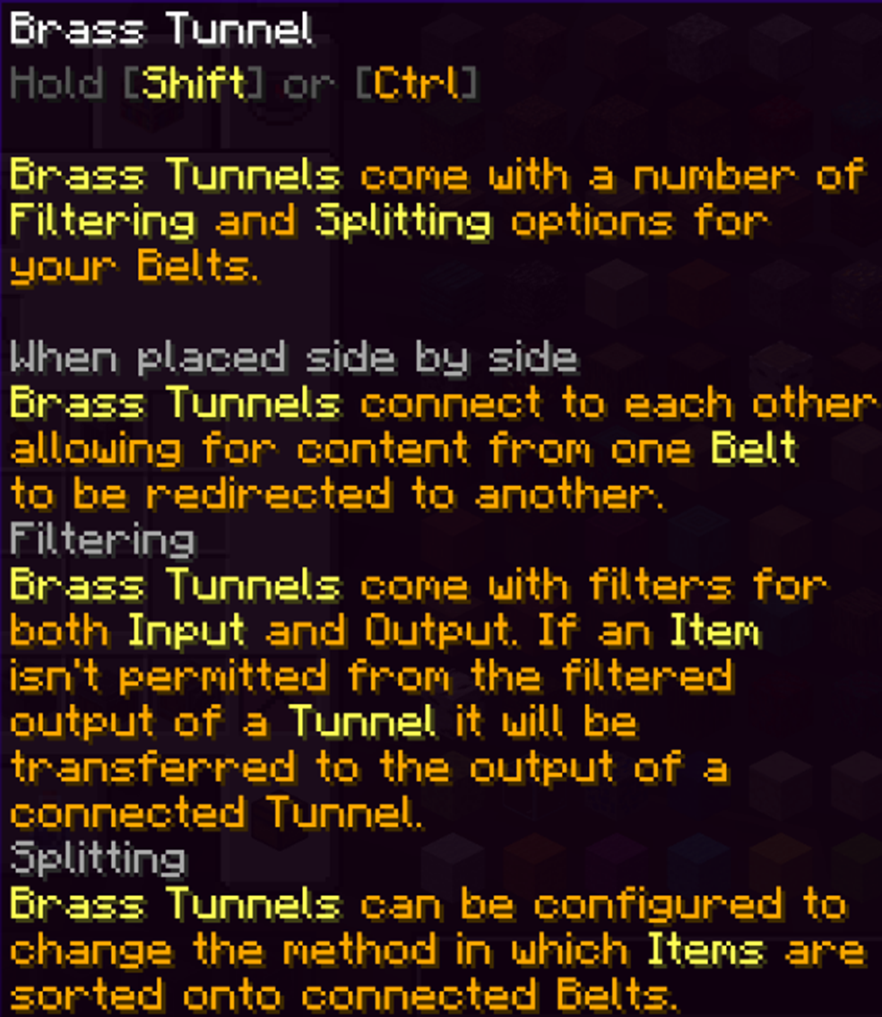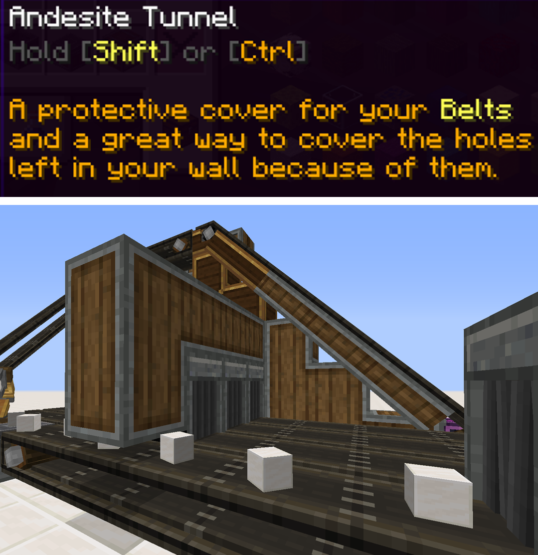벨트 위에 설치하며 아이템을 직접 수송하는 블럭은 아닙니다. Andesite Tunnel의 경우 단순히 벨트를 벽 사이로 집어넣을 때, 틈 없이 덮기 위해 사용됩니다. Brass Tunnel의 경우 가운데 그림과 같이 서로 연결되는 특성이 있으며, 이와 함께 여러가지 설정을 통해 수송을 제어할 수 있습니다.