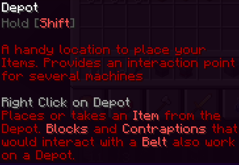 참고로 Depot에는 수동으로 아이템을 올리거나 가져올 수 있지만, 주로 벨트와 같이 사용되어 아이템의 가공 등을 위해 사용됩니다. (EX : 액체를 Bucket에 담아서 하나하나 옮기는 경우)