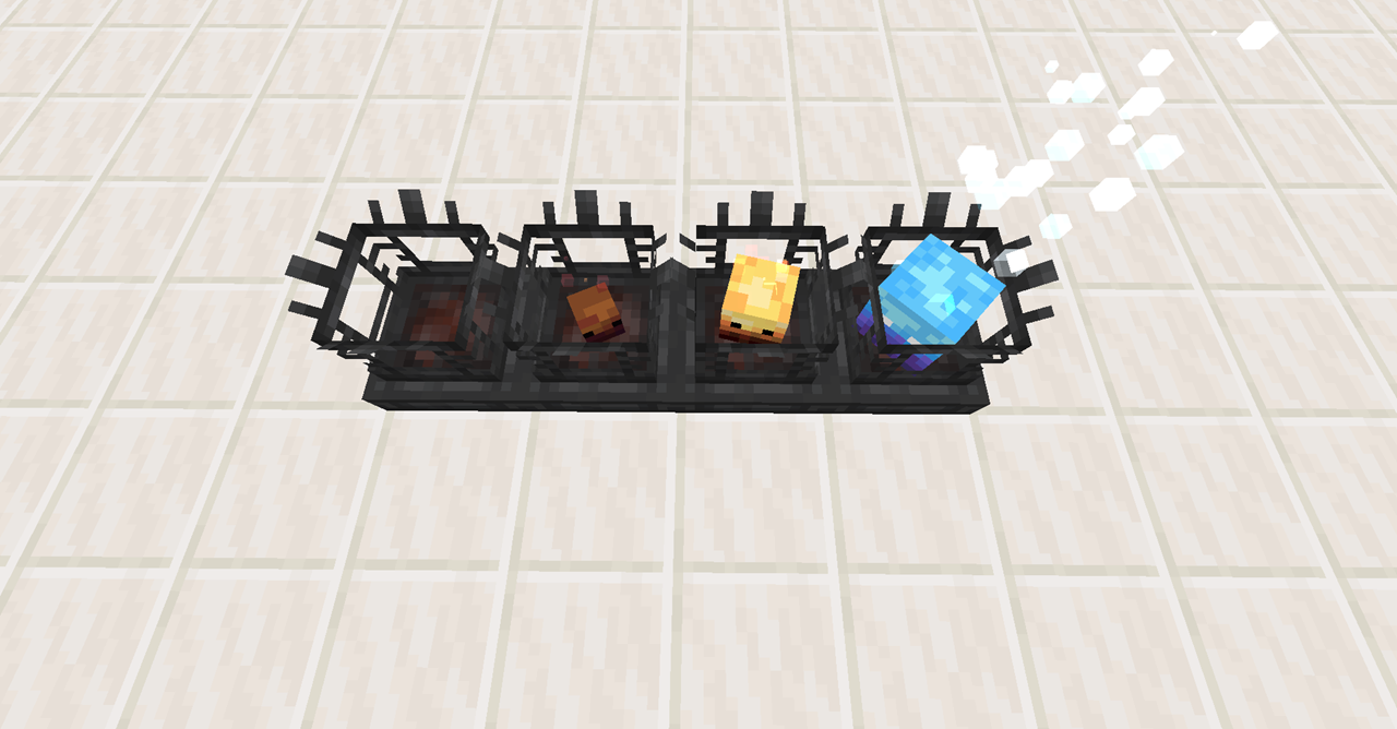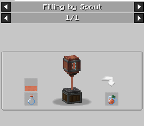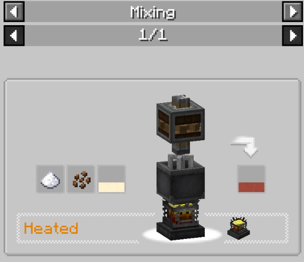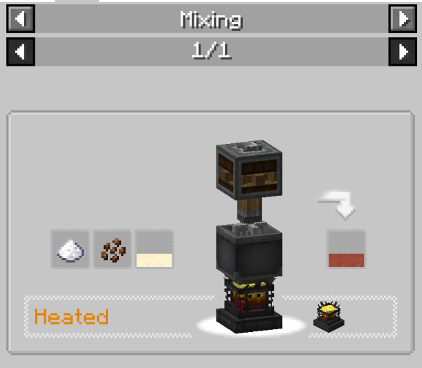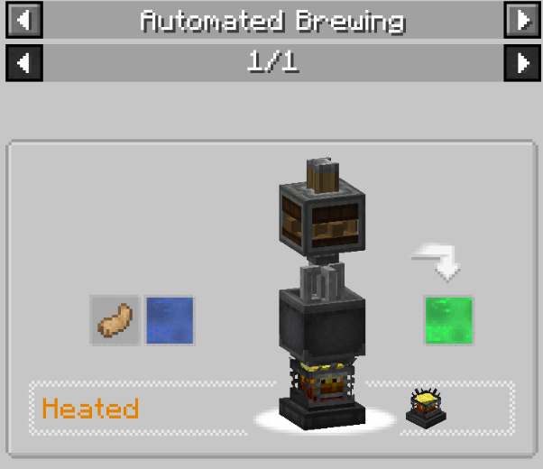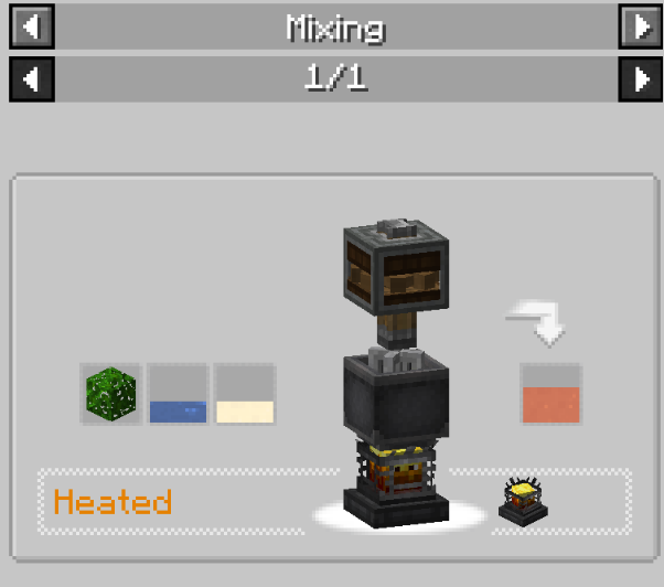 Heating상태에서는 다음과 같이 포션을 증류할 수 있습니다. 전 버전과는 다르게 Basin이 이제 액체를 담을 수 있기에, 유체와 아이템을 같이 공급하고 조건을 맞춰주면 조합이 됩니다. 또한, Brass 조합 등이 가능합니다. Brass 조합을 위해서 블레이즈 막대를 촉매로 사용하던 기존의 방식은 이제 더이상 사용할 수 없게 되었습니다.