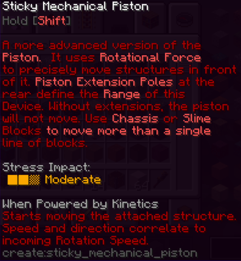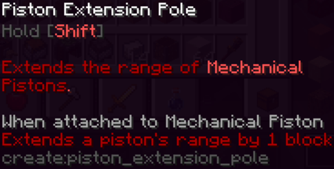 (Sticky) Mechanical Piston과 Piston Extension Pole을 이용해 한 칸 이상 블럭을 밀 수 있습니다. Extension Pole이 연결될 수 있는 64블럭이 기본 설정상 한계입니다.