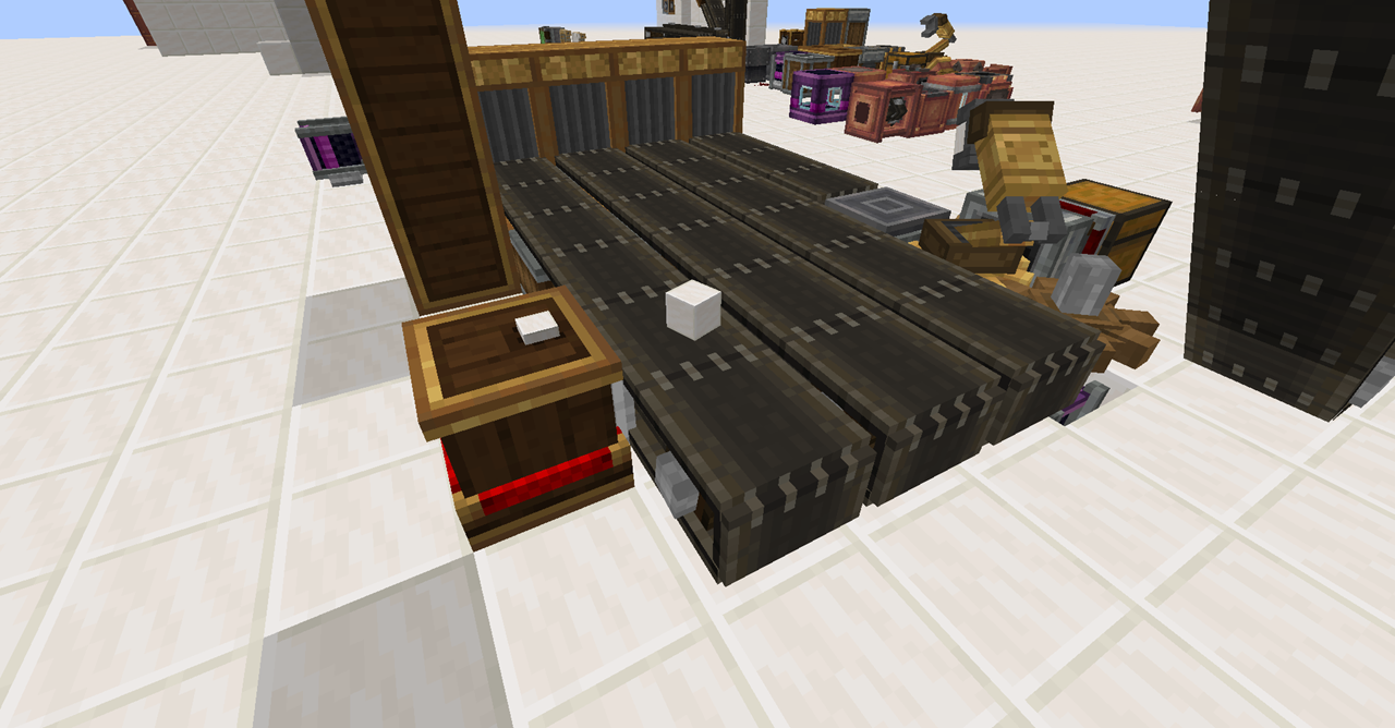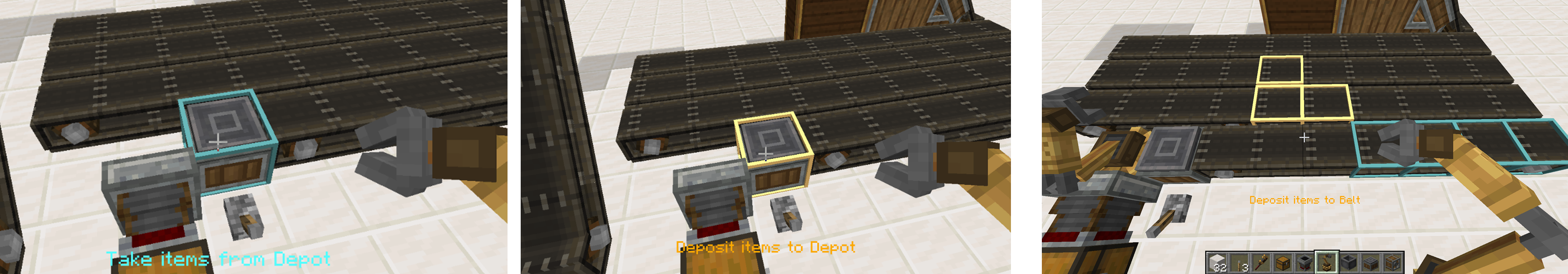 아이템을 하나하나 옮겨주는 장치입니다. 주로 Depot(왼쪽 GIF에서 벨트와 바로 연결된 블럭)과 같이 사용하여 위와 같이 아이템을 하나하나 옮겨야 할 때 사용됩니다. 옆에서 동력을 공급하여야 작동하며, 어느 블럭에서 가져와 어디에 놓을지는 설치 전 아이템 상태에서 우클릭으로 선택합니다. 한 번 누르면 가져오는 블럭, 두 번 누르면 놓을 블럭으로 설정되며, 여러 블럭을 설정할 수도 있습니다.