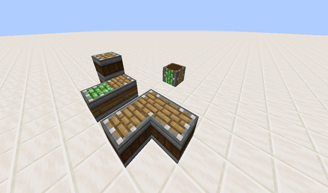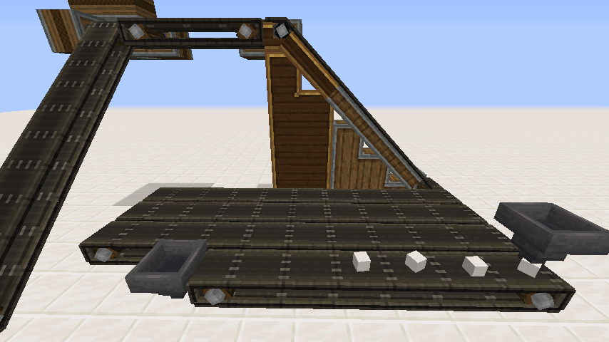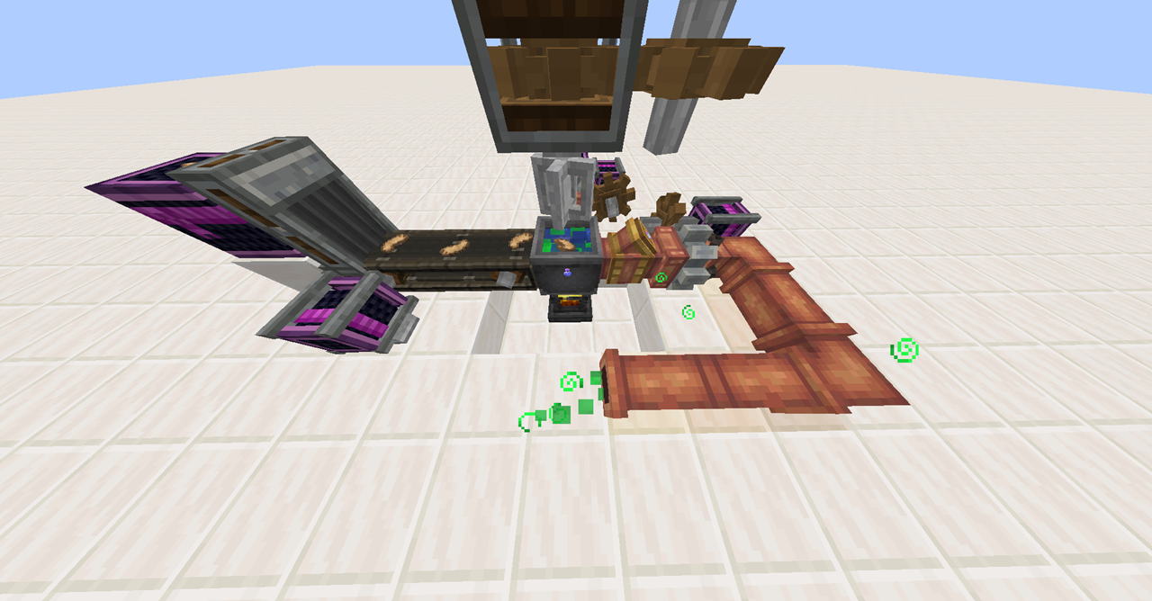 이전에 다룬 것처럼 그냥 벨트입니다. 바닐라 깔대기(Hopper)나 Create 깔대기(Funnel)를 활용하여 다음과 같이 구성할 수 있습니다.