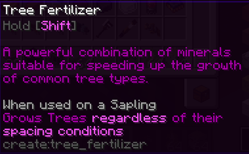 Tree Fertilizer 아이템은 묘목을 주변 여유 공간 크기에 상관없이 묘목을 빠르게 키우기 위해서 사용됩니다. 나무 농장에 사용할 수도 있지만, 보통은 굳이 그 정도로 필요하지는 않아서 잘 사용되지 않는 아이템입니다.