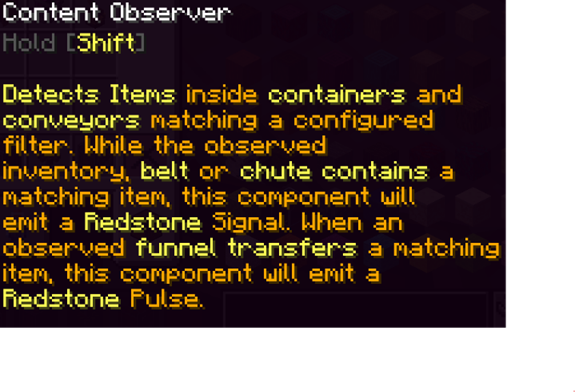 Belt Observer를 단순화시킨 버전입니다. 필터에 등록된 아이템을 감지해서 레드스톤 신호 펄스를 보냅니다. 기존의 분류 등을 Tunnel 등으로 해결할 수 있어서 단순화시킨 것 같습니다.