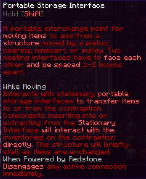 움직이는 구조물 내부에 존재하는 모든 상자 들은 모두 하나로 관리됩니다. 그 사이에 우선순위가 있기는 하지만, 하나가 차면 그 다음 상자로 넘어갑니다. 이 내부 인벤토리와 외부의 고정된 상자 사이에 상호작용을 하기 위해서는 Portable Storage Interface가 필요합니다. 또한, 액체의 경우도 내부 액체 저장소와 외부의 탱크 등과 상호작용을 하기 위한 Portable Fluid Interface가 존재합니다.