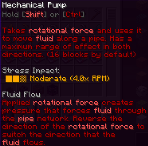 펌프가 작동하면 유체가 파이프마다 움직이며 운송됩니다. 펌프의 작동범위는 아래와 같이 16블럭입니다. (펌프 포함, 양쪽은 별개로) 펌프 작동 속도는 옆으로 공급되는 동력의 회전 속력과 관련이 있으며, 작동 범위와는 무관합니다. 펌프에서 유체를 관리하기에, 펌프에 유체가 지나가는 상태가 아니면 연결된 모든 파이프에 유체가 사라집니다.