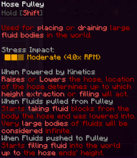 Hose Pulley는 일정 구역에서 유체를 빼내거나, 일정 구역에 채울 때 사용됩니다. 4.0 SU/RPM의 Stress Impact값을 가집니다. 10,000 블럭 이상이라면, 무한대로 인식하여 그냥 뽑아내기만 합니다. 그렇지 않다면 가장 위의 가장자리부터 뽑아내고, 채우는 경우에는 가까운 쪽 바닥부터 채웁니다.