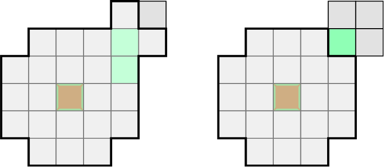 렌치를 들고 있으면 해당 적용범위도 확인해볼 수 있습니다. 모양이 불규칙해 보이는 것은 특정 면에만 Slime Ball을 적용했기 때문입니다. 아래 왼쪽 그림으로 예시를 들어보자면, 반경 내에 있어도 Sticky한 면과 연결되지 않은 부분은 선택되지 않습니다.