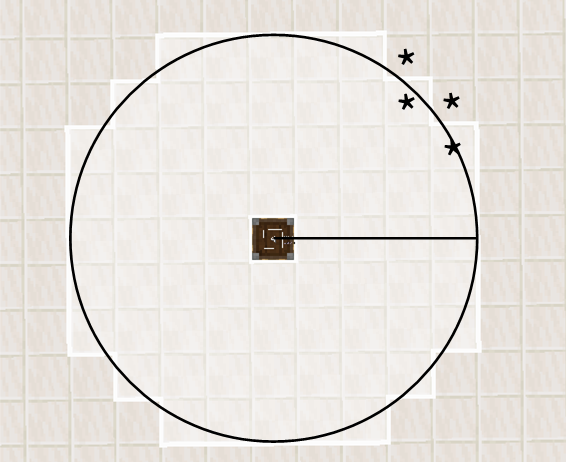 슬라임 블럭이나 꿀 블럭으로도 연결할 수 있습니다. 다만, 기존 범위 내에 슬라임 블럭이 포함되어야만 연결됩니다. 가운데 그림을 보시면 이해하실 수 있을겁니다. (Radius = 2라고 생각하면 됩니다.) 반경 계산의 경우 중심점에서 R+0.5 블럭 반경의 원을 그려서 중심점이 포함되는 블럭만을 연결한다고 생각하시면 됩니다. (*표시는 일부 블럭의 중심 지점을 나타냅니다.)