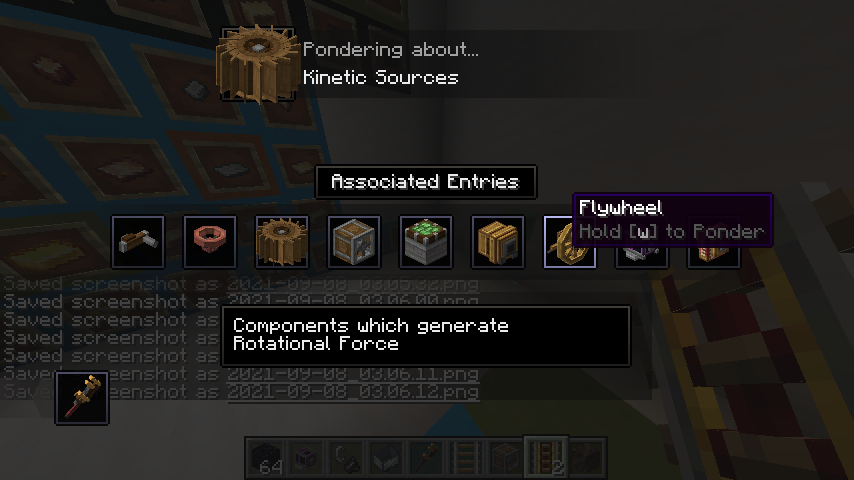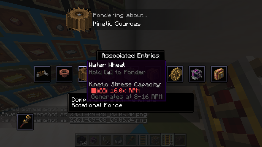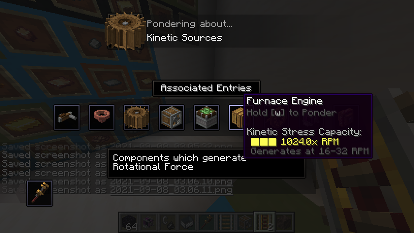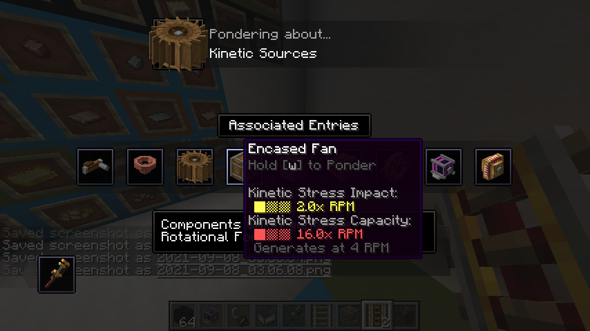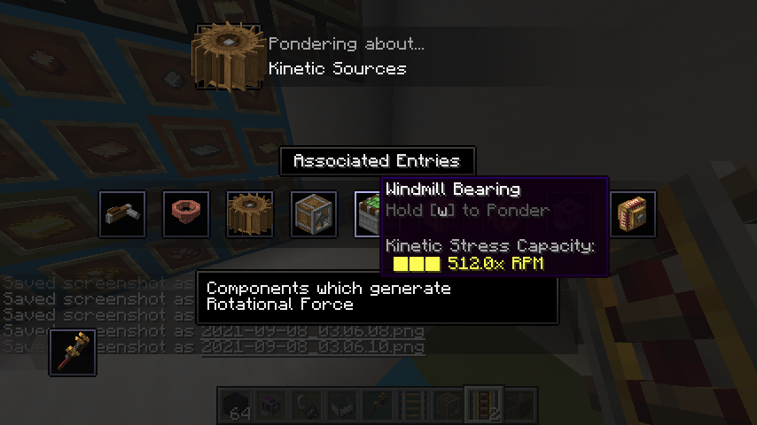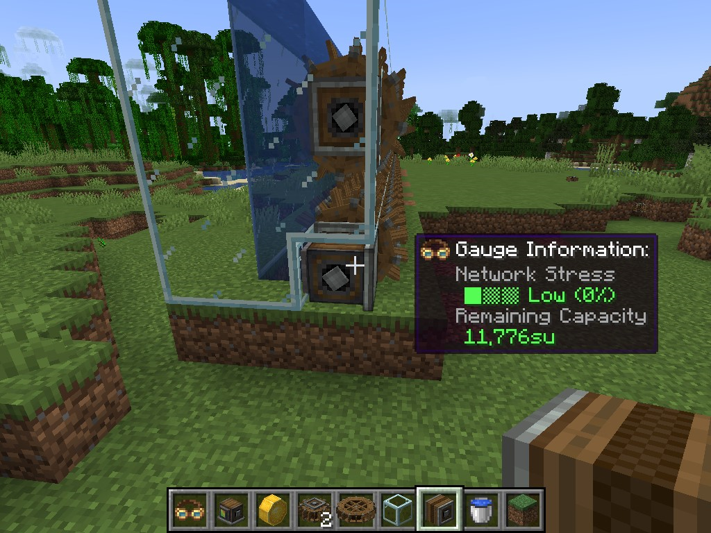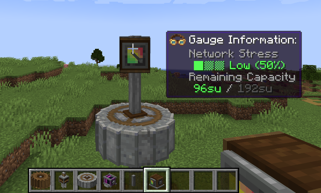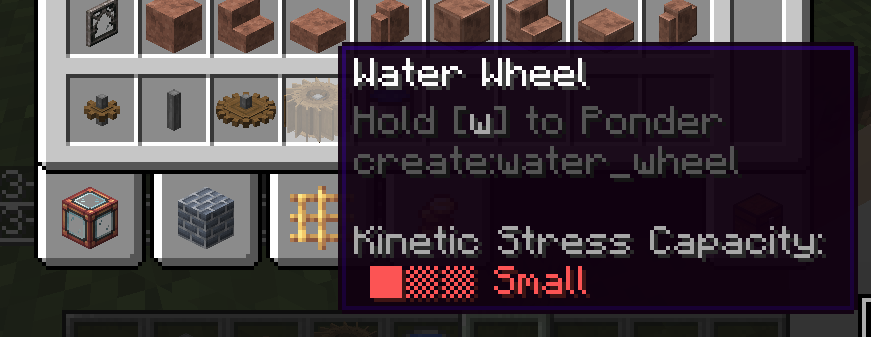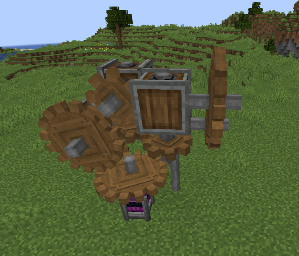 Create 모드의 동력 전달 및 제어는 상당히 직관적인 편입니다. 기어, 축, 벨트 모두 우리가 생각하는 방식대로 작동합니다. 그 외의 블록들도 Ponder 화면에서 그 사용법을 확인하실 수 있으므로 사용법 정도는 생략하겠습니다. 각 장치가 소모하는 동력 부하 수치들도 Goggle을 끼거나, tooltip (마우스를 아이템 위에 올릴 때 표시되는 설명들)에서 Shift 키를 눌러서 확인할 수 있는 경우가 많기에 생략하고자 합니다.