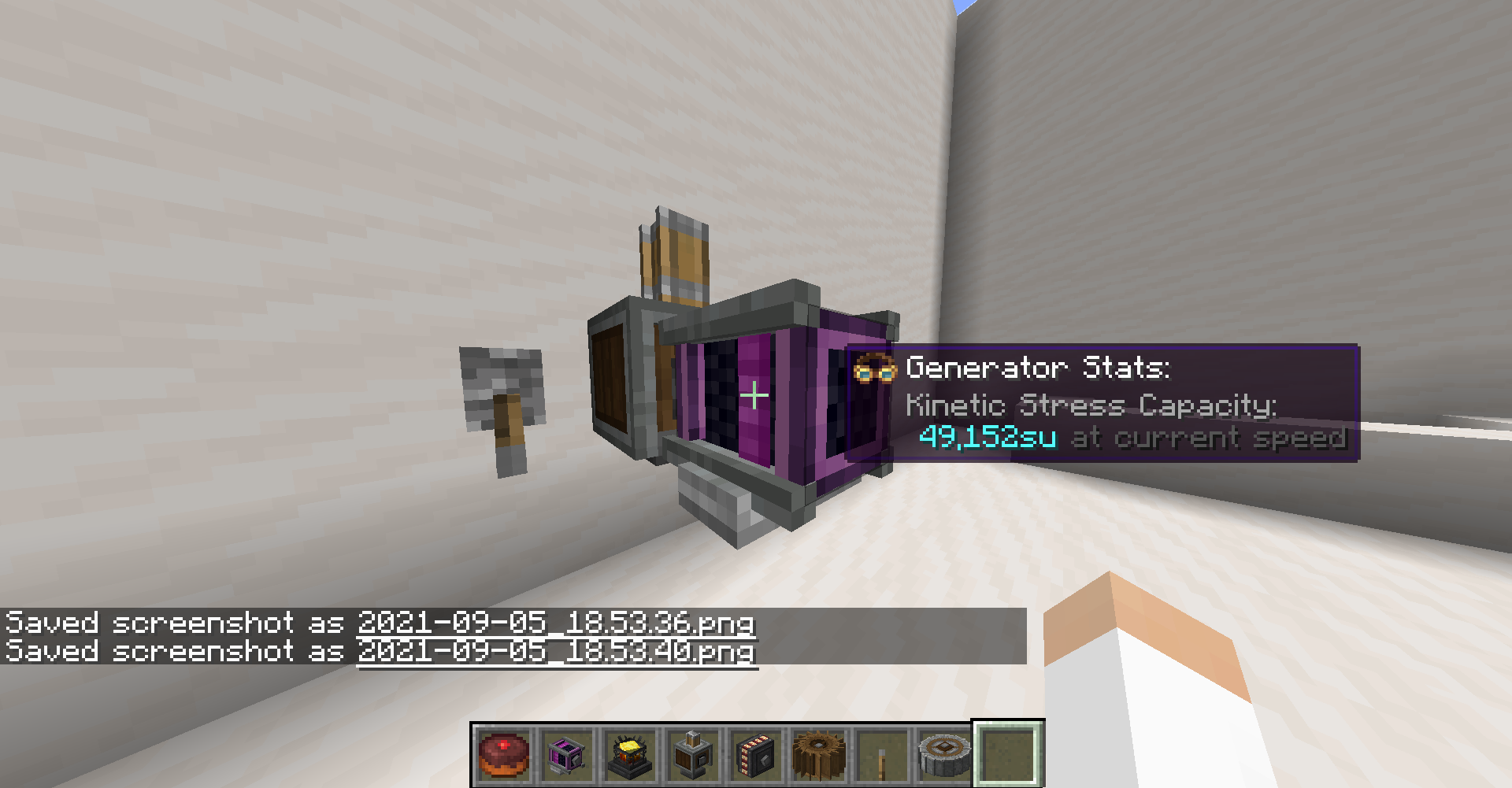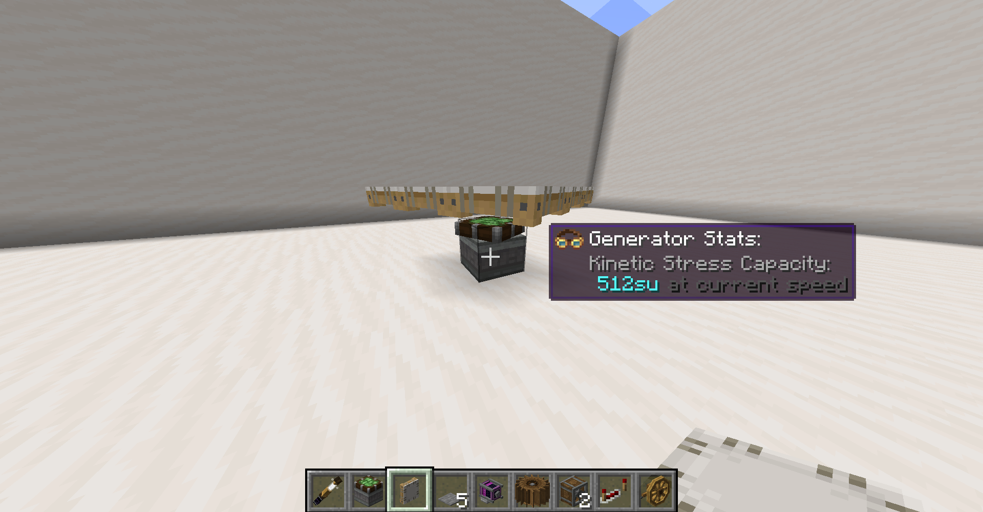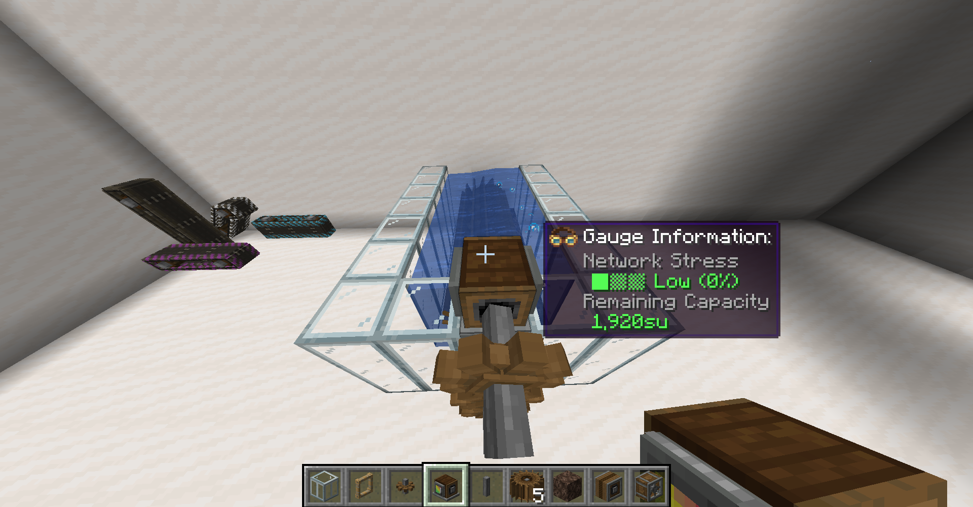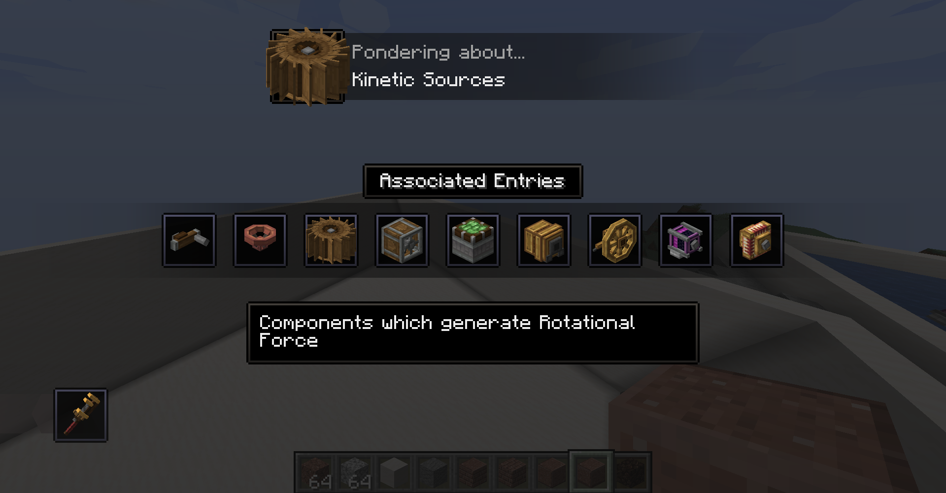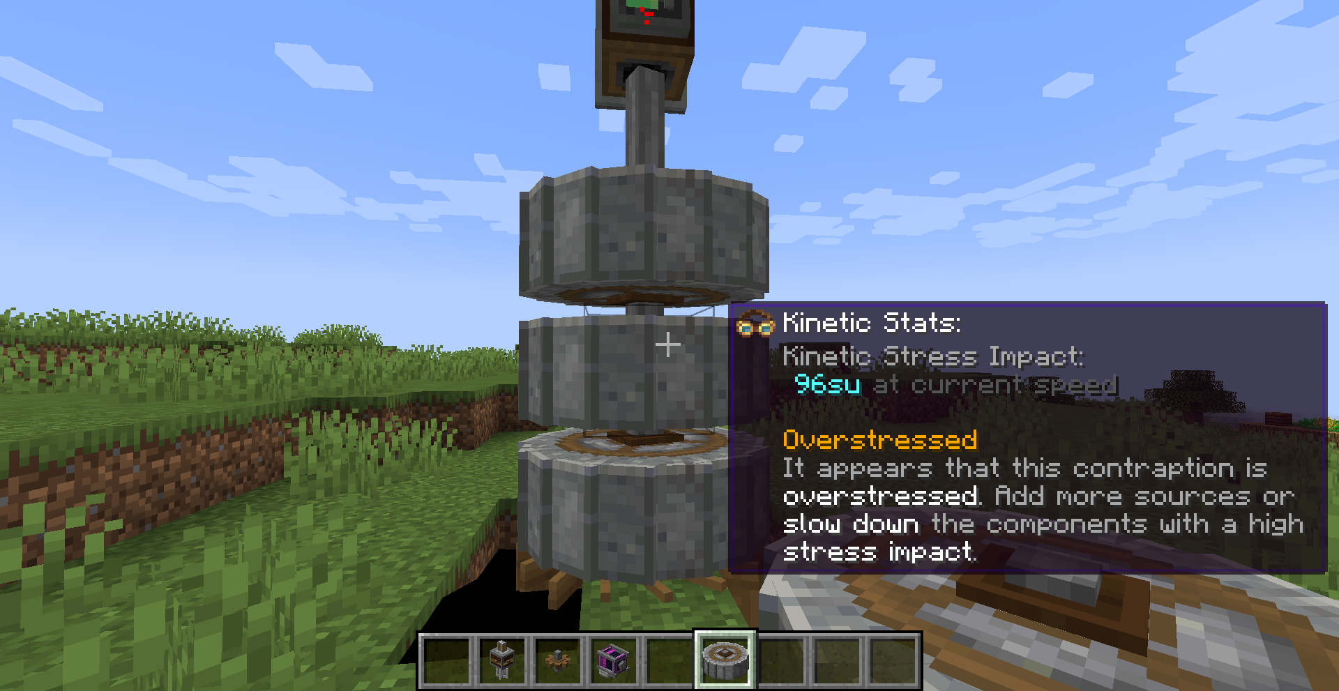 Create 모드의 동력 전달 및 제어는 상당히 직관적인 편입니다. 기어, 축, 벨트 모두 우리가 생각하는 방식대로 작동합니다. 그 외의 블록들도 Ponder 화면에서 그 사용법을 확인하실 수 있으므로 사용법 정도는 생략하겠습니다. 각 장치가 소모하는 동력 부하 수치들도 Goggle을 끼거나, tooltip (마우스를 아이템 위에 올릴 때 표시되는 설명들)에서 Shift 키를 눌러서 확인할 수 있는 경우가 많기에 생략하고자 합니다.