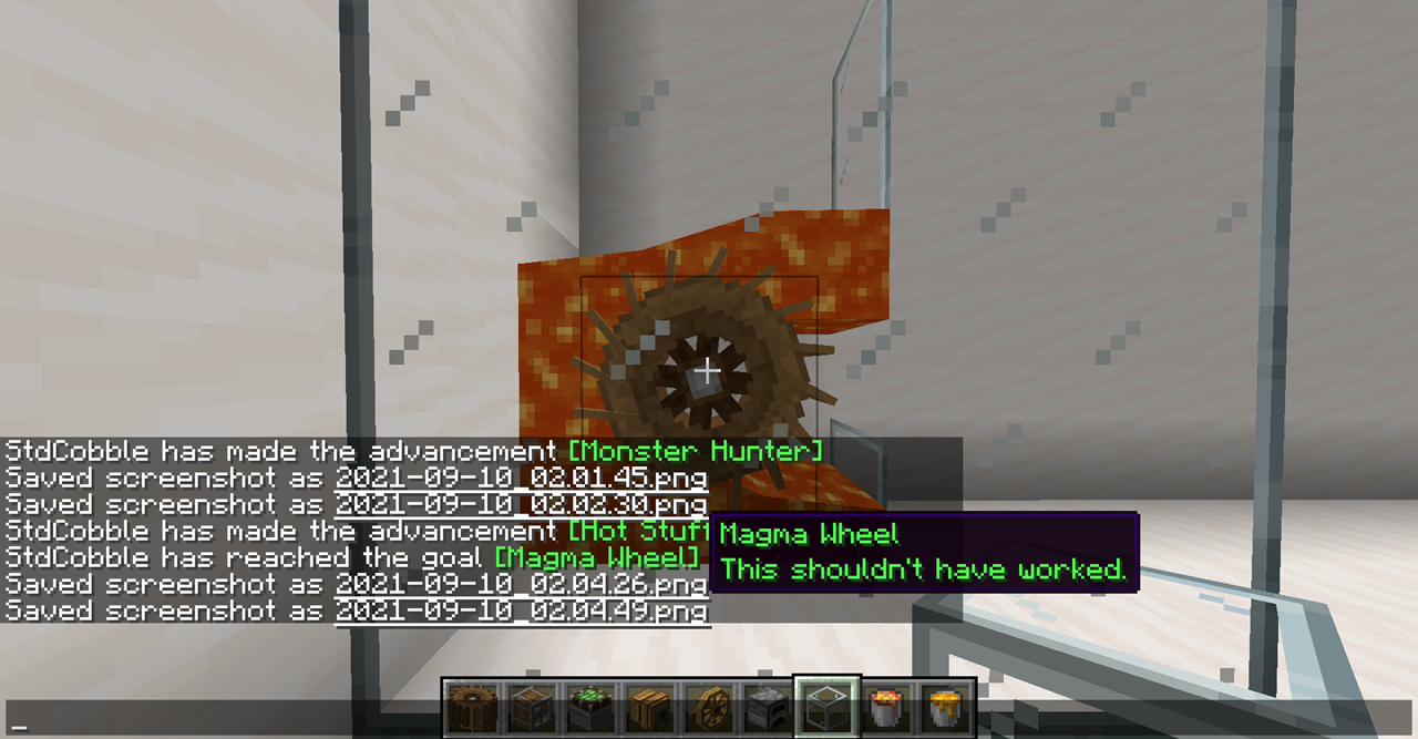 Water Wheel에 대해서 다들 모르고 있었을 수 있는 사실 중 하나는 용암으로도 돌릴 수 있다는 점입니다. 이와 관련된 도전과제도 있습니다.