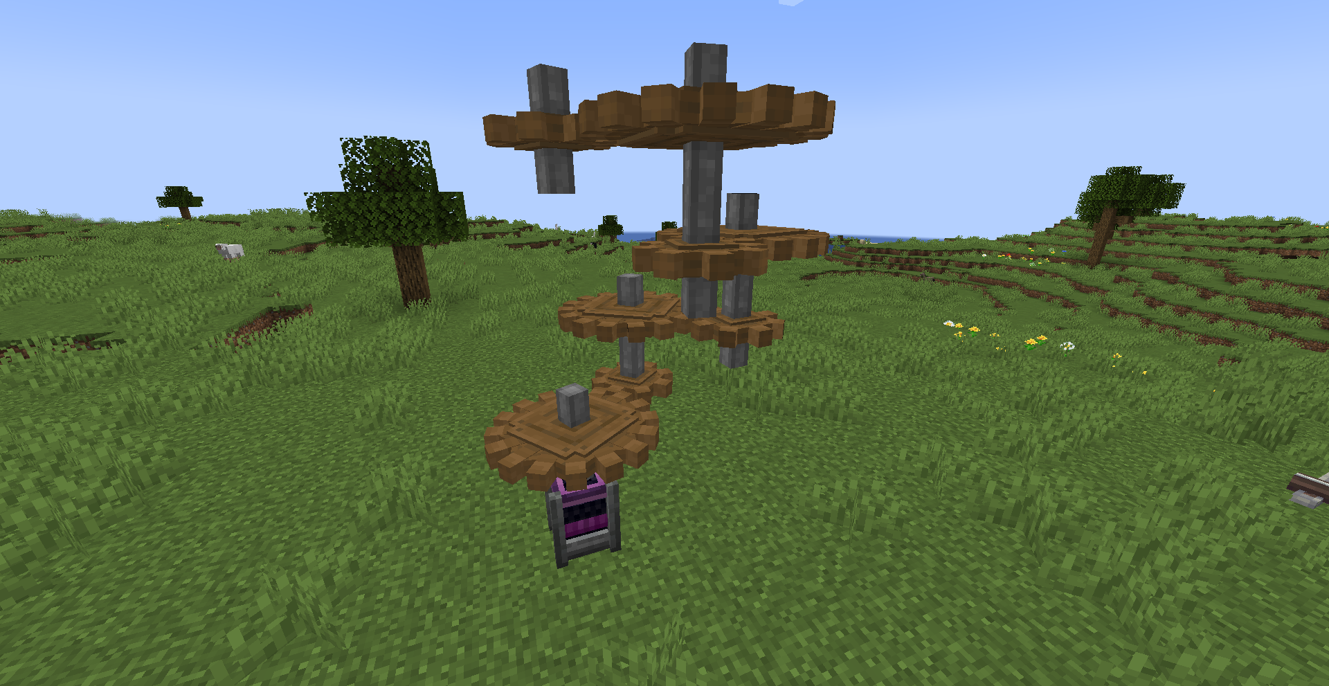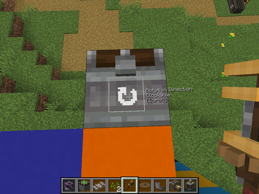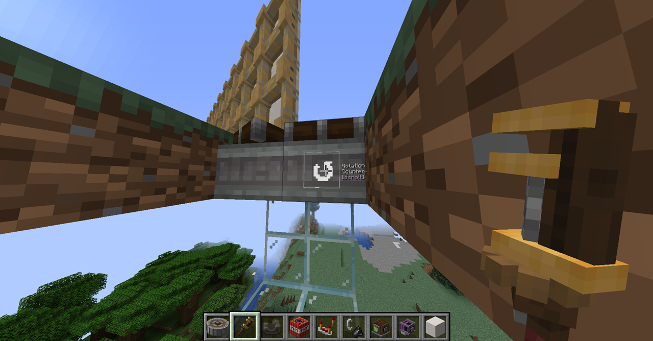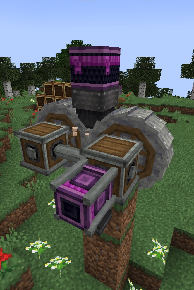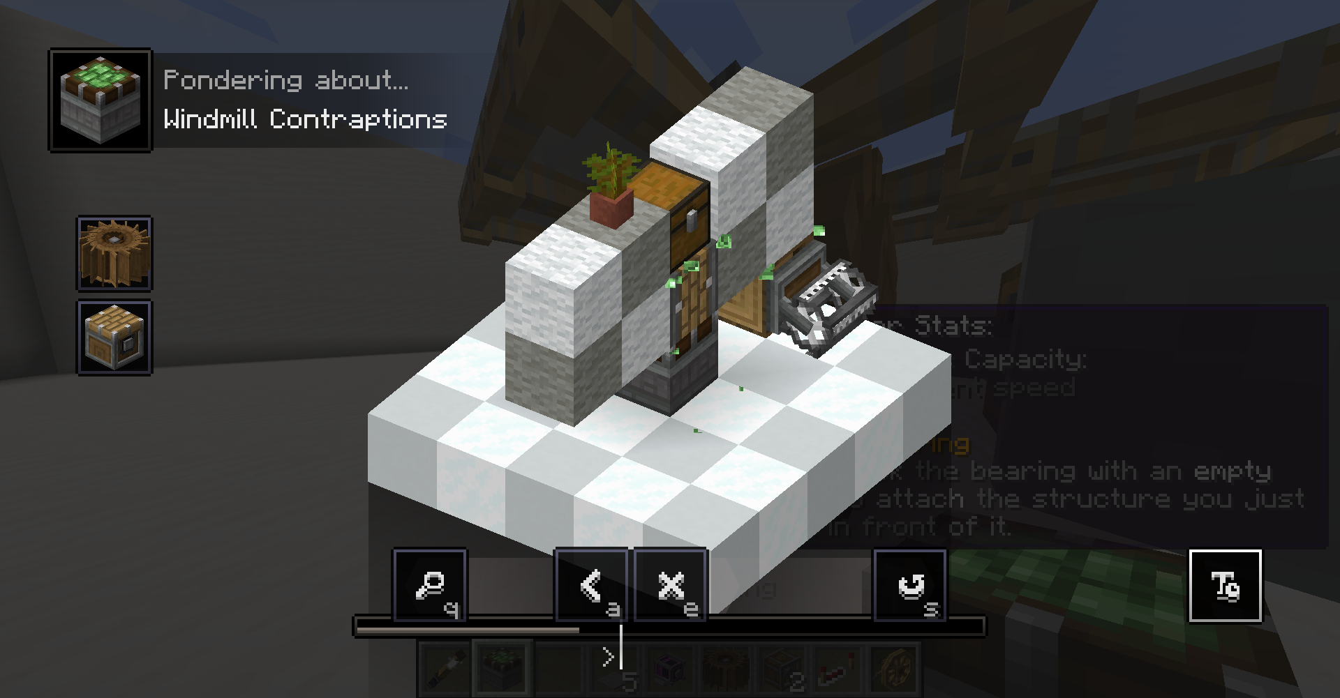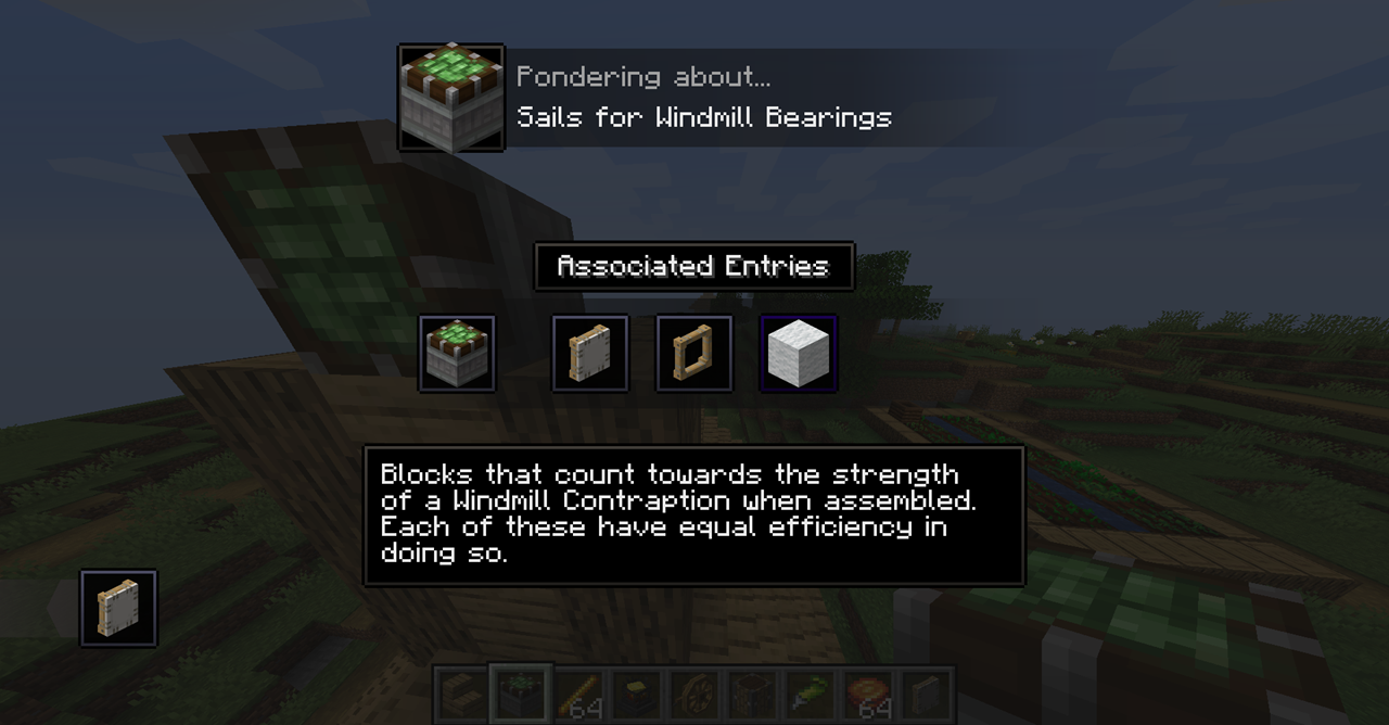Windmill Bearing의 방향은 제한이 없기에 Ponder 화면의 그림처럼 하늘을 보게 하고 수확 장치를 연결해 자동으로 수확되는 밭을 만들 수도 있고, 회전문처럼 생긴 몹타워를 지어볼 수도 있습니다.
