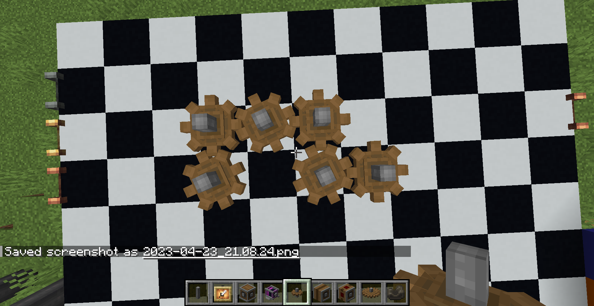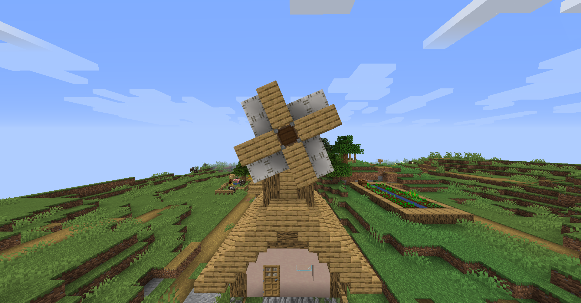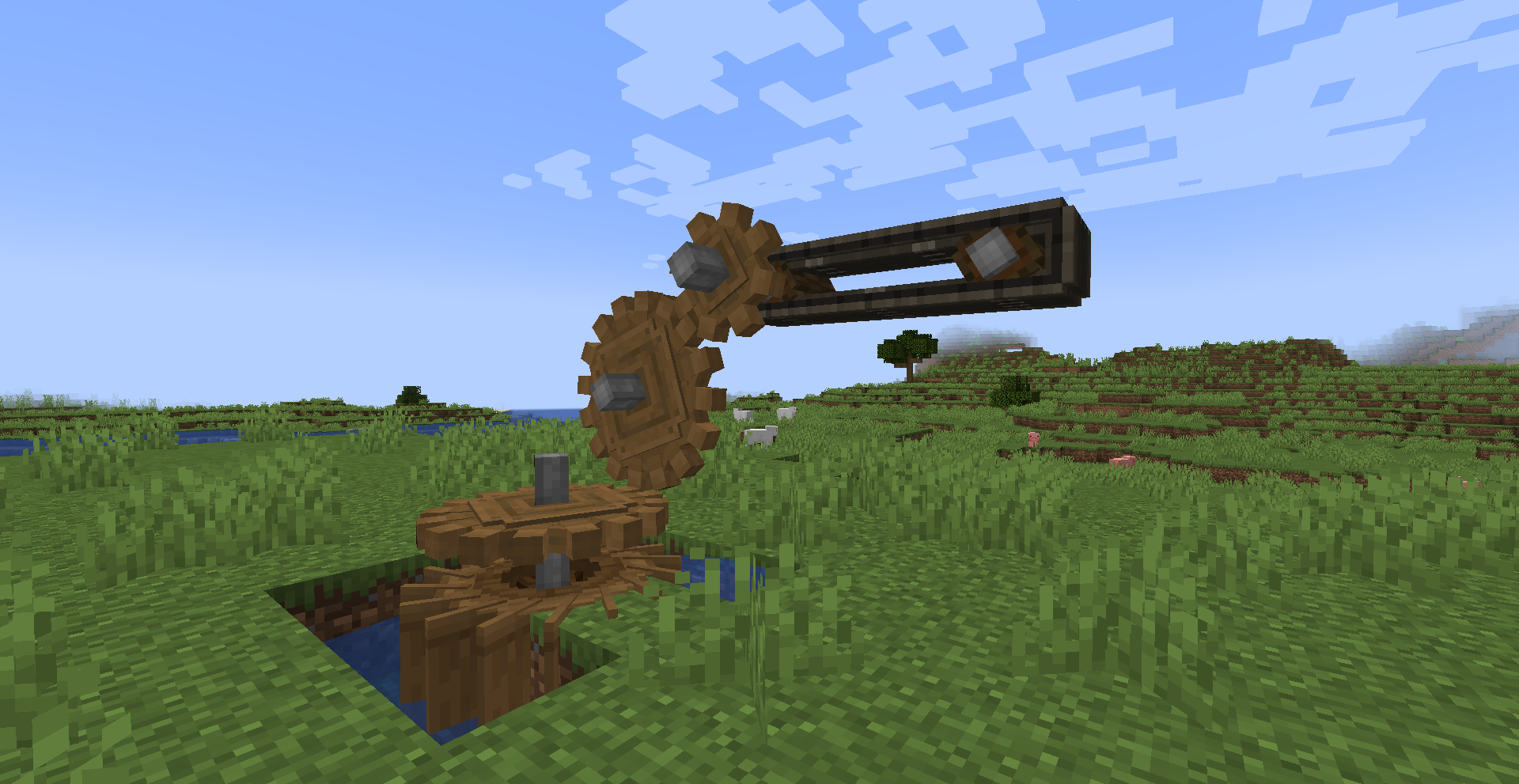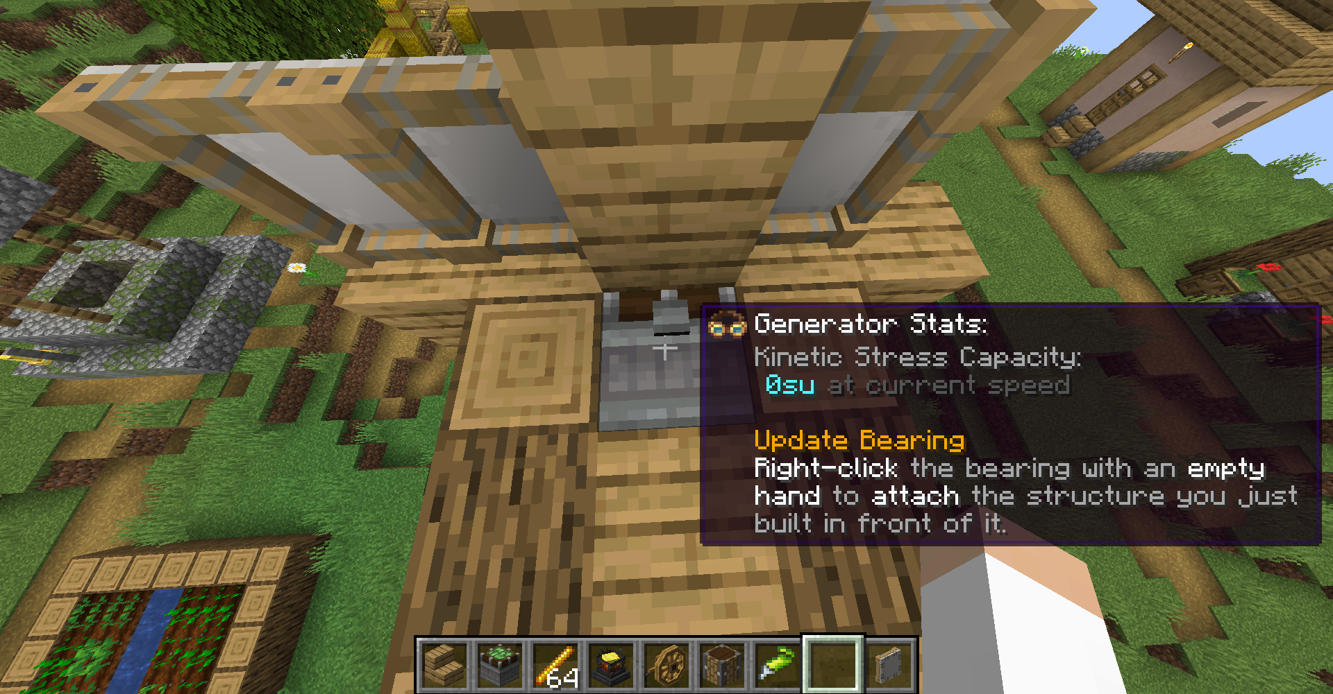 Windmill Bearing의 방향은 제한이 없기에 Ponder 화면의 그림처럼 하늘을 보게 하고 수확 장치를 연결해 자동으로 수확되는 밭을 만들 수도 있고, 회전문처럼 생긴 몹타워를 지어볼 수도 있습니다.