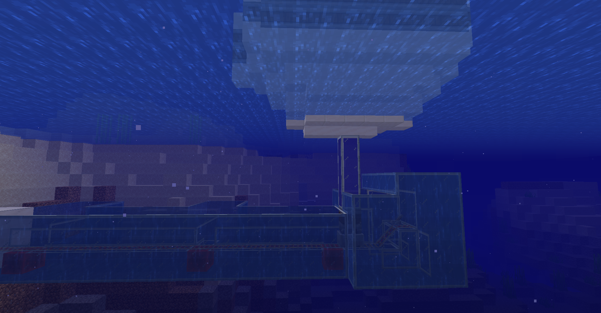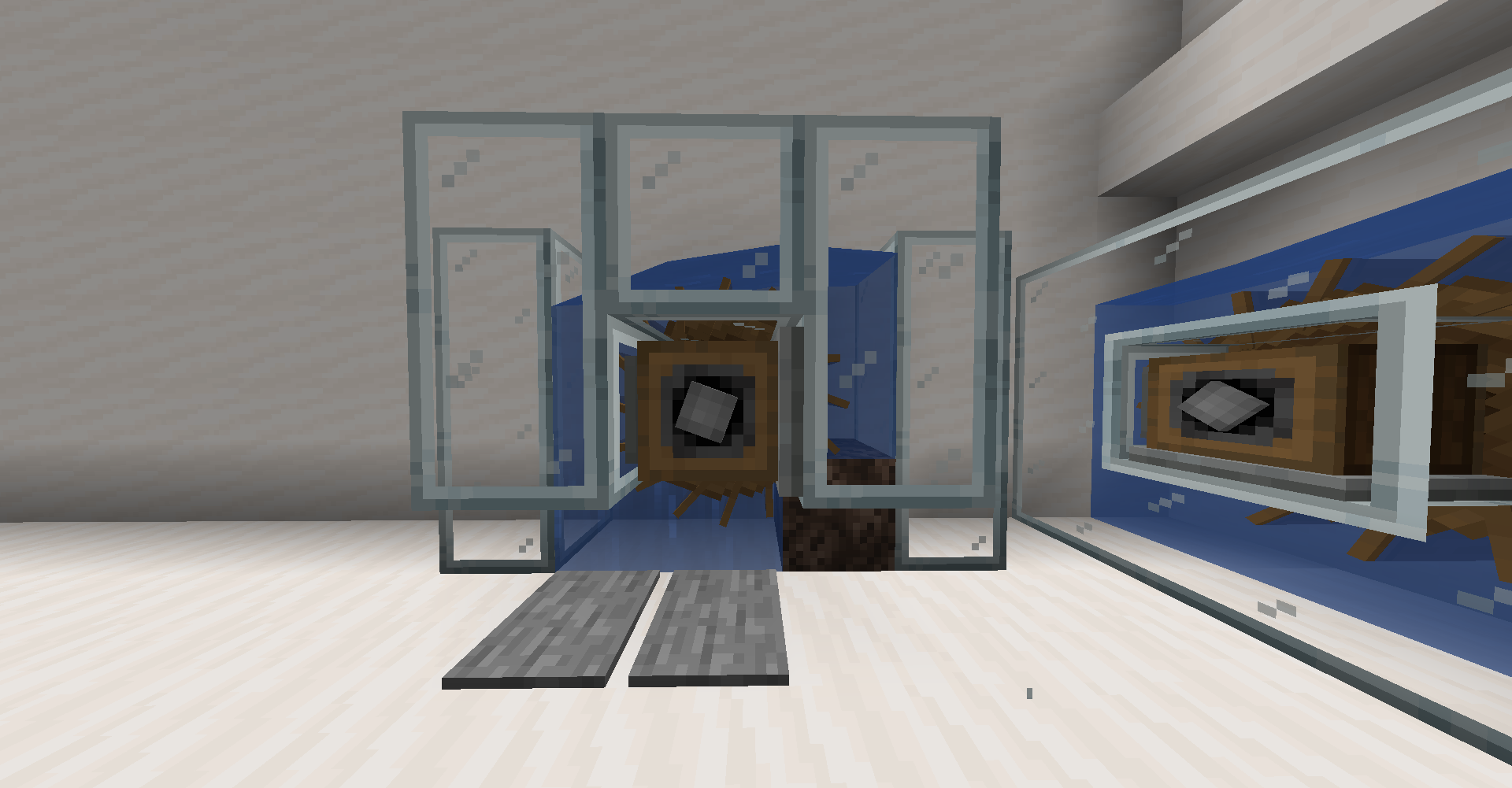 또한, Bubble Column, 즉 Soul Sand나 Magma Stone으로 생긴 거품 기둥도 물의 흐름으로 인식하므로 아래와 같은 구조도 가능합니다. 물론, 저 물 자체는 흐르지 않는 물 기둥이여야 합니다.