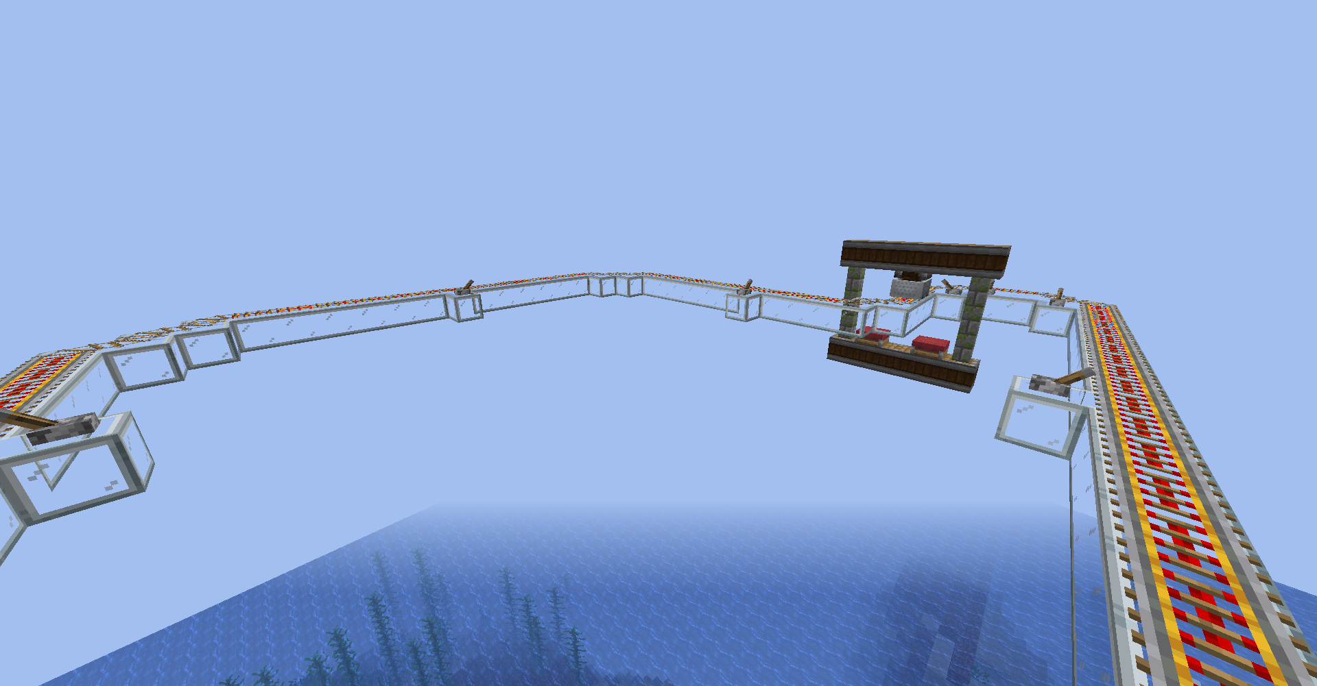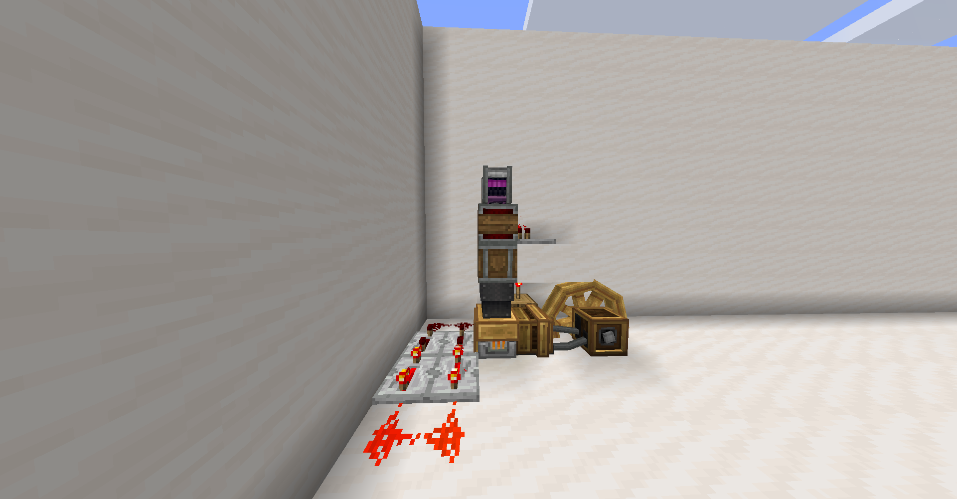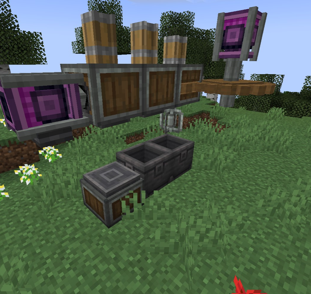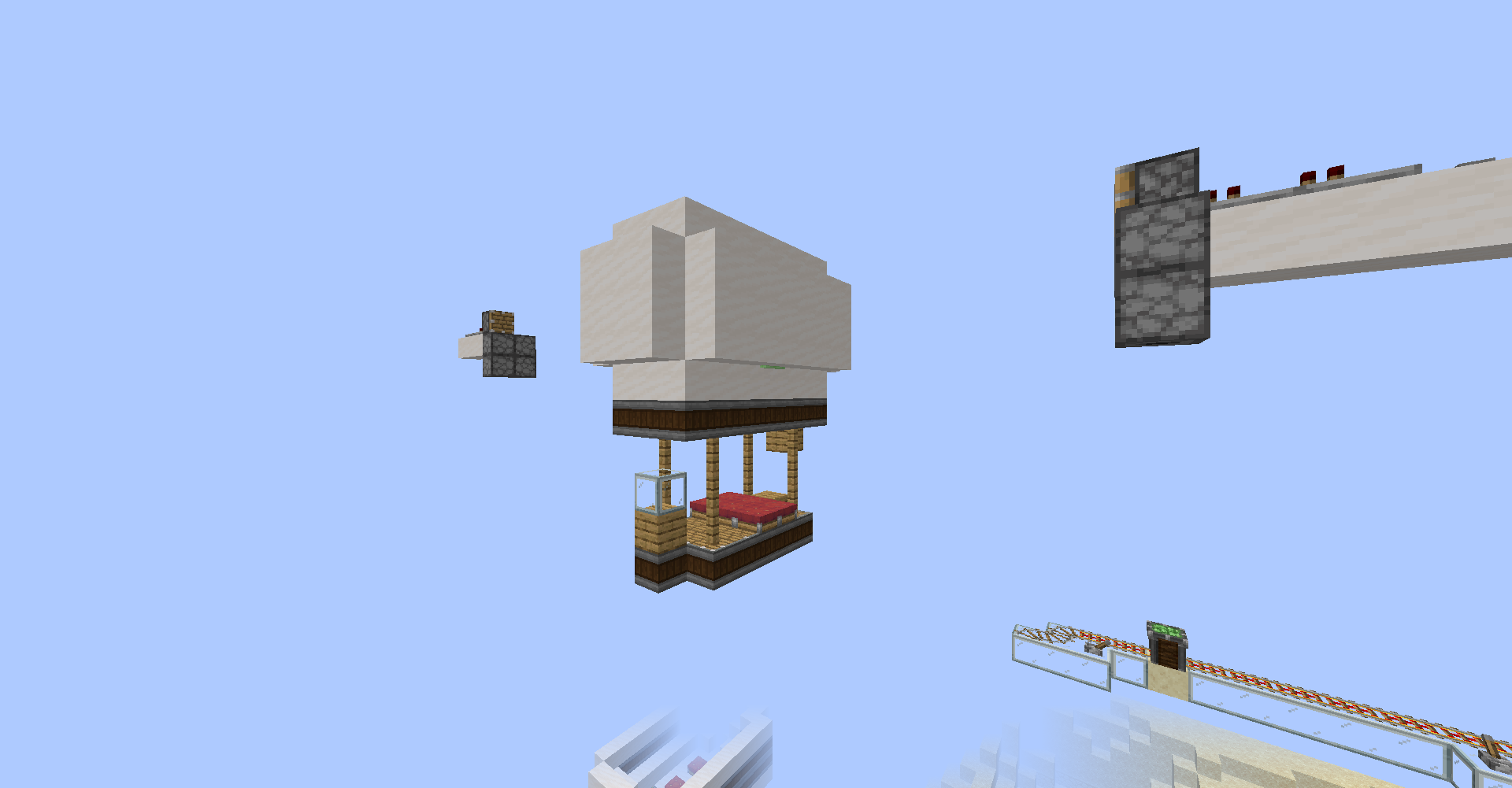 As you can see, we just drop the cart connected with airship-like blocks on the flying-machine. It is quite complicated part because you can't see through the blocks. It is possible because in create 0.3, moving blocks are not regarded as a rigid one until collide with entity. (So you need to put cart on the flying machine)