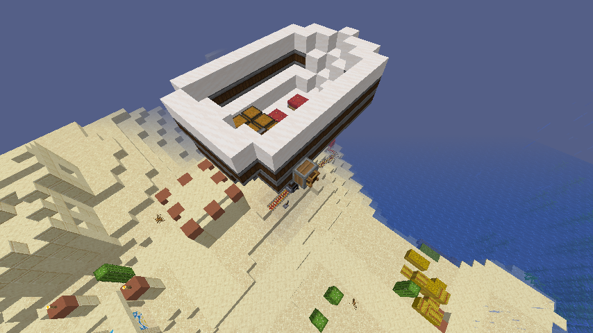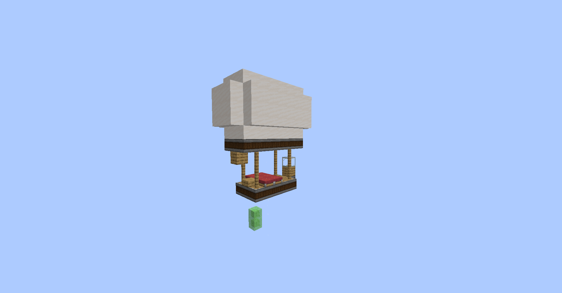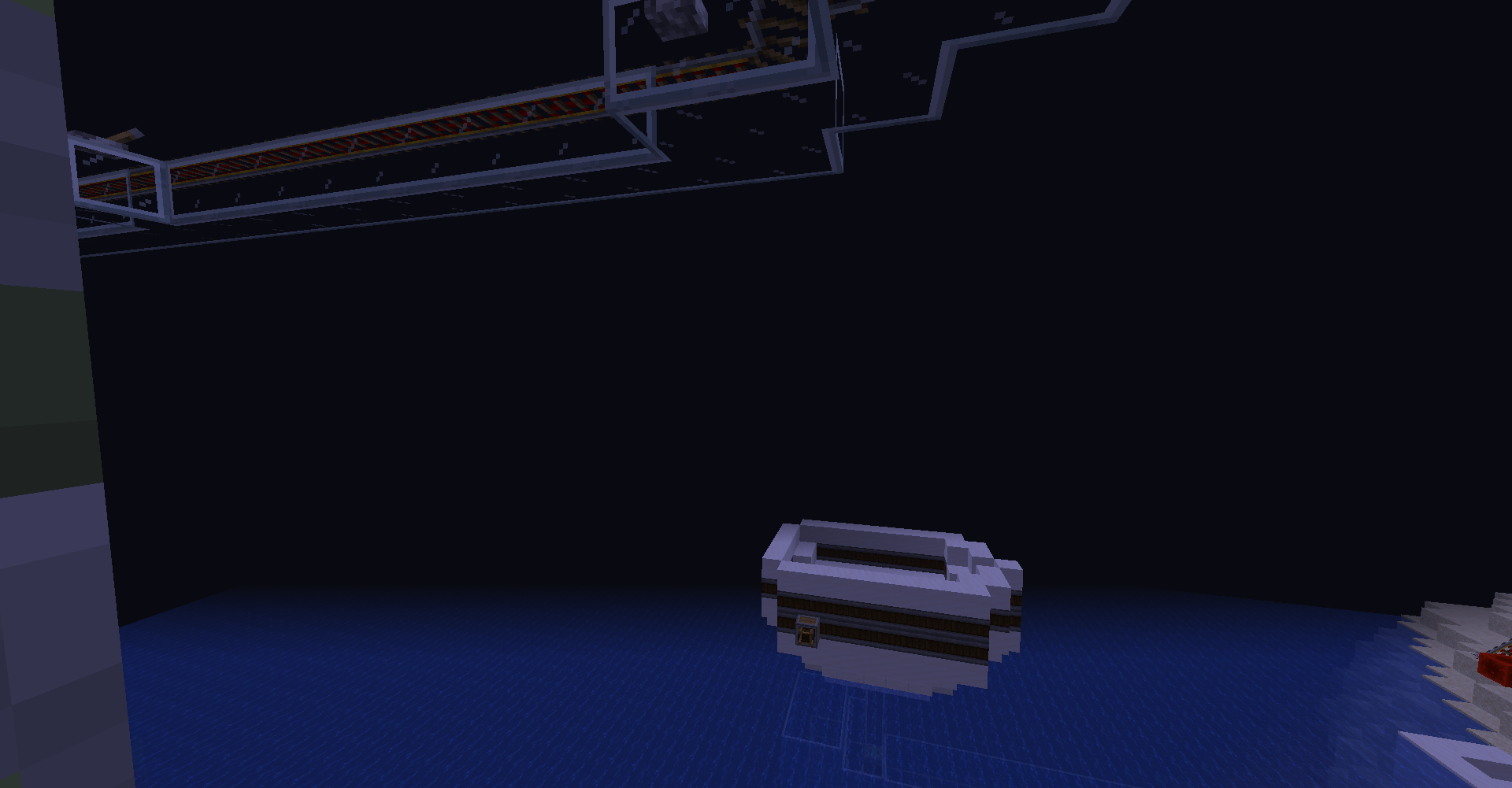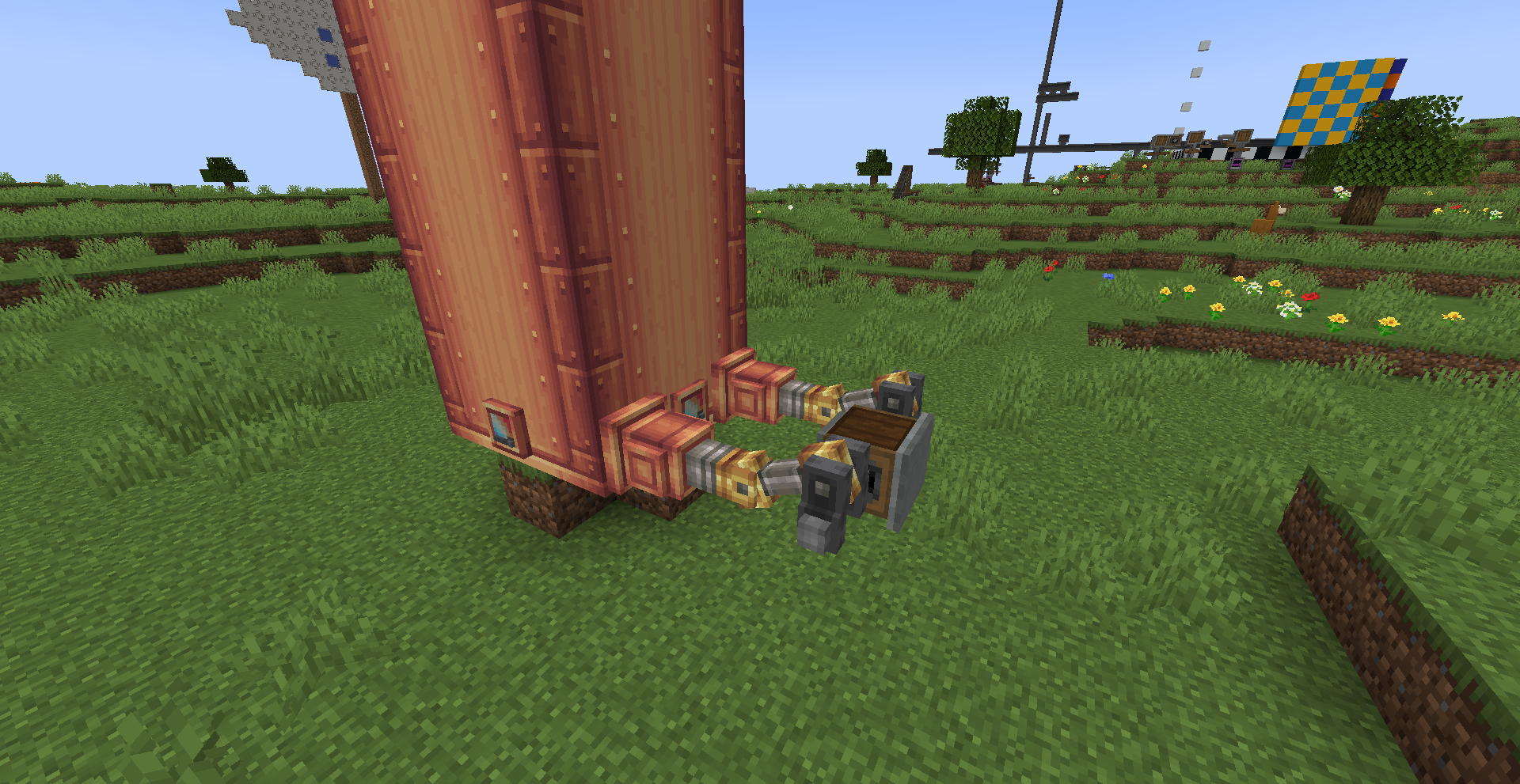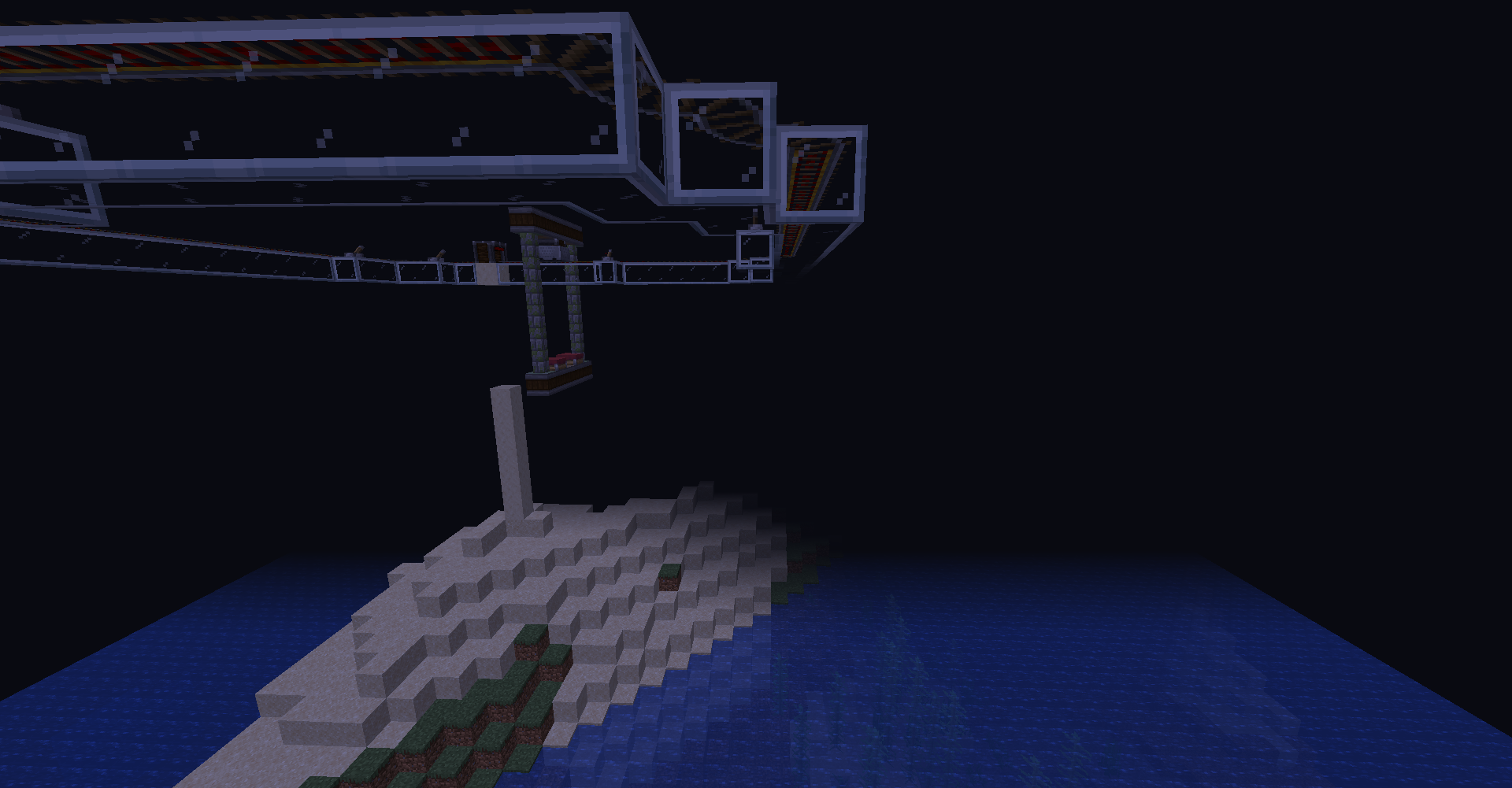 As you can see, we just drop the cart connected with airship-like blocks on the flying-machine. It is quite complicated part because you can't see through the blocks. It is possible because in create 0.3, moving blocks are not regarded as a rigid one until collide with entity. (So you need to put cart on the flying machine)
