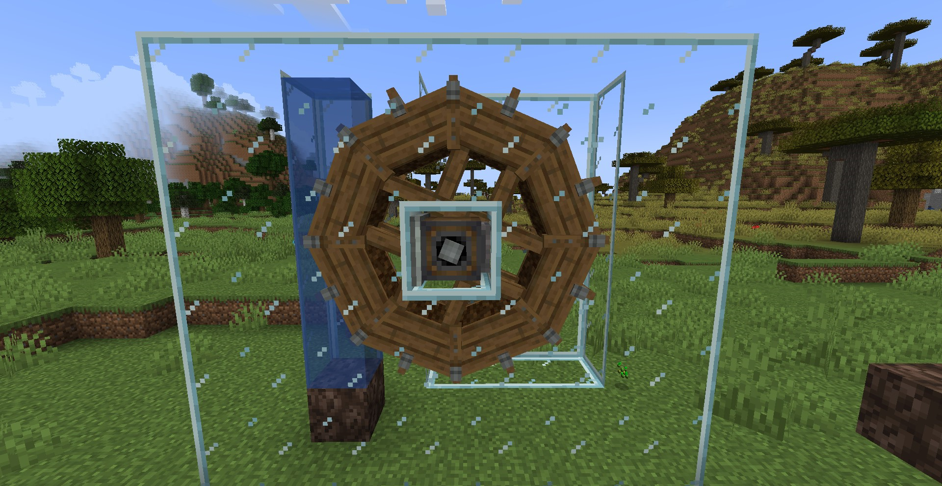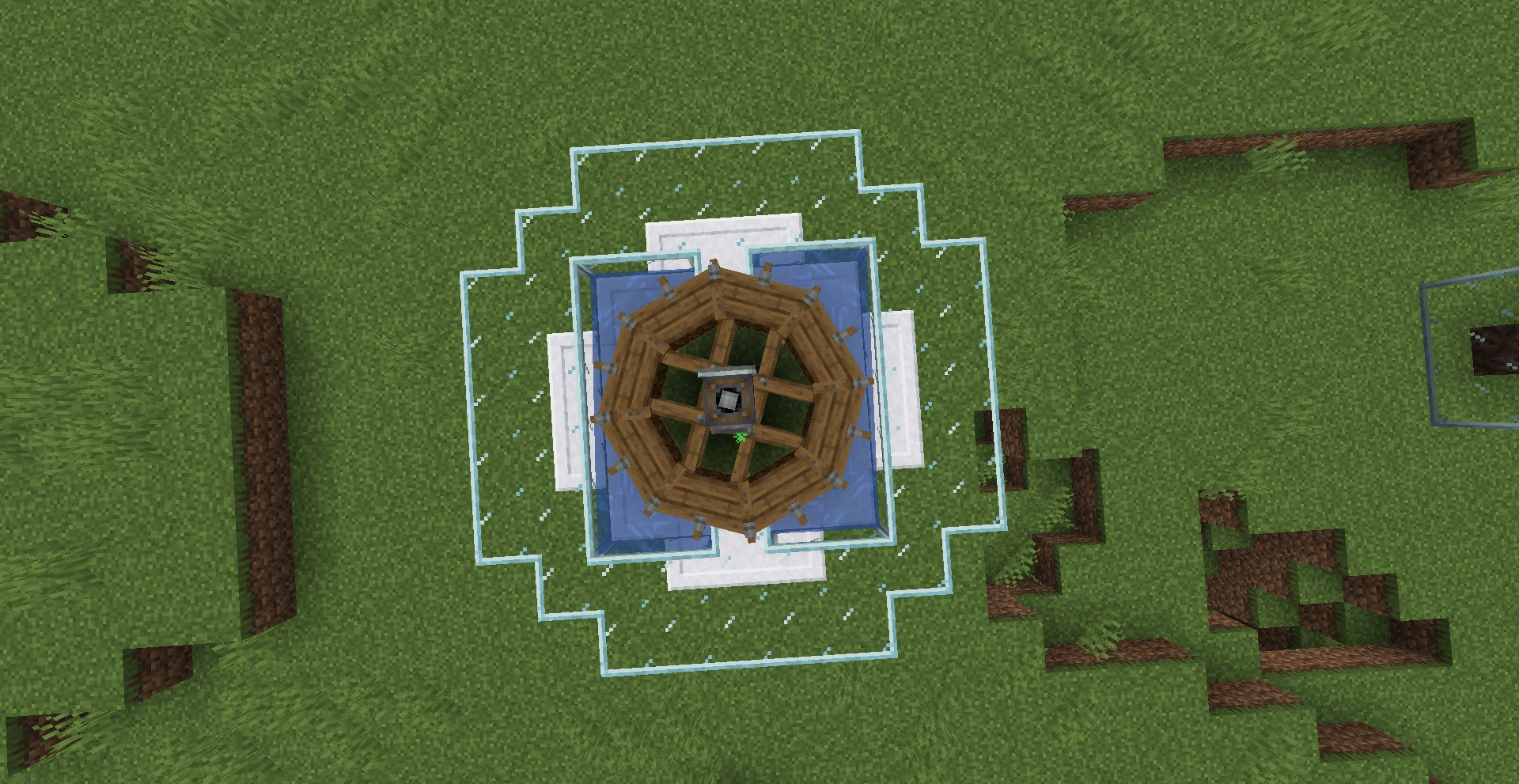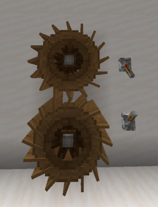 아래와 같이 설치하면 한 평면 내에서 굉장히 많은 Water Wheel을 설치할 수있습니다. 하나당 320 SU이므로, 25.6 Water Wheel at 20 RPM = 1 Windmill at 16 RPM, 1.6 Water Wheel at 20 RPM = 1 Windmill at 16 RPM, 102.4 Water Wheel at 20 RPM = 1 Furnace Engine at 32 RPM과 동등한 성능을 냅니다.
