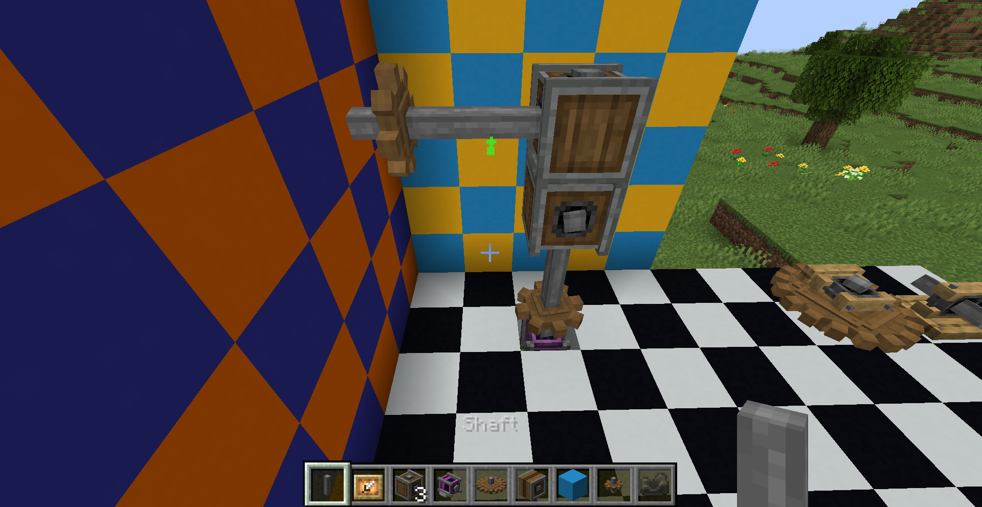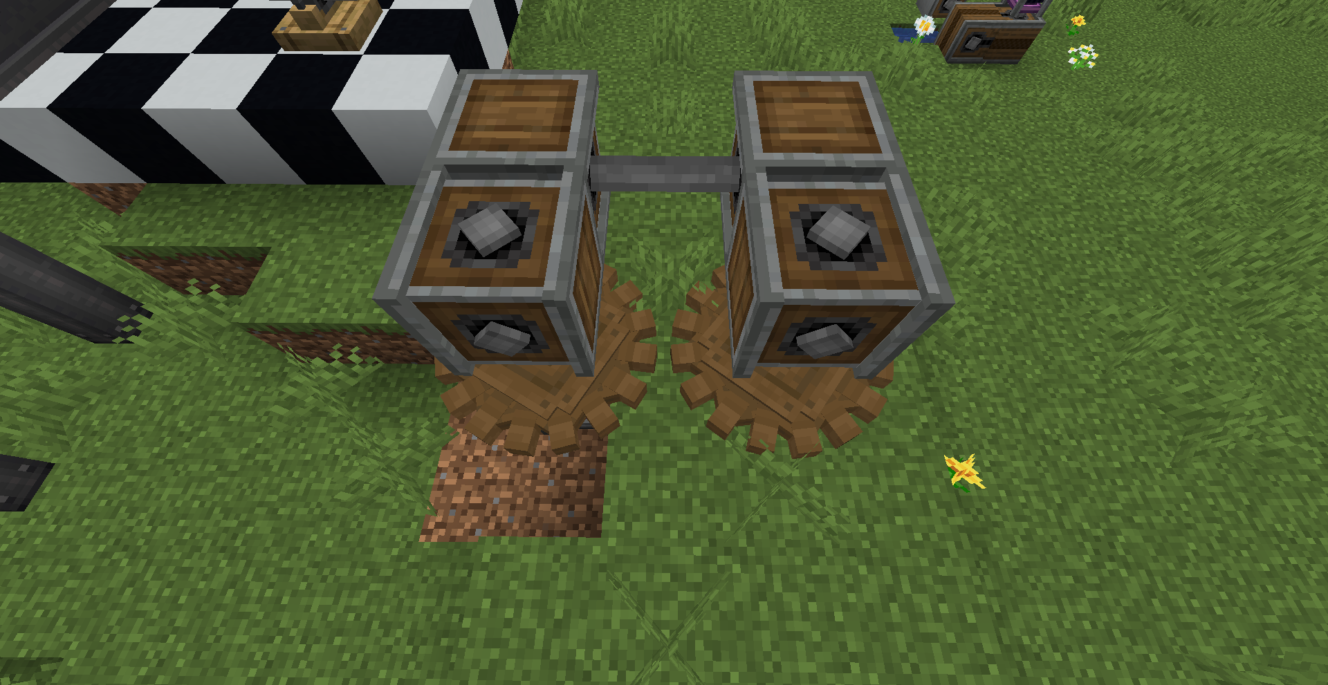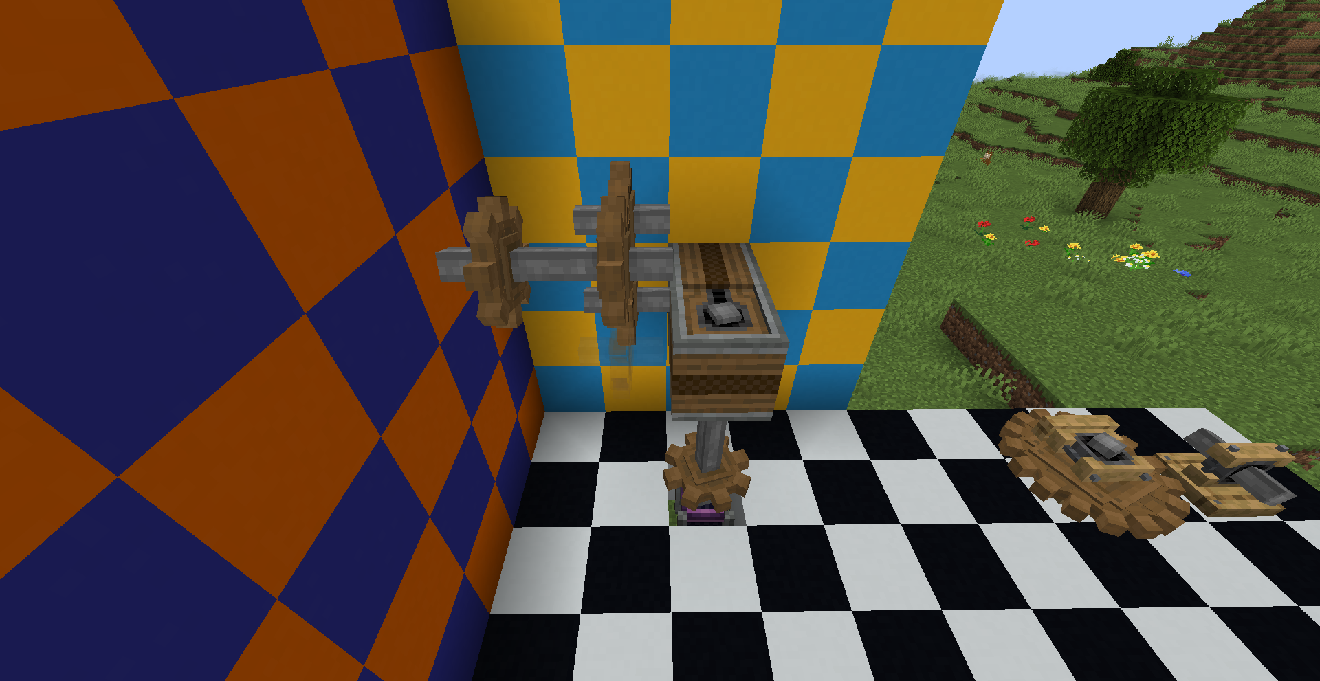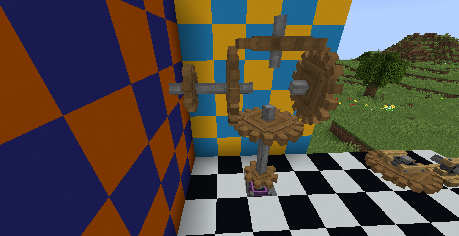 좁은 공간에서 회전 방향을 반대 방향으로 바꿔야 한다면 어떻게 해야 할까요? 그냥 기어박스를 쓰면 됩니다. 만약 특정 경우에만 반대로 돌아야 한다면 gearshift를 사용하고 적절히 레드스톤 신호를 주면 되겠죠.