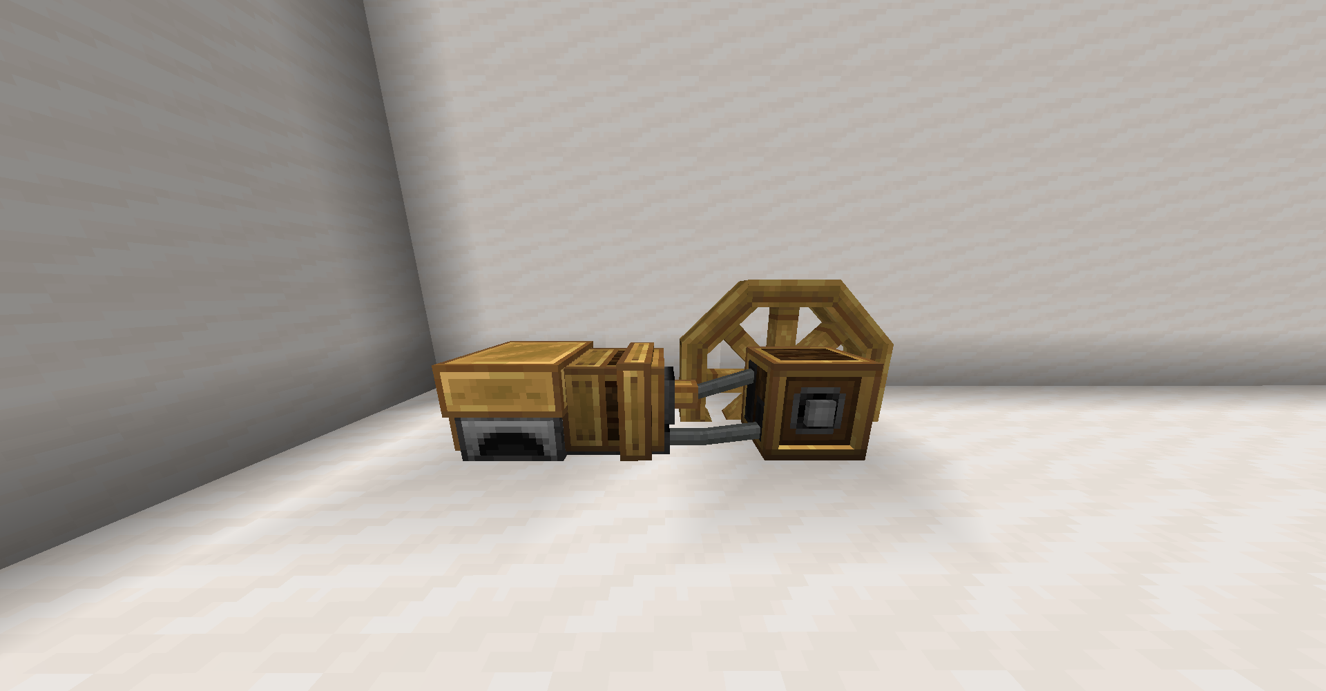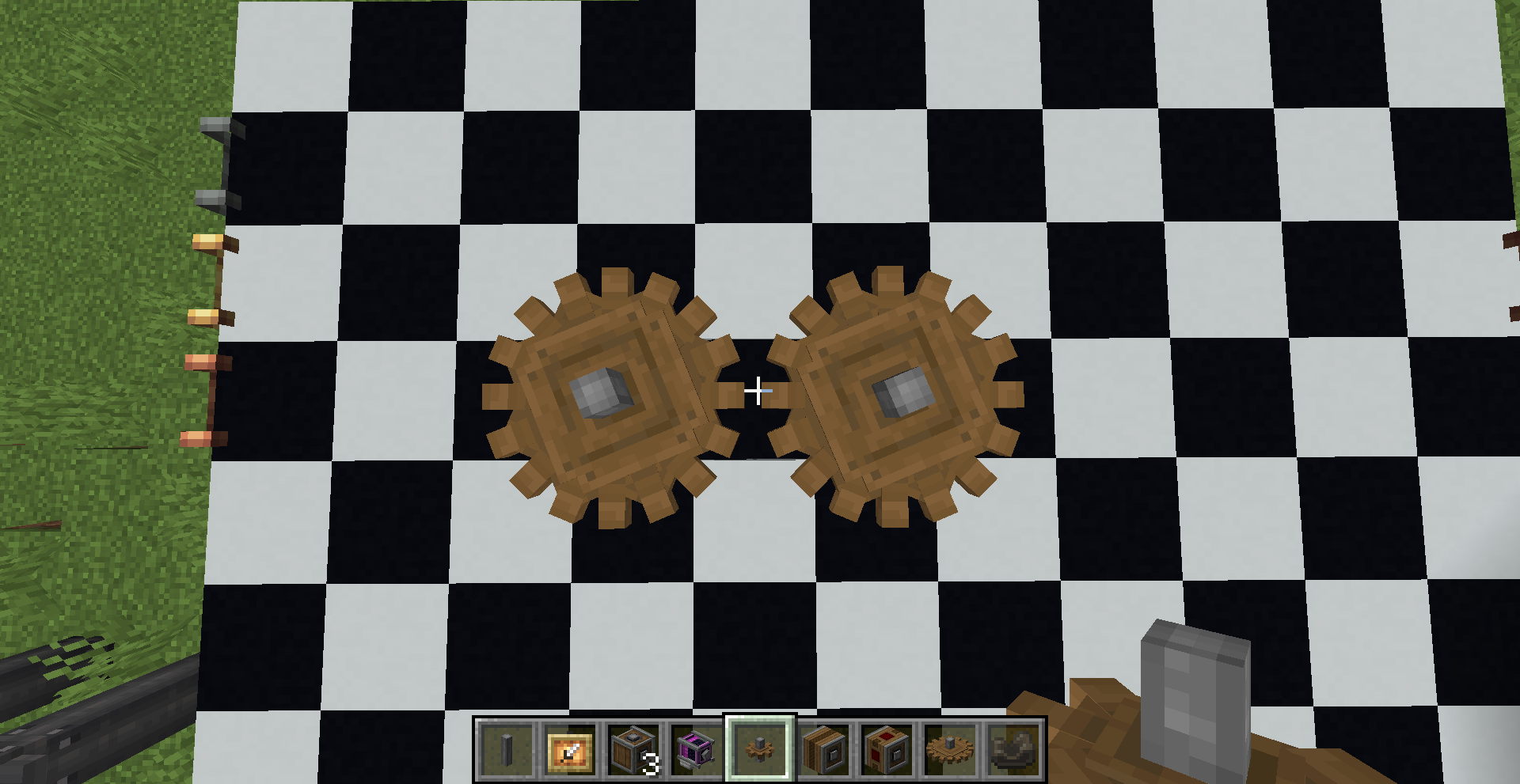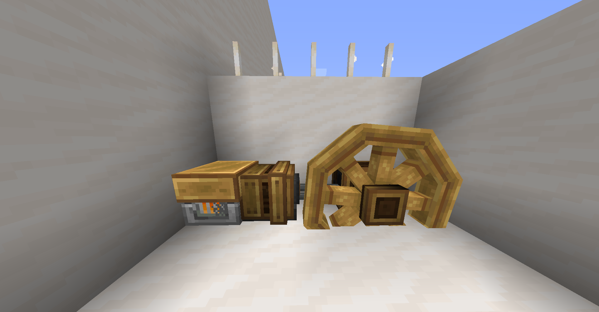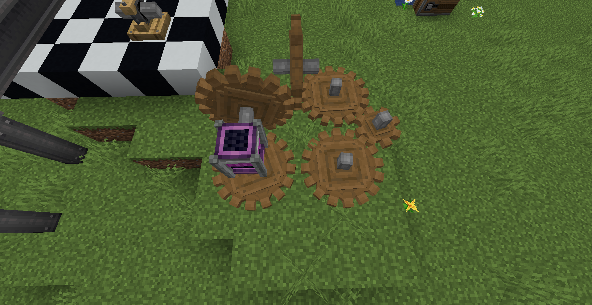 좁은 공간에서 회전 방향을 반대 방향으로 바꿔야 한다면 어떻게 해야 할까요? 그냥 기어박스를 쓰면 됩니다. 만약 특정 경우에만 반대로 돌아야 한다면 gearshift를 사용하고 적절히 레드스톤 신호를 주면 되겠죠.