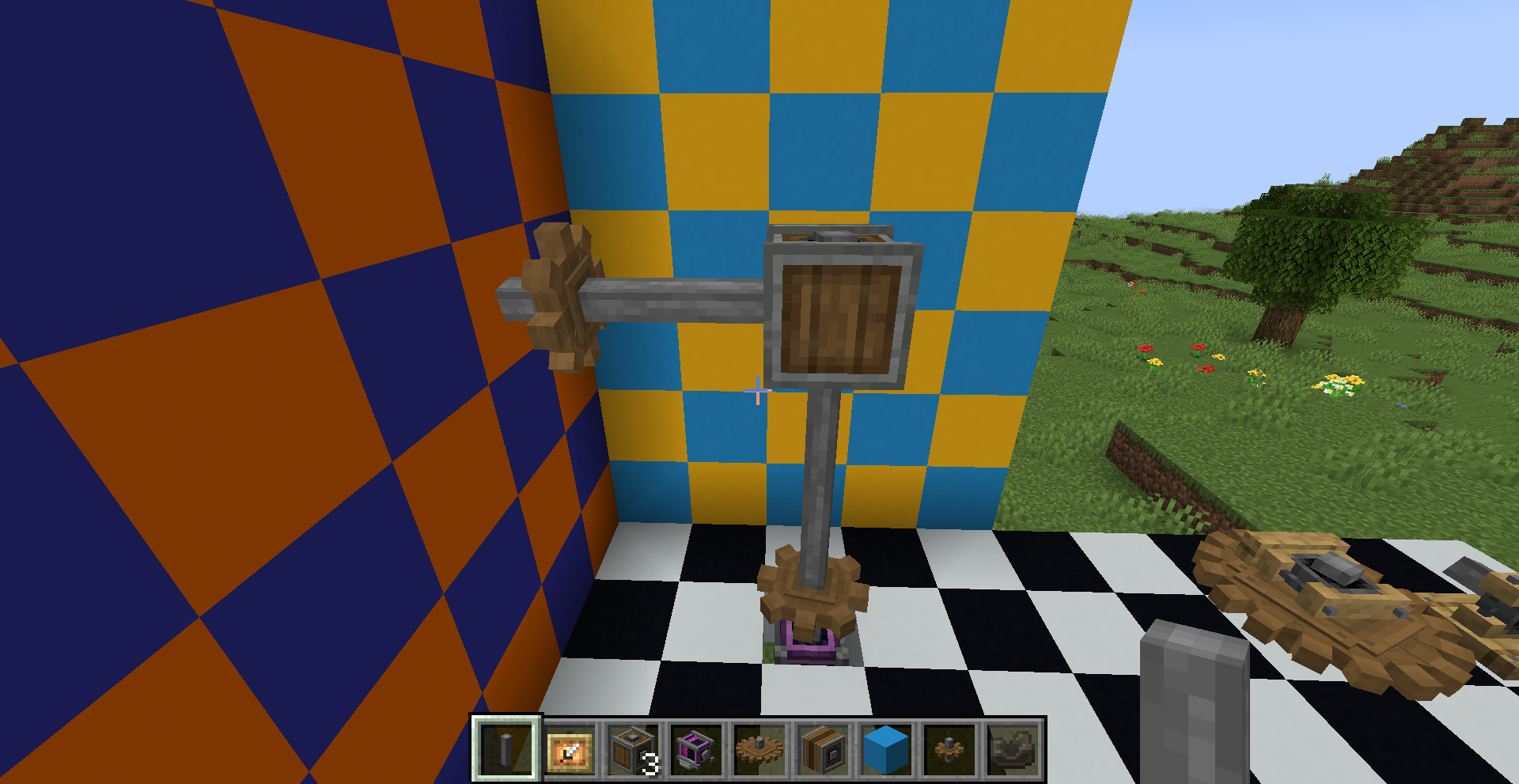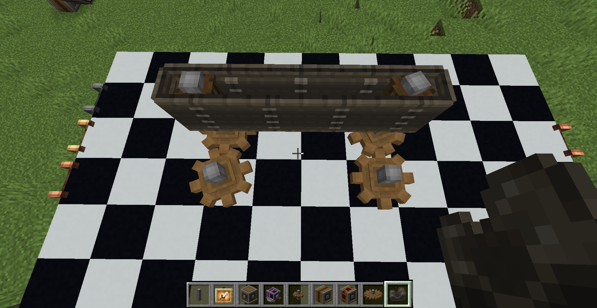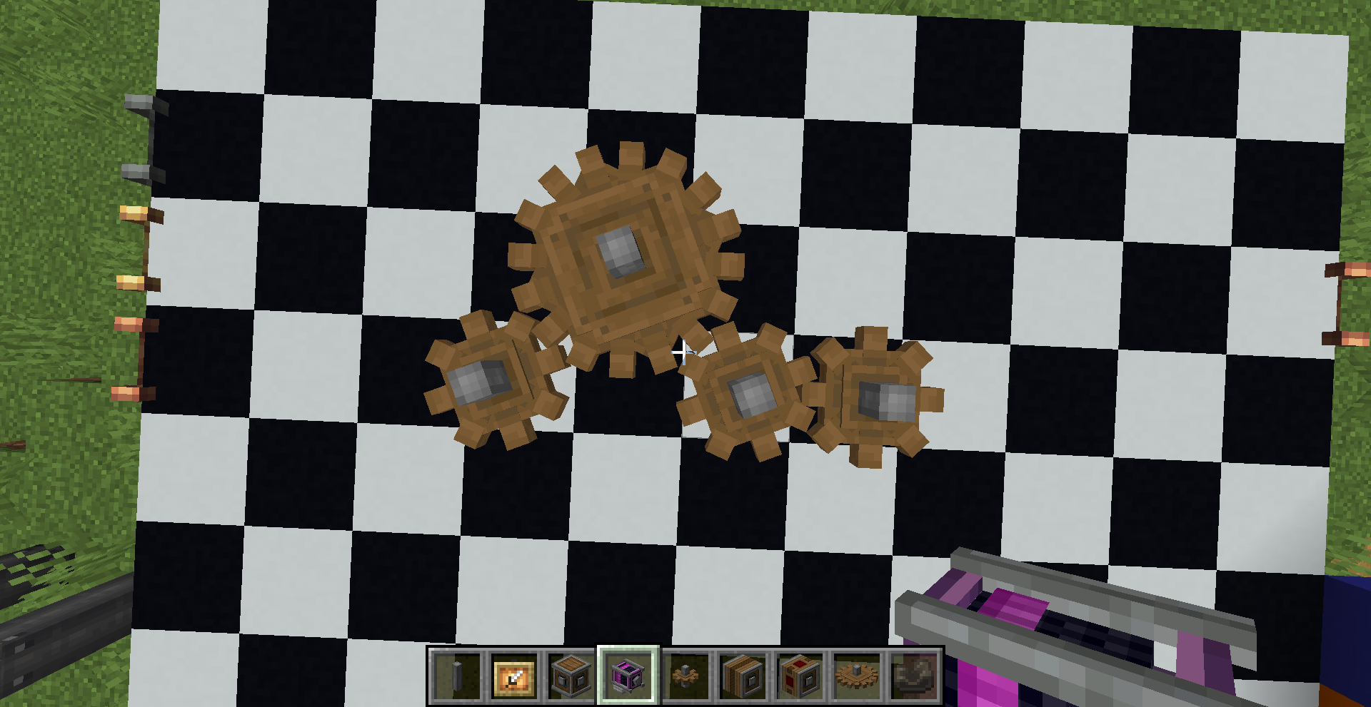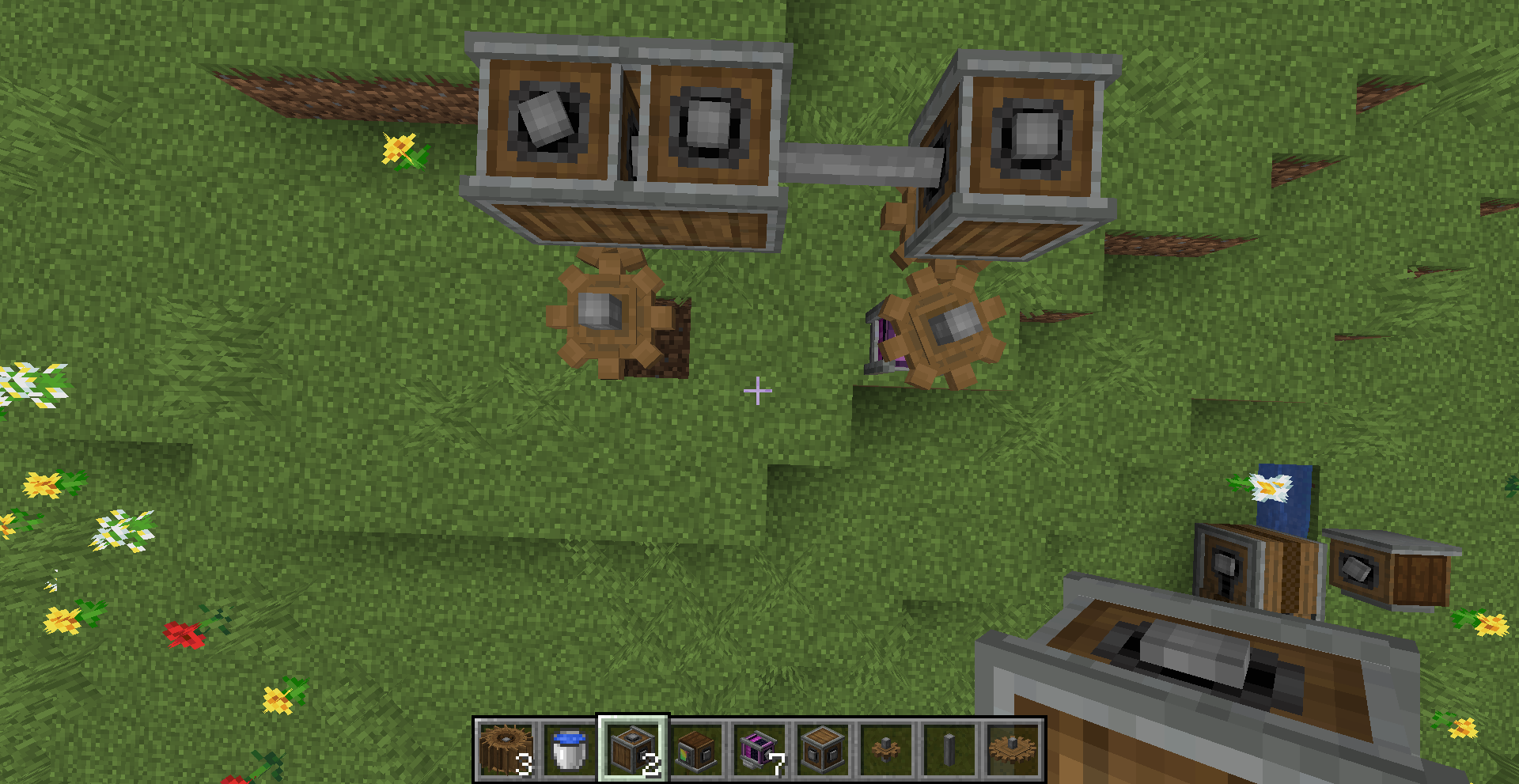좁은 공간에서 회전 방향을 반대 방향으로 바꿔야 한다면 어떻게 해야 할까요? 그냥 기어박스를 쓰면 됩니다. 만약 특정 경우에만 반대로 돌아야 한다면 gearshift를 사용하고 적절히 레드스톤 신호를 주면 되겠죠.