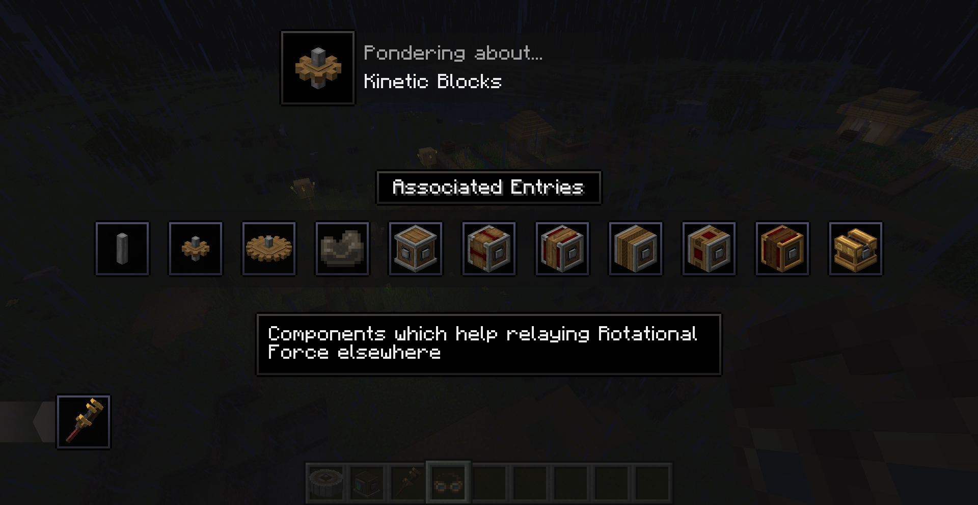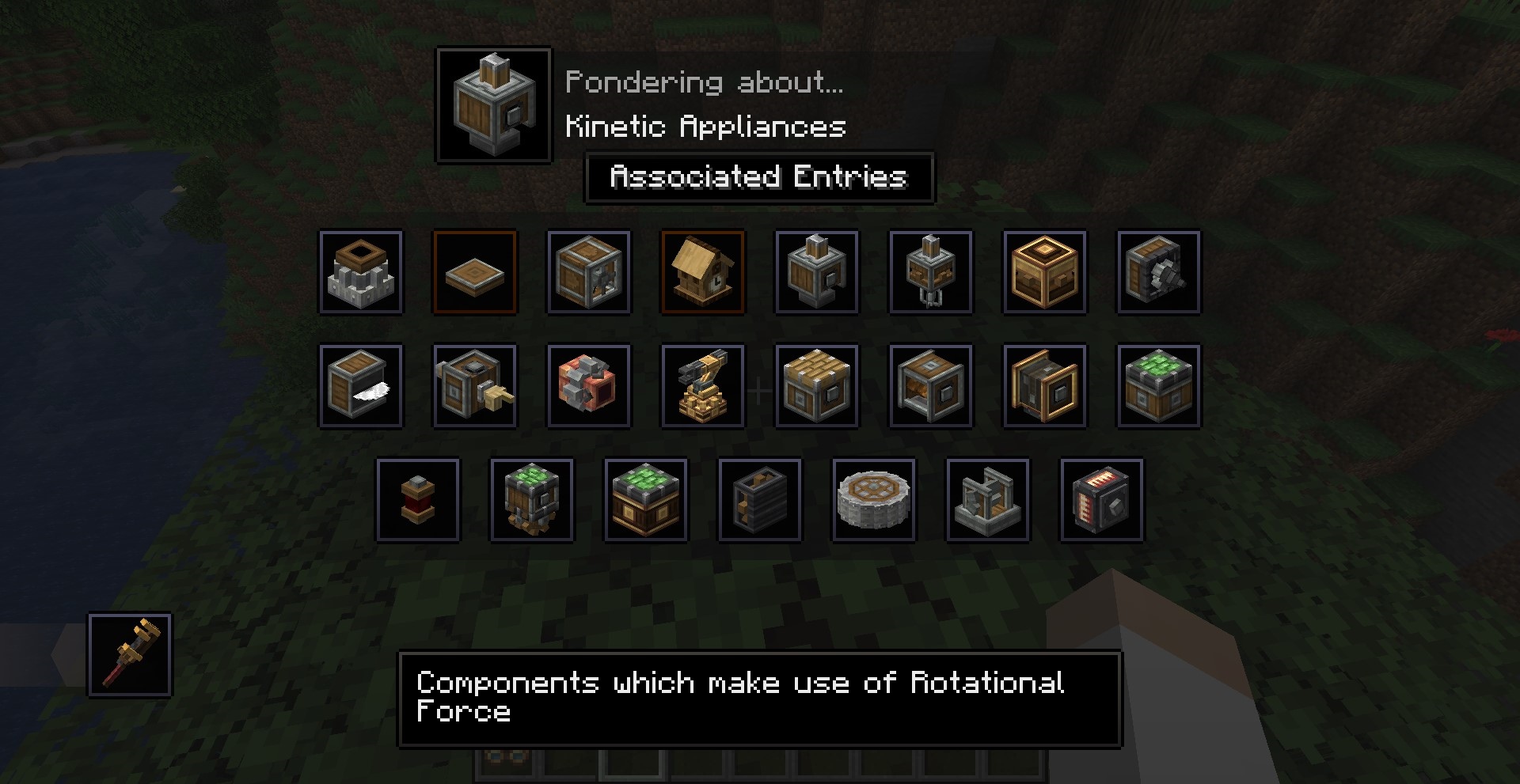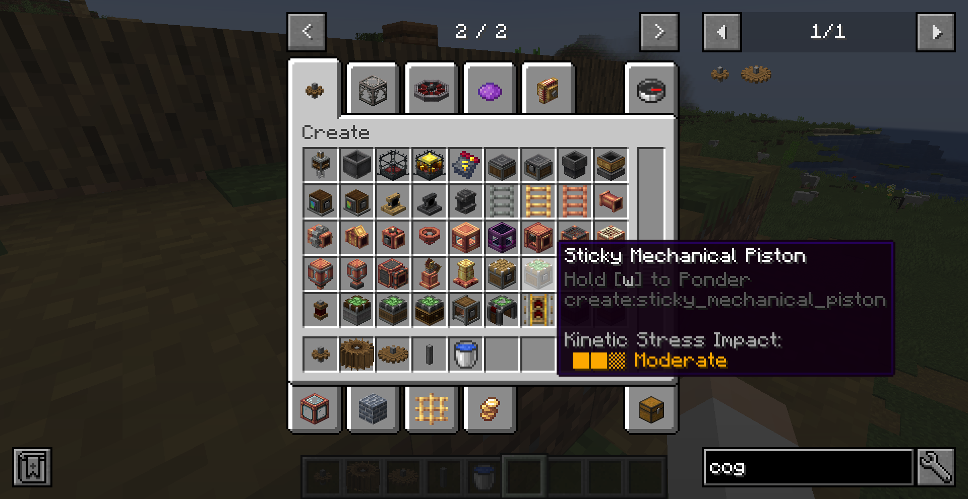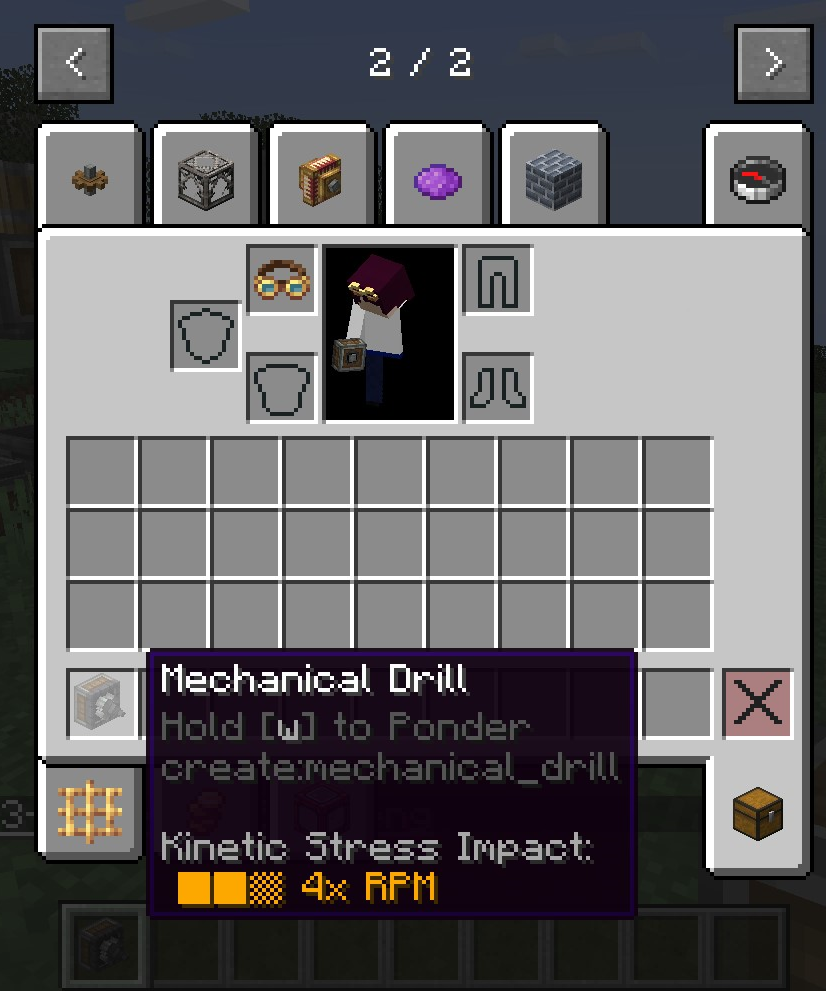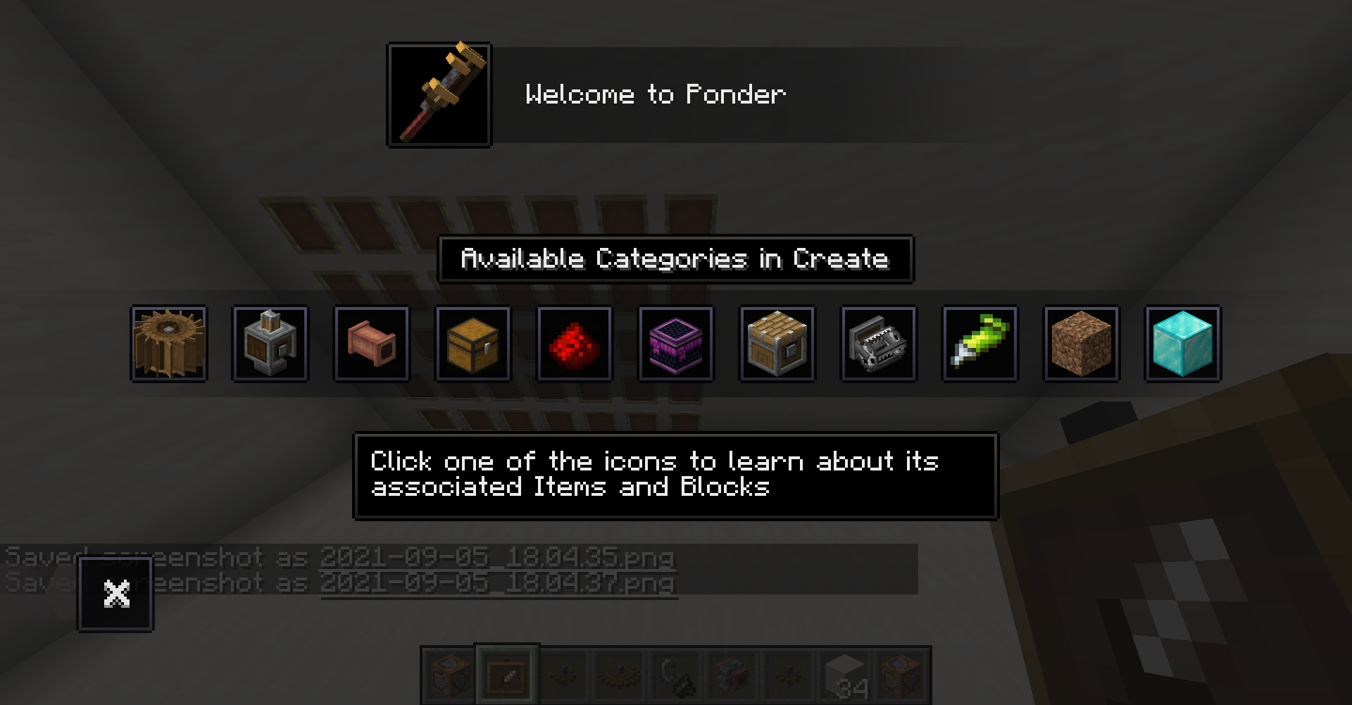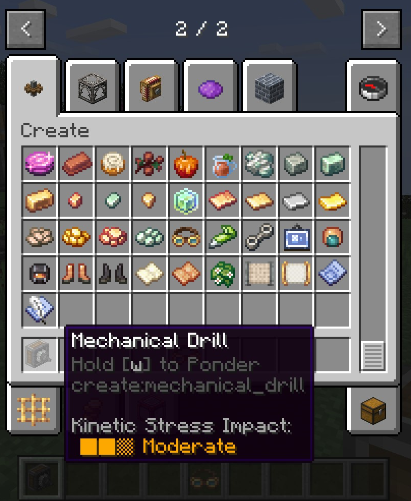 Create 0.3 버전의 큰 차이점 중 하나는 Ponder 기능입니다. 모드의 여러 기능을 직관적으로 설명해줍니다. 전반적인 설명을 보기 위해서는 게임 메뉴에서 왼쪽의 고글 모양을 클릭한 뒤, Ponder Index를 누르면 됩니다.