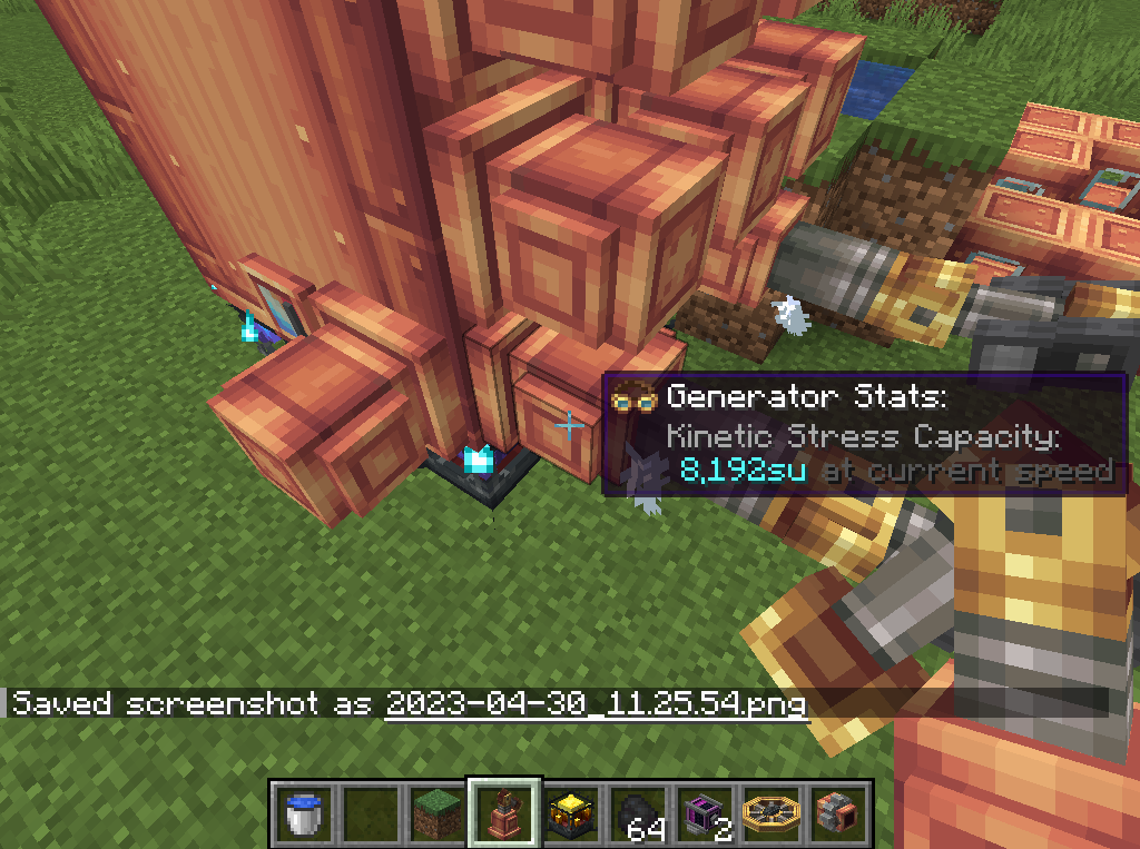 여담이지만 아래와 같이 구성하면 Deployer가 Crank를 돌려서 Stress Capacity가 256~512를 오가는 장치를 만들 수 있습니다. 전혀 쓸모없는 장치죠. 뒤에 있는 Water wheel이 없으면 (물론 아래에선 Water가 아닌 용암을 사용하긴 했지만) 충분한 속력을 내기 위한 Stress Capacity가 안 만들어져서 추가해야 합니다.