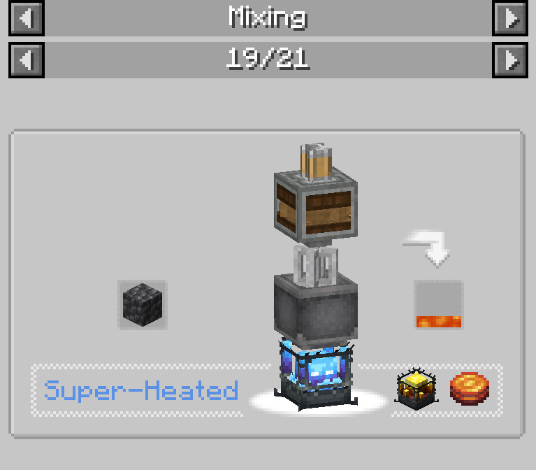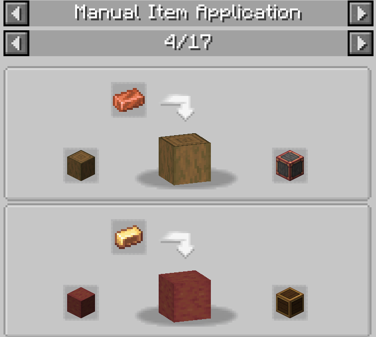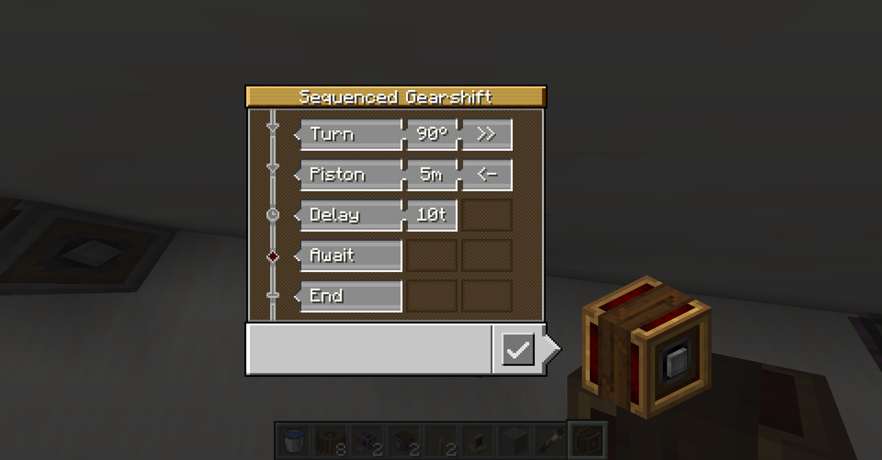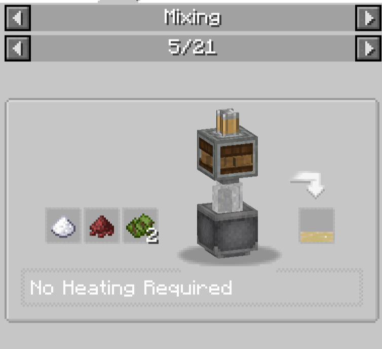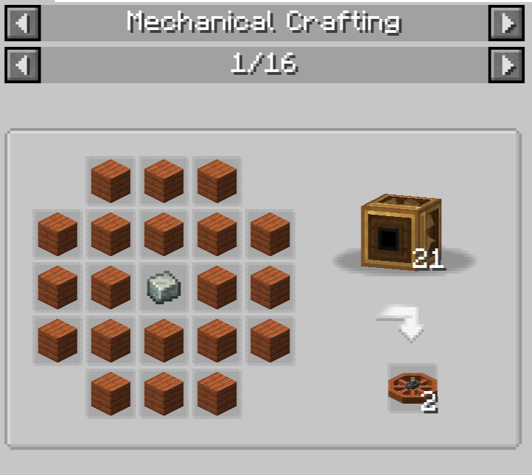 Rotational Speed Controller와 Sequenced Gearshift는 생김새에서 알 수 있듯 Brass Casing으로 만듭니다. Rotational Speed Controller는 임의의 회전 속도를 가진 동력원을 input으로 넣었을 때 설정한 회전 속도로 변환해 주는 장치입니다. Sequenced Gearshift는 Redstone pulse (버튼이 눌린다던지 하는 경우)가 주어질 때 설정된 대로 기어를 움직이도록 프로그래밍하는 장치입니다. 이에 대한 설명은 Ponder를 보면 잘 나와있으므로 여기에서는 생략하겠습니다.