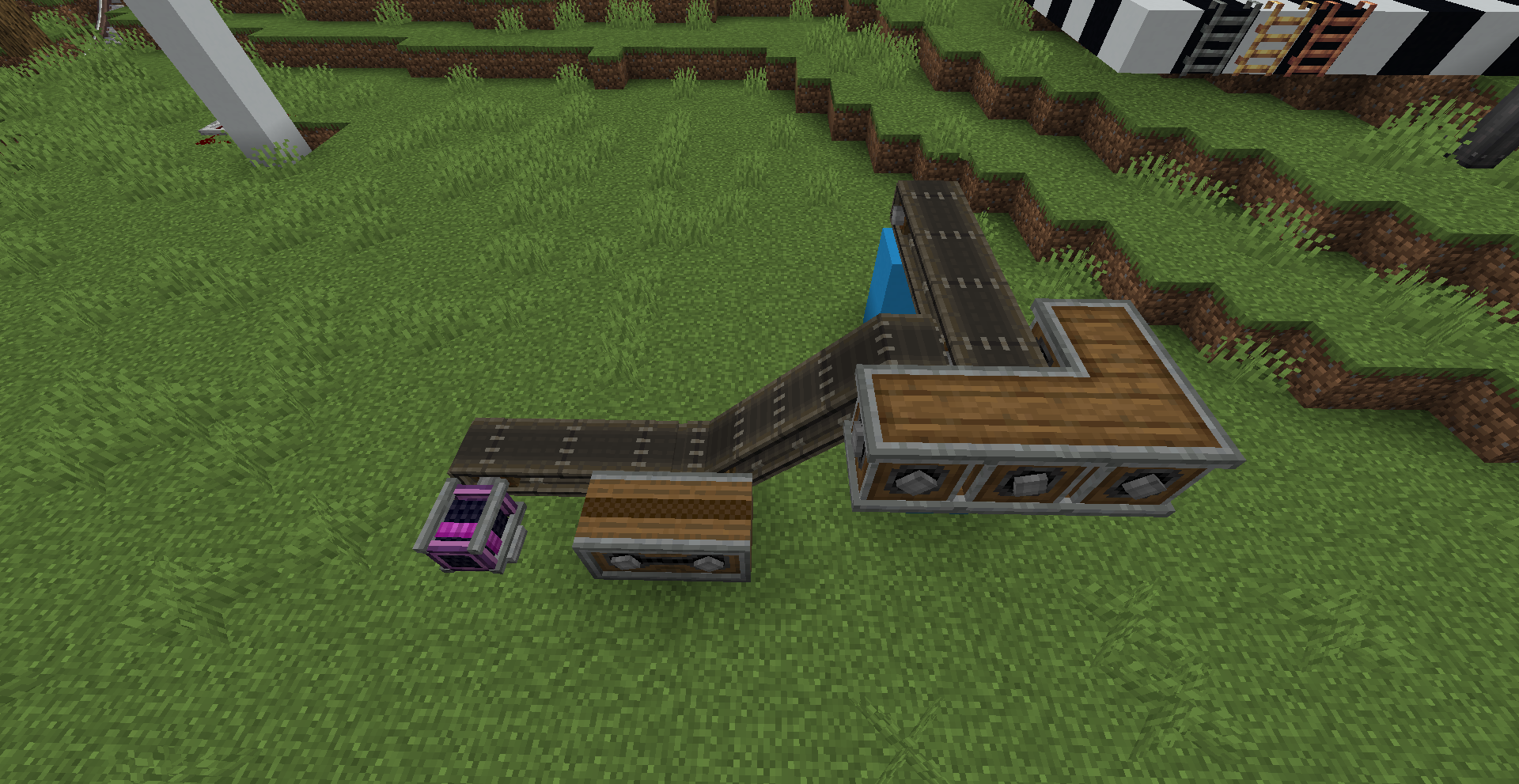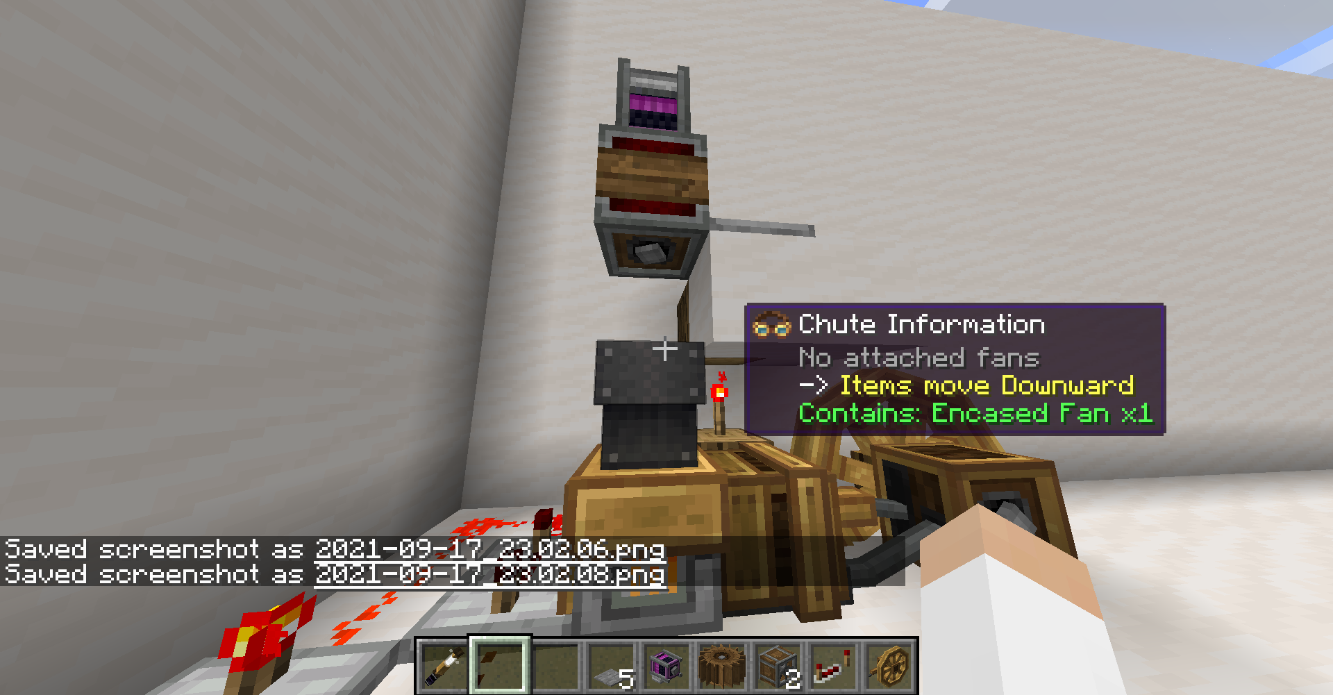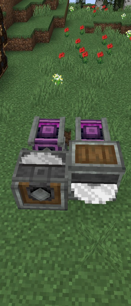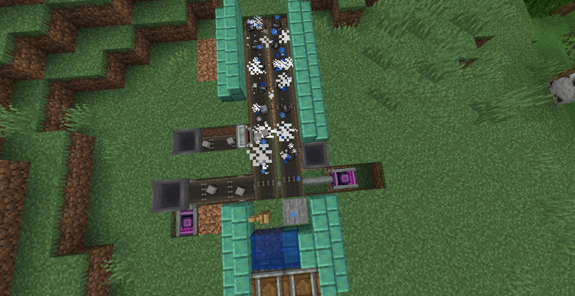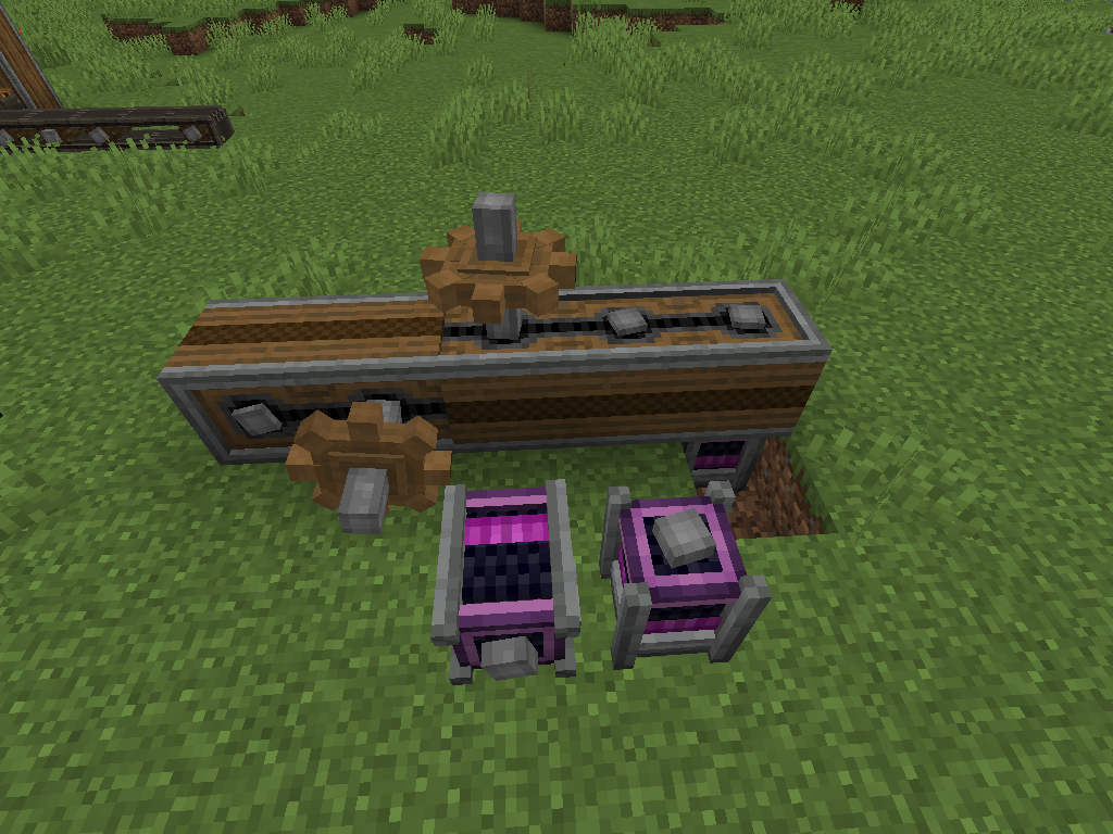 공장을 설계하면서 어떻게 Encased Fan을 설치하느냐가 굉장한 관건인데요, 개인적으로는 바람의 방향대로 벨트를 설치하여 가공하는 것을 추천드립니다. 이 경우 벨트 옆에서 Hopper(마인크래프트 기본 깔때기, 아이템 한 개씩 넣어줌) 또는 Funnel을 이용하거나 아니면 Belt로 아이템을 넣어주면 됩니다.