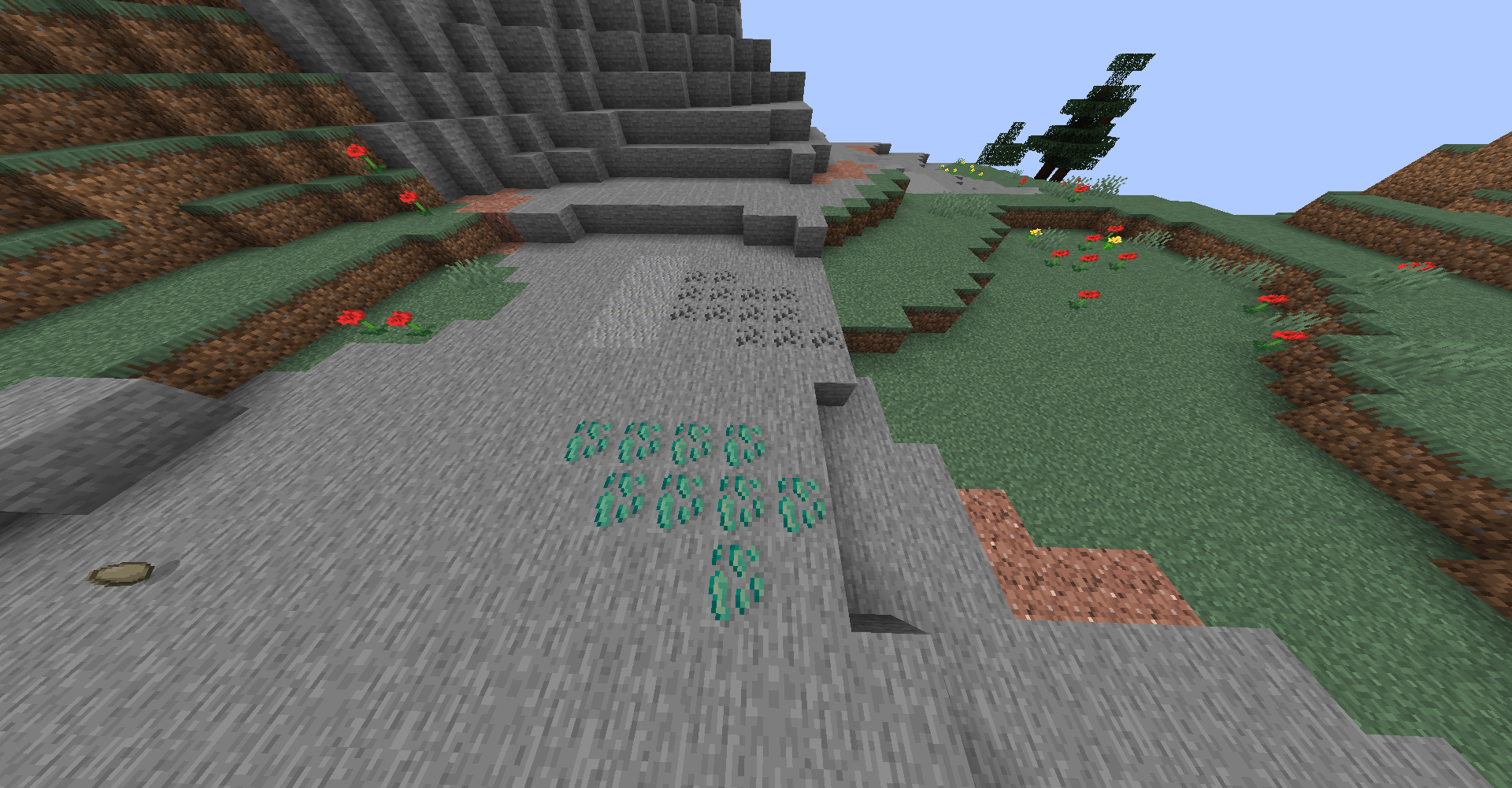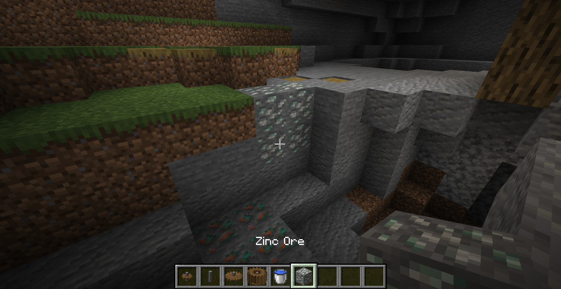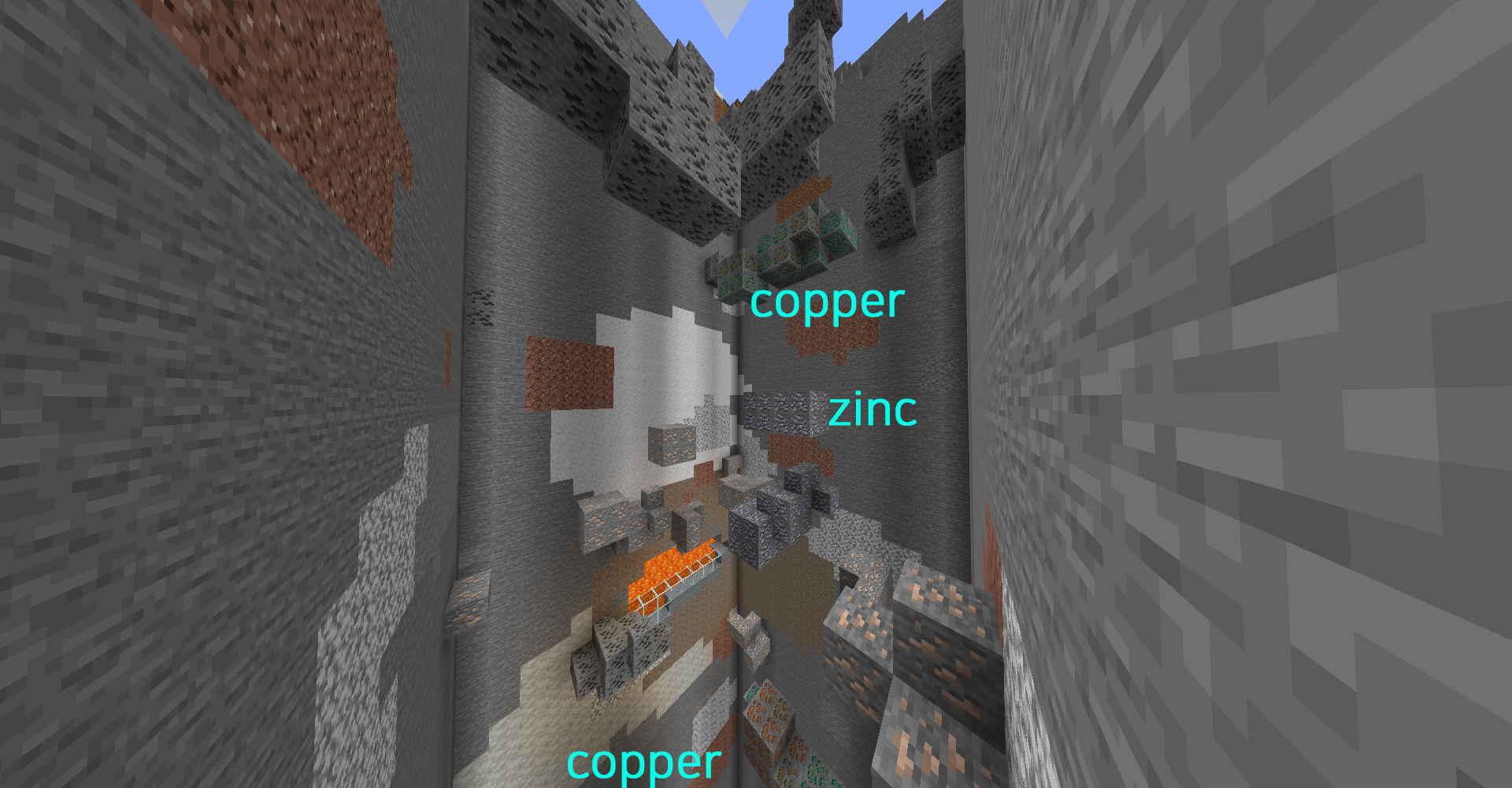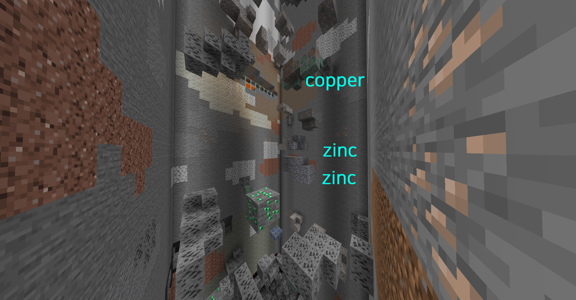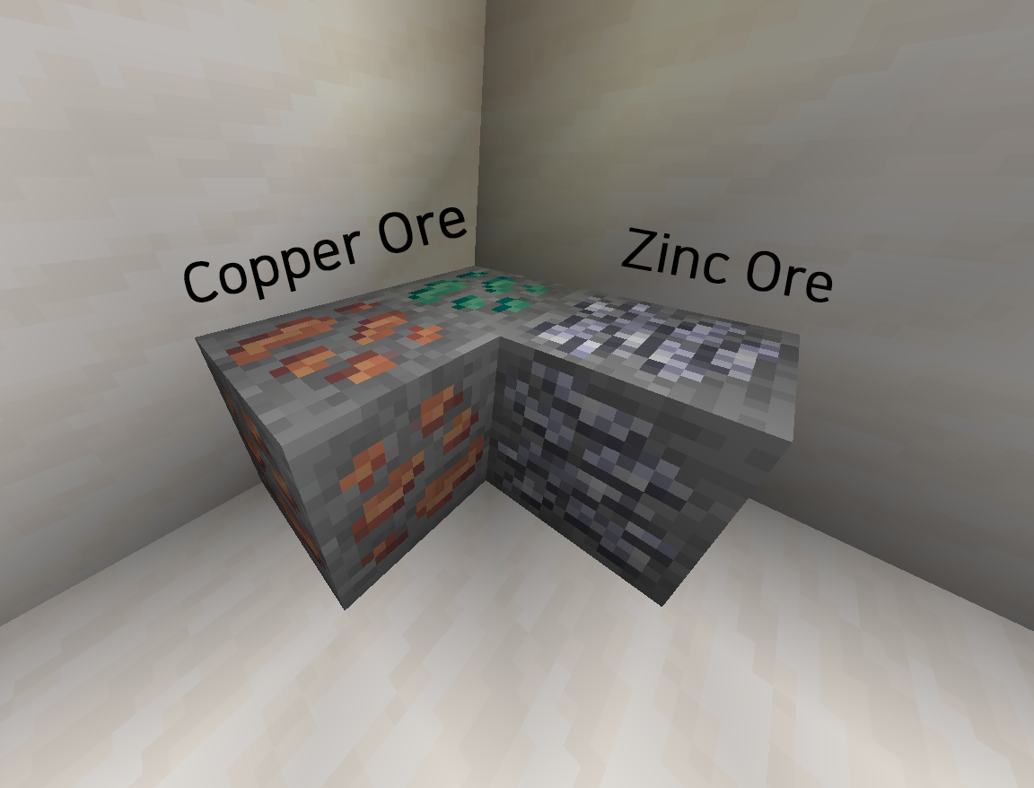 구리 광석(Copper Ore)의 경우 Mountain 지형의 지표에도 종종 노출되어 있지만, 아연 광석(Zinc Ore)의 경우 높은 지형에서 자주 발견되기는 하지만 (광석이 생성되는 위치가 대체로 높기 때문으로 바이옴과는 큰 관련이 없는 것으로 보입니다)