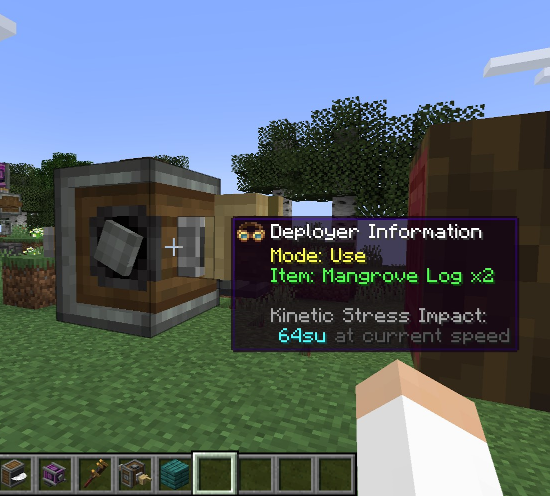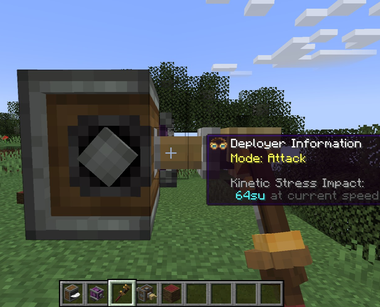 그전에 저번 글에서 wrench의 사용법을 제대로 설명드리지 못했는데요, 그냥 우클릭해서 회전, Shift + 우클릭하여 해당 Create 모드 블록을 철거, 세부 사항 설정이 가능한 장치의 경우 흰 테두리로 표시되는 박스에 마우스를 가져다 대고 스크롤하여 세부 장치를 변경하기도 하며, Deployer의 경우 우클릭하여 모드를 변경하기도 합니다.