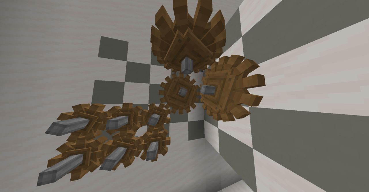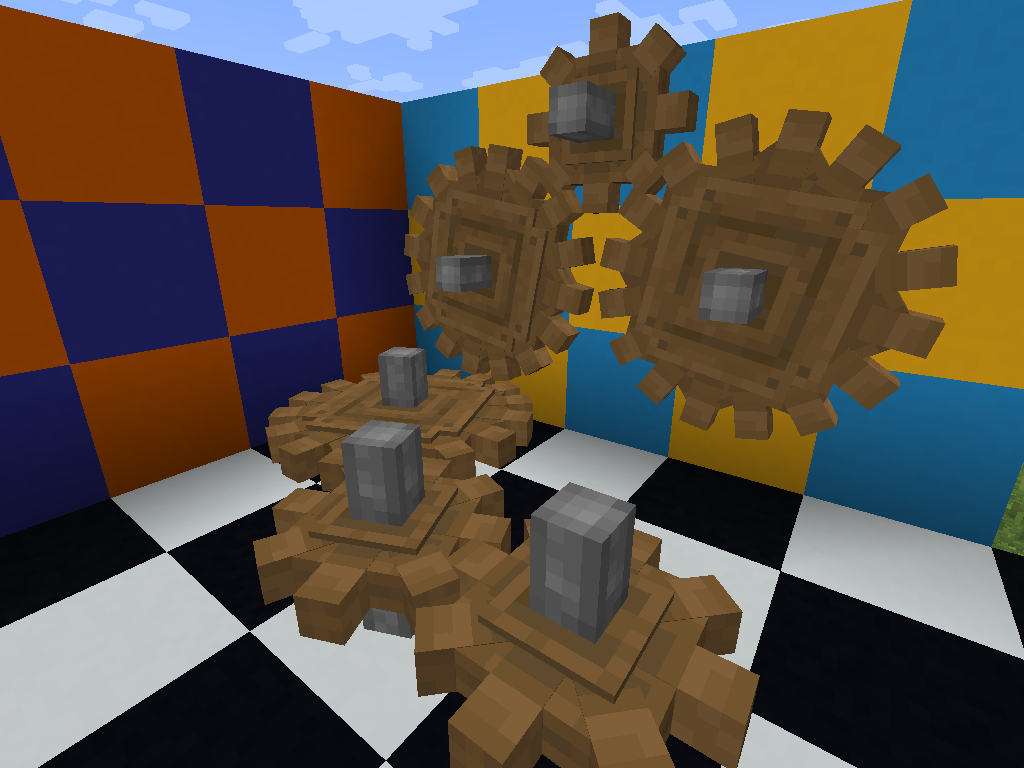 기어나 Shaft의 사용법은 생략하겠습니다. 참고로 Create 모드에서는 기존에 있던 Create 모드 블럭 옆에 또 다른 모드 블록을 설치하는 경우 두 장치가 연결되도록 방향을 자동으로 맞춰줍니다. 그게 의도한 바가 아니라면 렌치로 돌려주거나, 처음부터 설치할 때 Shift+우클릭으로 설치하시면 됩니다. 기어는 아래와 같은 방식으로 서로 연결해 볼 수 있습니다. 각 기어가 속도를 어떻게 변환하는지는 초등학교 때 배우므로 생략하겠습니다. (서로 맞물린 기어는 반대방향으로 돌아가고, 큰 기어와 작은 기어가 맞물리면 작은 기어의 회전 속력이 큰 기어의 2배로 돌아갑니다)