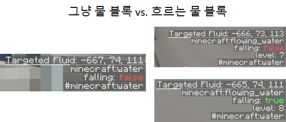 여기서 흐르는 물 블럭은 블럭 id가 flowing_water인 block 또는, 마그마블럭이나 영혼모래로 인해 거품이 위 혹은 아래로 생성되고 있는 블럭을 말합니다.