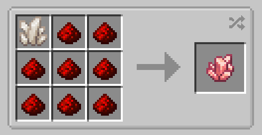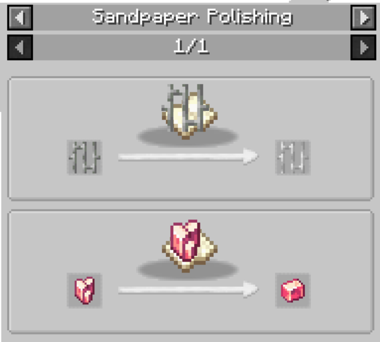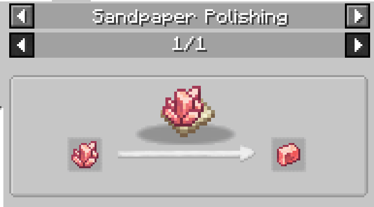 초반 기계 제작에 많이 사용되는 재료인 Polished Rose Quartz는 다음과 같이 레드스톤과 석영을 조합하여 만든 Rose Quartz를 Sandpaper(사포)를 가지고 Polishing(연마)해서 만듭니다. 이때 Sandpaper를 한 손에 들고 다른 손에 Rose Quartz를 들고 오른쪽 마우스 클릭을 꾹 하고 있으면 됩니다.