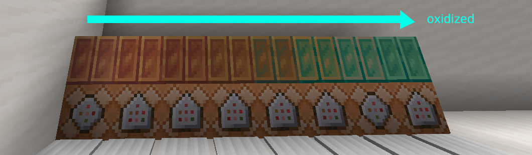 참고로 구리 블럭이나 구리 광석의 경우 별도의 처리가 있지 않는 한 다음과 같이 천천히 산화되게 됩니다.