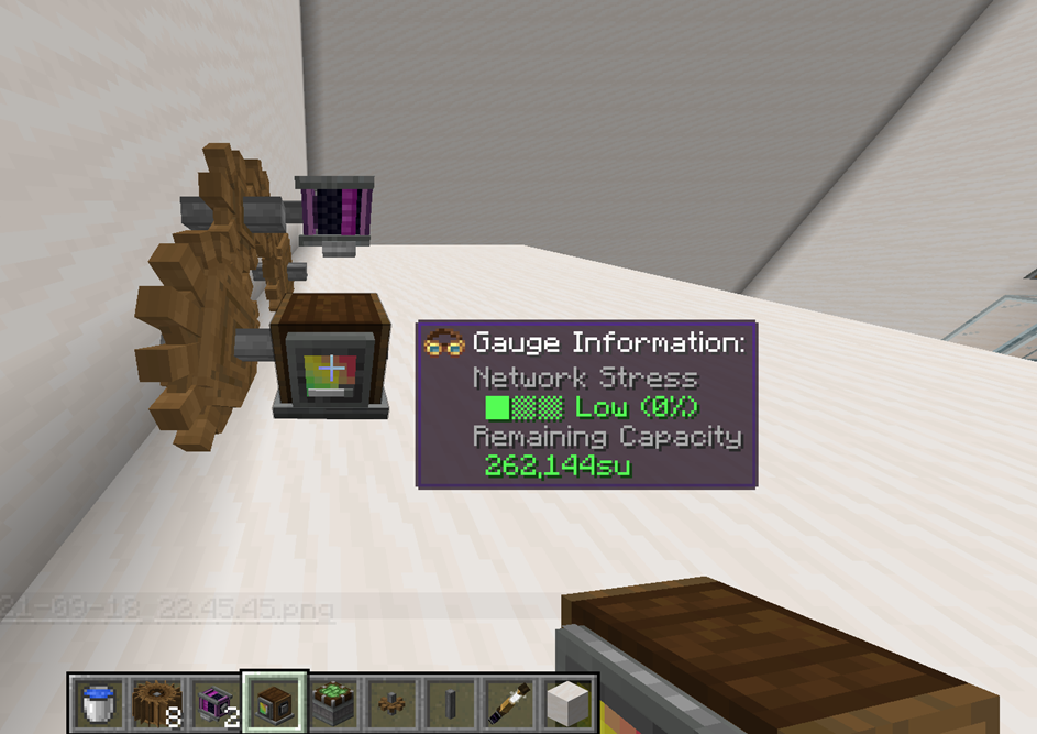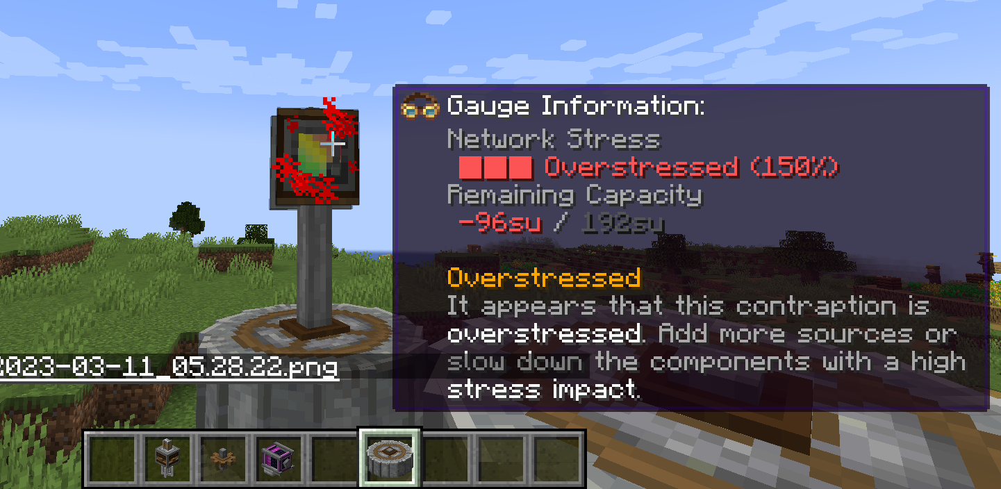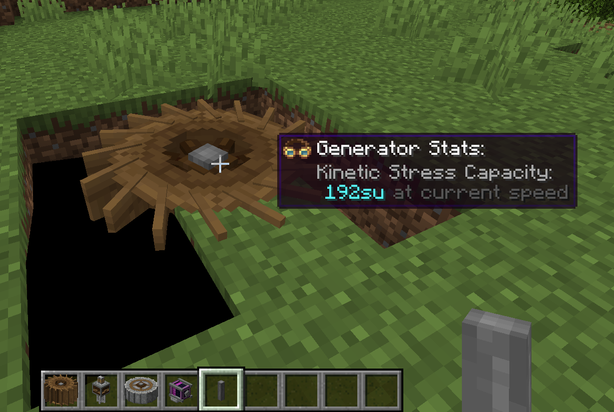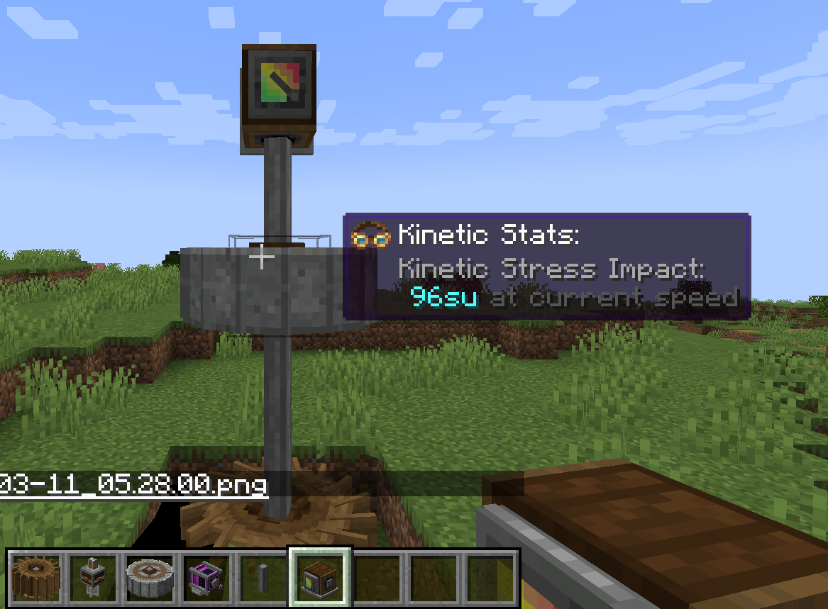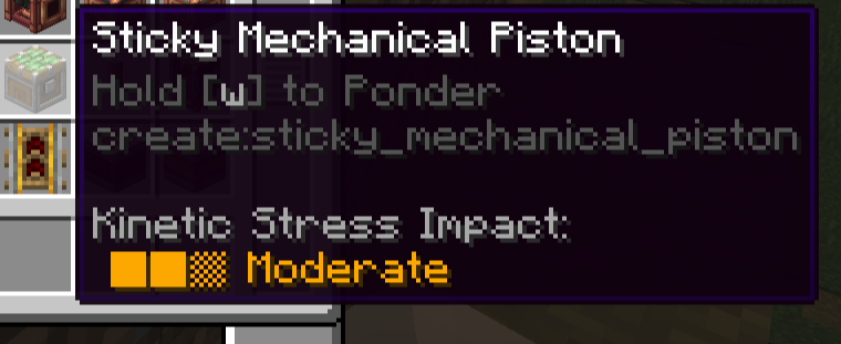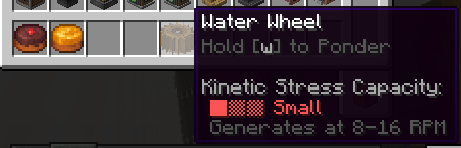 1 RPM(Rotation Per Minute)을 기준으로 Stress에 관한 값을 표시할 수 있습니다. 예를 들어 위키에도 나와 있듯이, 4 SU(Stress Unit)의 기준값을 가지는 동력원을 생각했을 때, 5 RPM으로 회전한다면 80 SU만큼의 Stress Capacity를 가지게 됩니다. Shaft와 Cogwheel (혹은 이와 비슷한 동력만 전달하는 장치들)은 따로 Stress Impact값이 없지만, 이들을 통해 회전 속도가 바뀐다면, 그만큼 다른 기계의 Stress값이 변하게 될 것입니다.