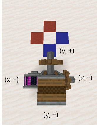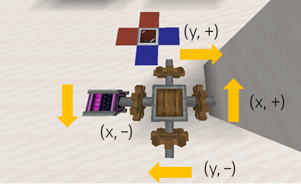 일반적으로 회전속도를 벡터로 나타낼 때, 벡터의 크기는 회전 속력으로 벡터의 방향은 회전하는 방향대로 오른손으로 감쌀 때 엄지가 가리키는 방향으로 설정합니다. 마인크래프트에 x, y, z 좌표가 있는 것은 잘 아실 텐데요, xyz가 증가하는 방향으로 회전속도 벡터가 향하는 경우 (+), 반대의 경우 (–) 방향이라고 해봅시다. Encased Chain Drive는 (+) 방향 회전은 (+) 방향으로 전달합니다. (–) 방향도 마찬가지겠죠.