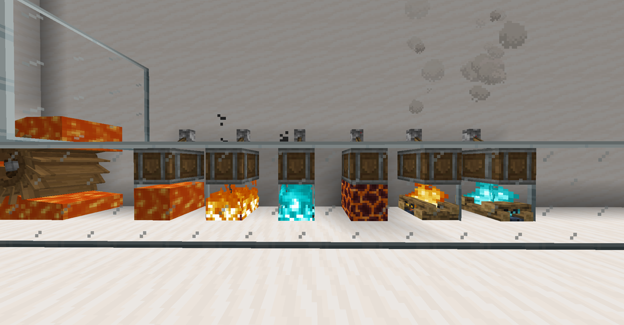 이때 열 공급 레벨은 보일러에 공급된 열원이 제공하는 열의 총합으로 결정되며, 모닥불과 꺼져있는 블레이즈 버너의 경우 0 (Passive), 1단계로 켜진 블레이즈 버너는 개당 1, 2단계로 켜진 버너는 개당 2만큼의 열을 제공합니다. 보일러 사이즈가 최대 3x3xN까지 가능하므로, 블레이즈 버너 9개로 최대 18 레벨이 가능합니다. 열이 공급되지 않으면 -1 값을 가져서 꺼지게 됩니다. 0인 경우 Passive Mode로 작동되는 데, 여기에 대해서는 efficiency값을 다루며 설명하겠습니다. 0이라는 값에서 알 수 있듯, 모닥불은 한 개 이상 설치하더라도 한 개 설치한 것과 동일한 효과를 냅니다.